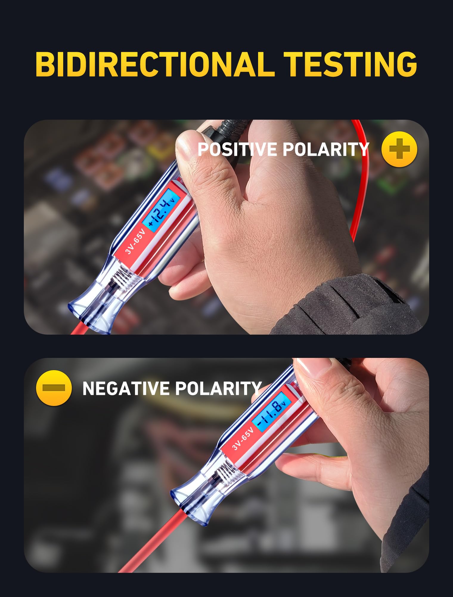 【Quality Made Tester Body】Professional automotive circuit tester with premium acetate fiber body, allows for more toughness and durability. Sharp stainless steel probe for piercing wires effortlessly, also for hard to reach tight areas. Along with insulation protective rubber tip to against electric shock.