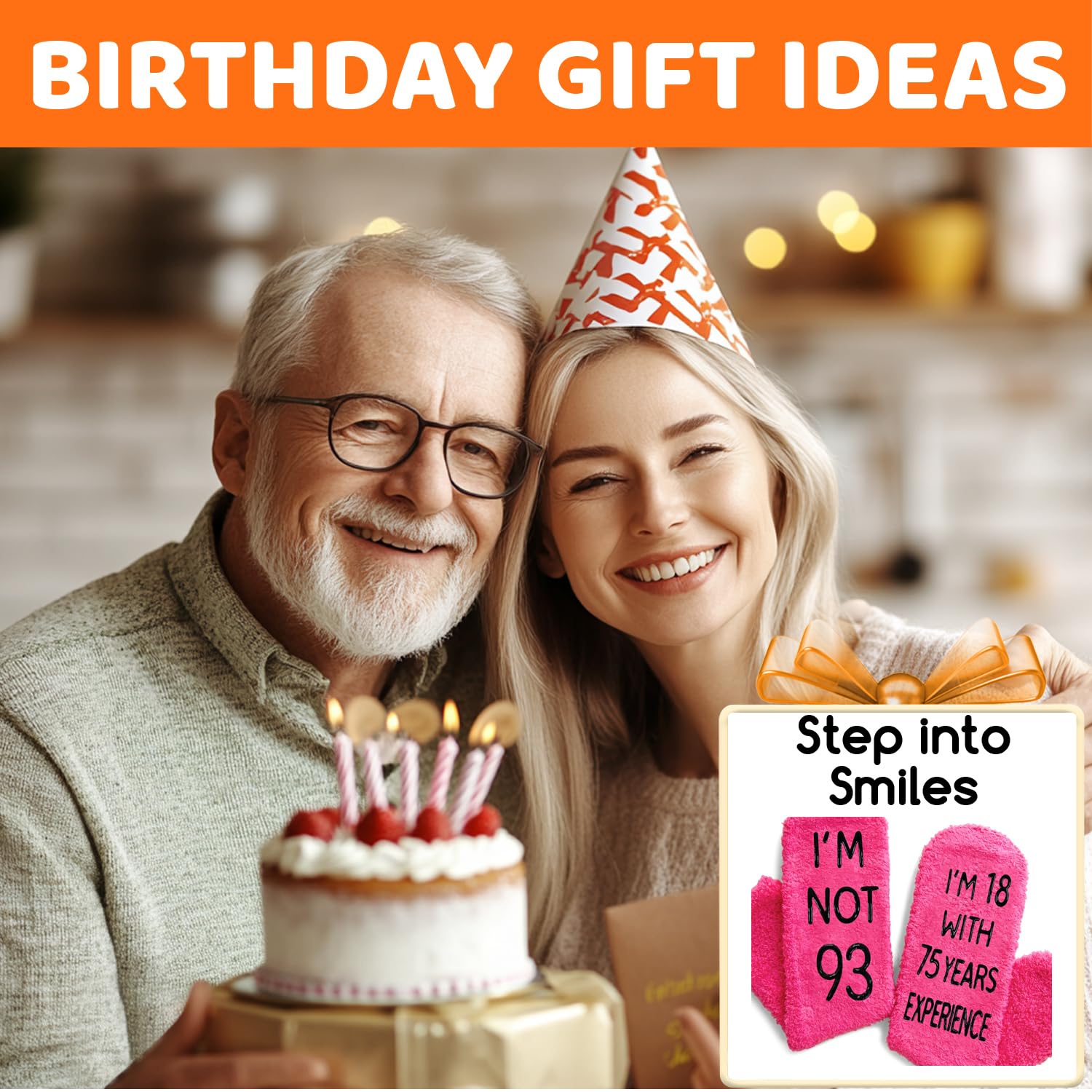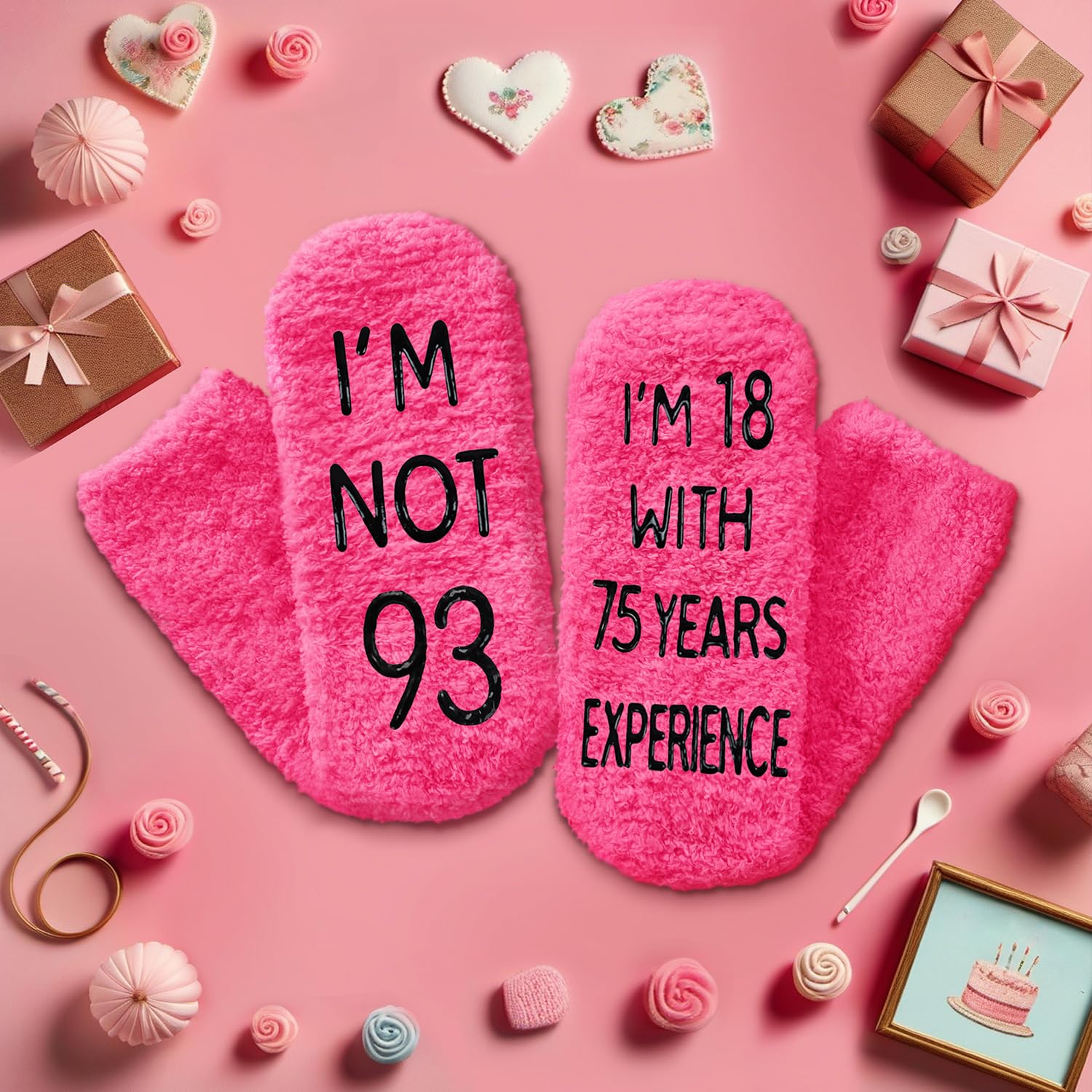 GIFTS FOR WOMEN IN THEIR 93S: Say it with socks - "I'M NOT 93, I'M 18 WITH 75 YEARS EXPERIENCE." These are suitable for elderly senior citizens, and older people.