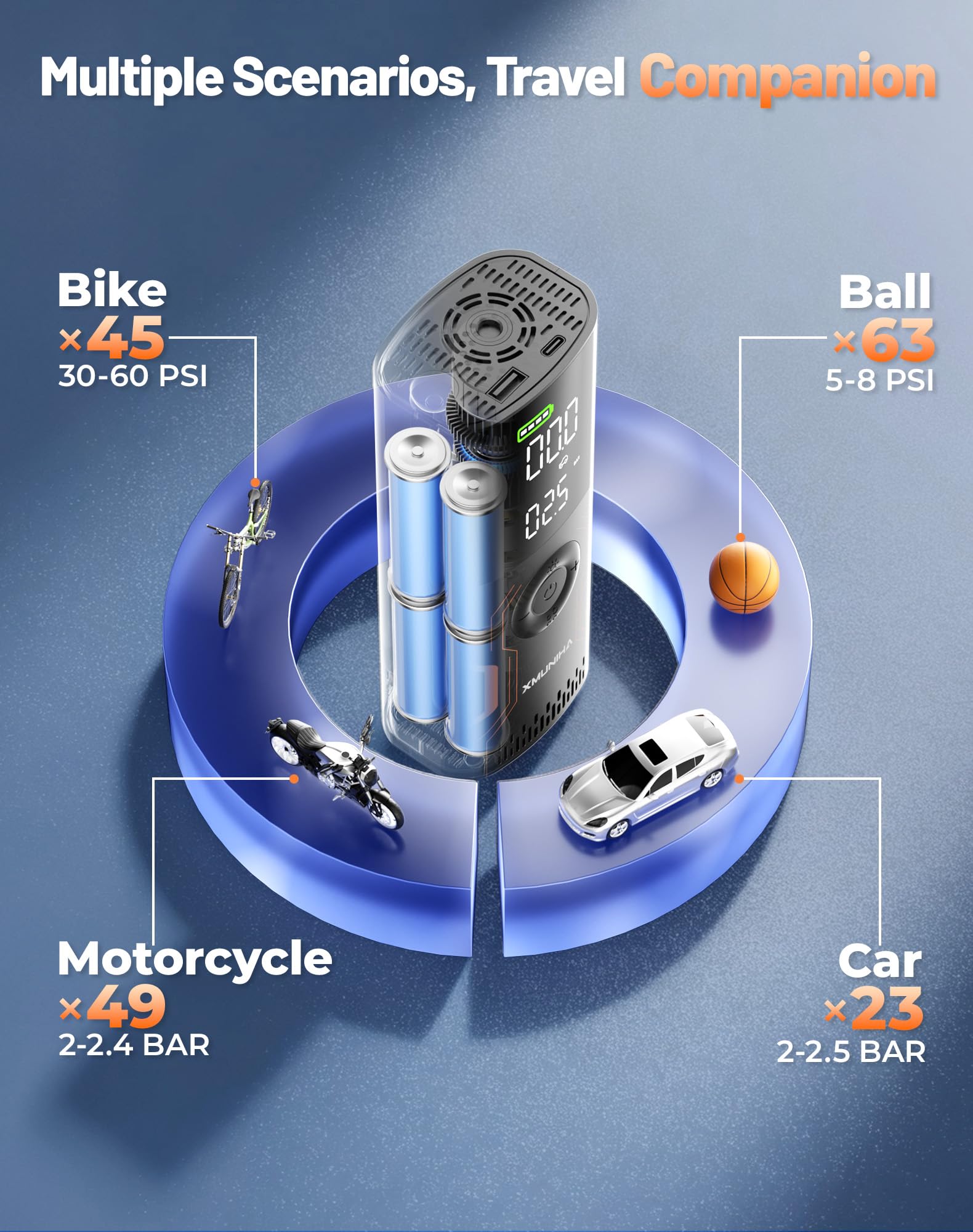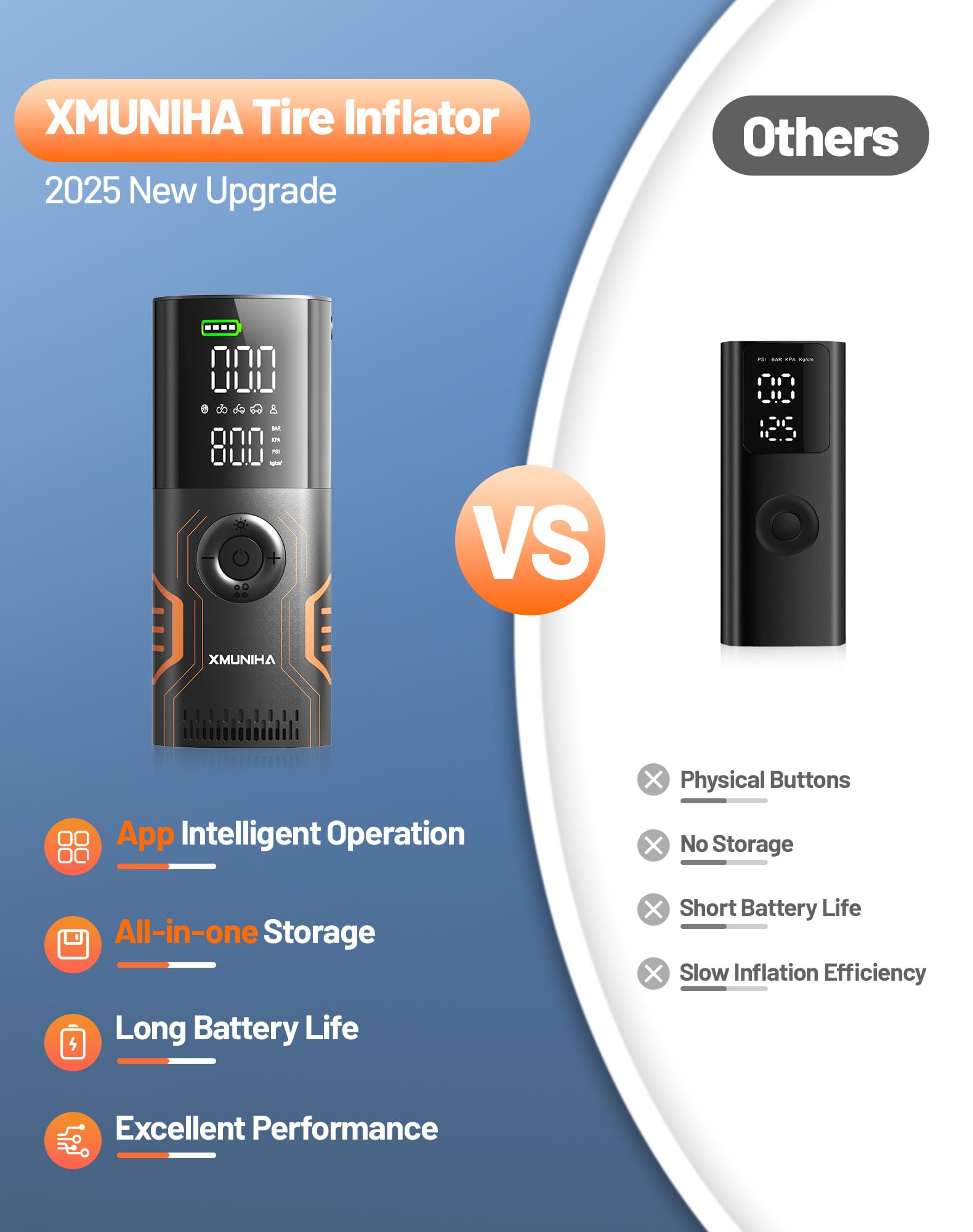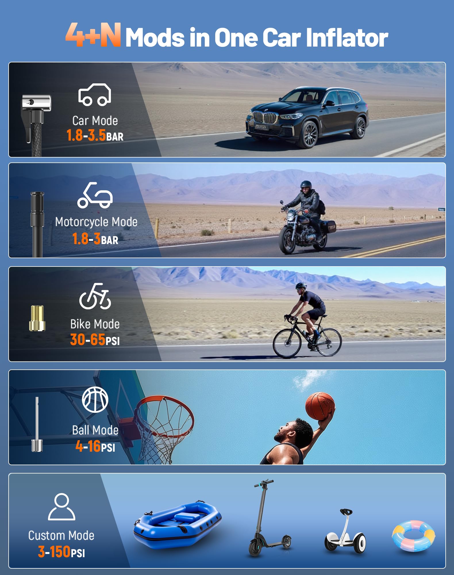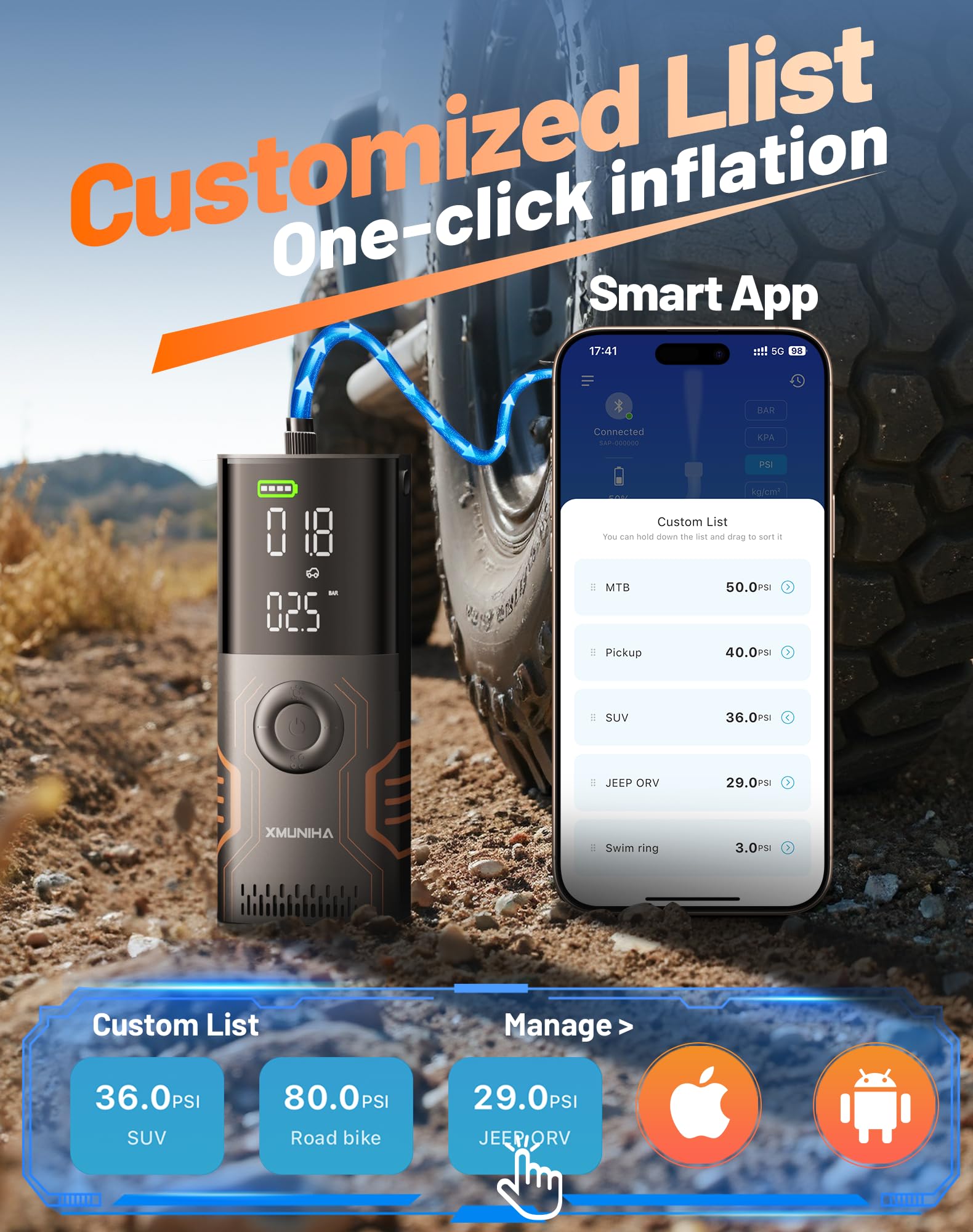 Newest APP Smart Function: This tire pump supports APP remote control and has 4+N custom smart modes. The tire pump has been configured with four modes: bicycle, motorcycle, car and ball. It also supports APP custom swimming ring, SUV tire, small pickup and other preset modes to meet different usage scenarios. Built-in automatic shutdown function to avoid over-inflation, which is friendly to novice users