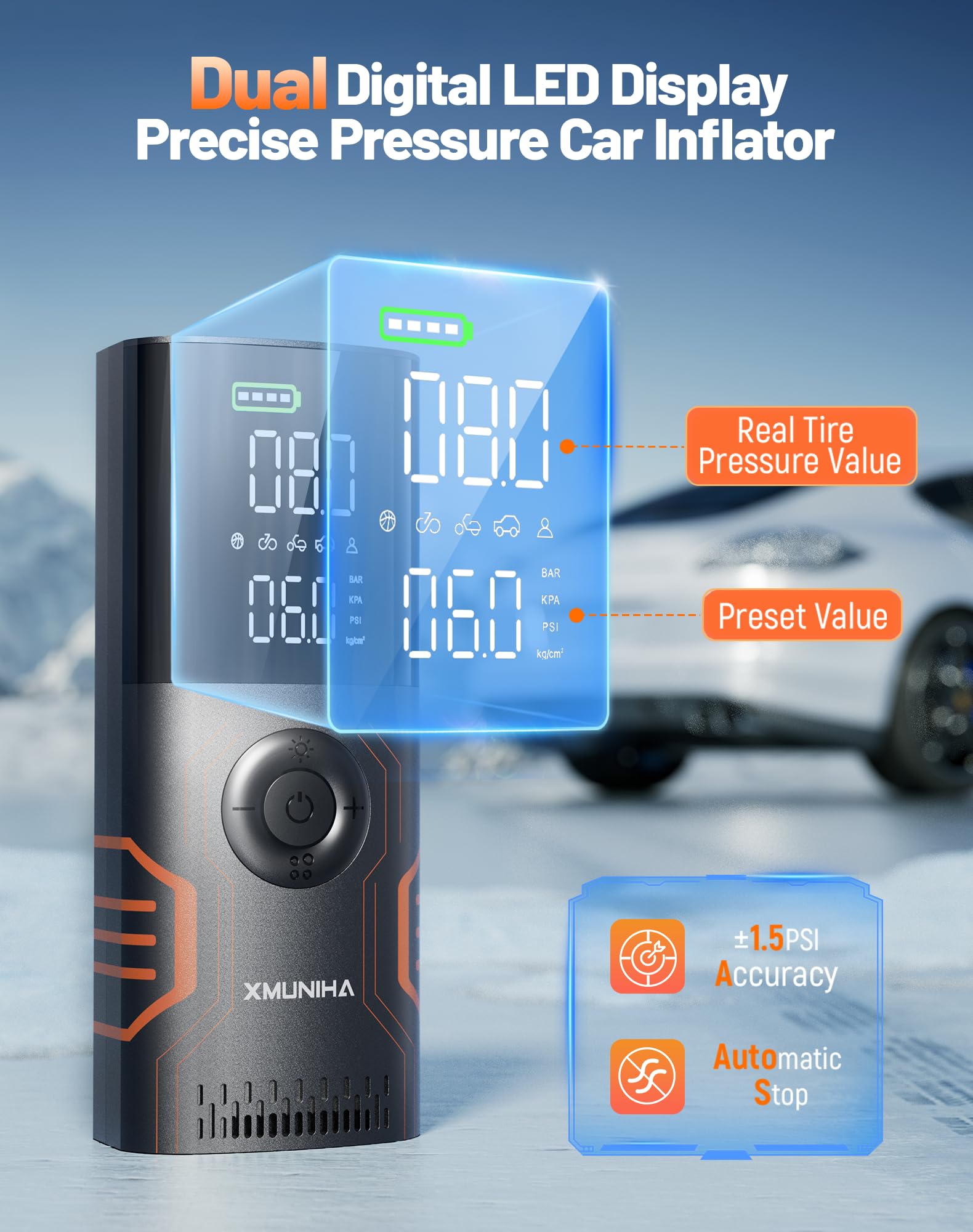 User-Friendly: This portable tire pump for car is equipped with an LED digital smart display, which makes it easy to view the real-time pressure and preset values even under bright sunlight. It supports one-touch switching of 4 pressure units (PSI, KPA, BAR and KG/CM²), and the pressure range can be adjusted between 30-150PSI to meet different usage scenarios, which makes this car tire pump an ideal companion for daily life