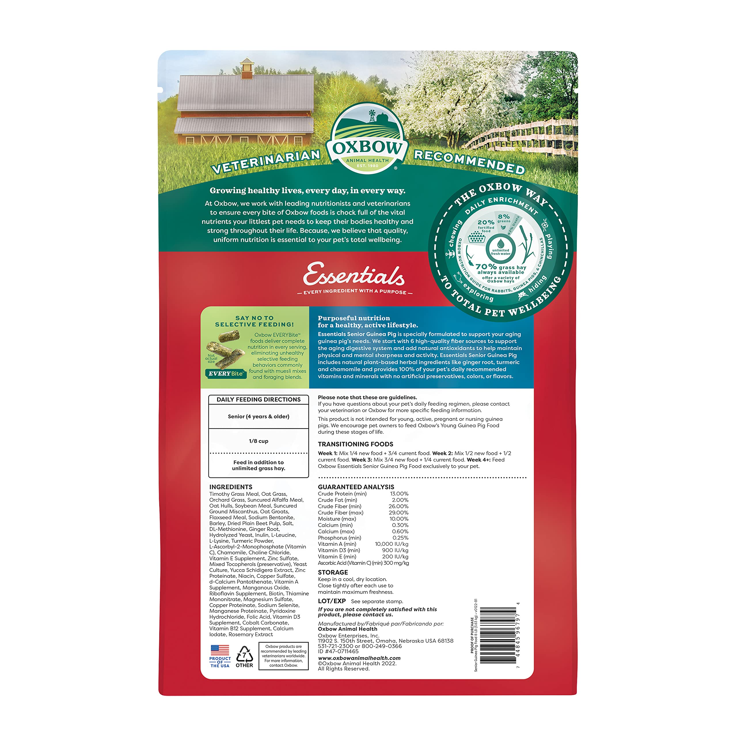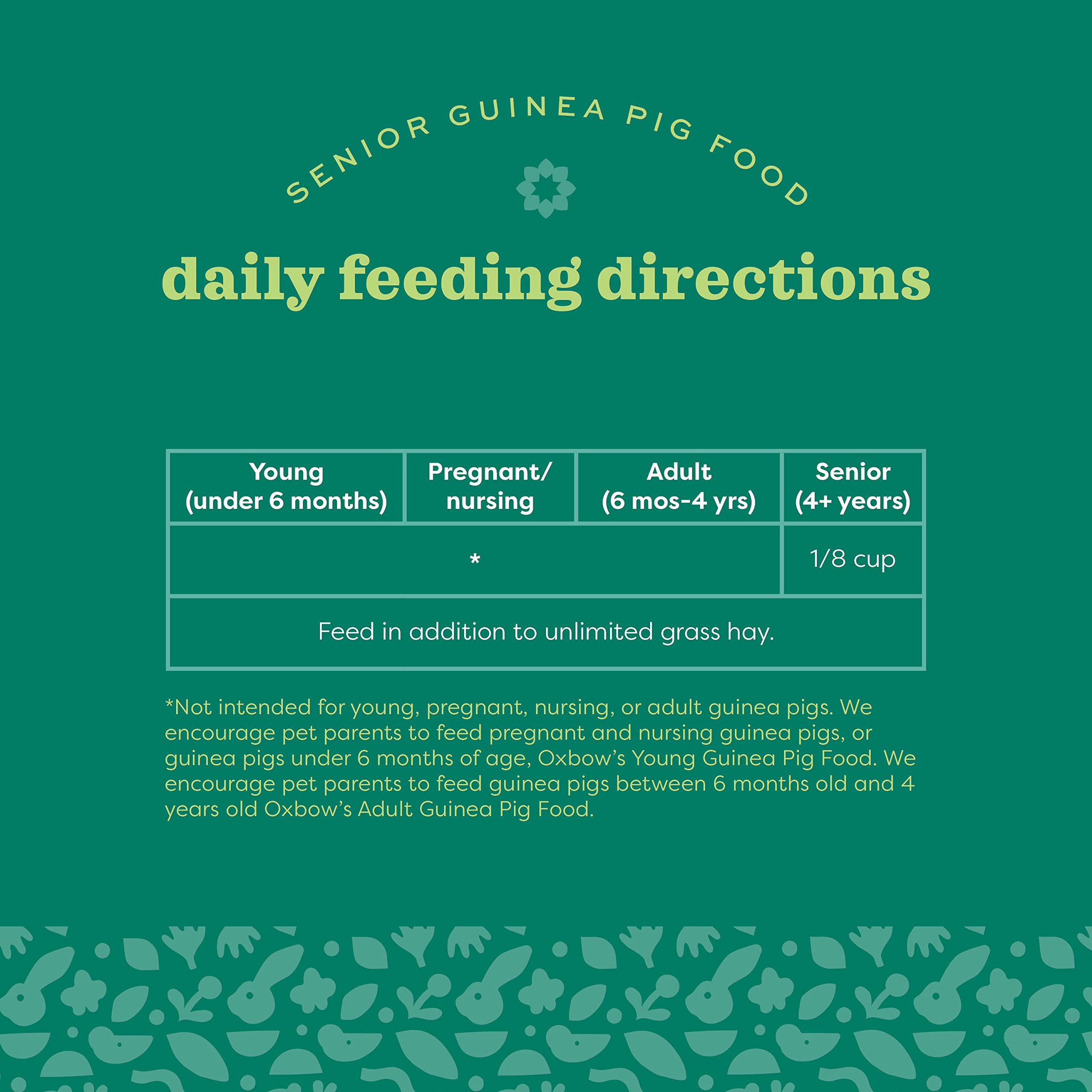 Oxbow Essentials Senior Guinea Pig Food is a veterinary-formulated, high-fiber pellet diet formulated specifically for guinea pigs aged 4 years and older. This premium blend delivers six sources of fiber—including timothy grass, oat grass, orchard grass, and alfalfa—to support robust digestion and maintain healthy body condition in older cavies. Our formula combines natural antioxidants like ginger root, turmeric, and chamomile, helping to preserve both physical activity and cognitive sharpness as your pig ages. It also supplies 100% of daily recommended vitamins and minerals, including Vitamin C—an essential nutrient guinea pigs cannot produce on their own. Crafted without artificial preservatives, colors, or flavors, and proudly made in the USA, these uniformly pelleted nuggets promote balanced feeding habits and minimize selective eating—ensuring consistent nutrient intake. Rich in plant-based antioxidants and essential nutrients, this senior cavy pellet supports immune strength, gut health, and smooth coat condition. Ideal for senior guinea pigs with slowing metabolism or changing appetites, this formula nurtures overall wellness while helping maintain healthy energy levels and weight. Choose Oxbow Essentials Senior Guinea Pig Food to deliver thoughtful, age-specific nutrition—veterinarian-approved, complete, and loyal to your aging pet's needs. This premium guinea pig food is specially designed for older pets, offering a complete daily diet that balances high fiber, vitamins, and minerals in every pellet. Unlike seed mixes or generic small pet blends, Oxbow delivers targeted nutrition with Vitamin C guinea pig food pellets to support immune health and vitality. Perfect for senior cavies, this natural guinea pig food promotes digestive wellness, healthy weight, and a shiny coat while avoiding artificial colors, flavors, or preservatives. Proudly made in the USA, it’s trusted by veterinarians and pet parents as the top choice for high-quality guinea pig pellets.