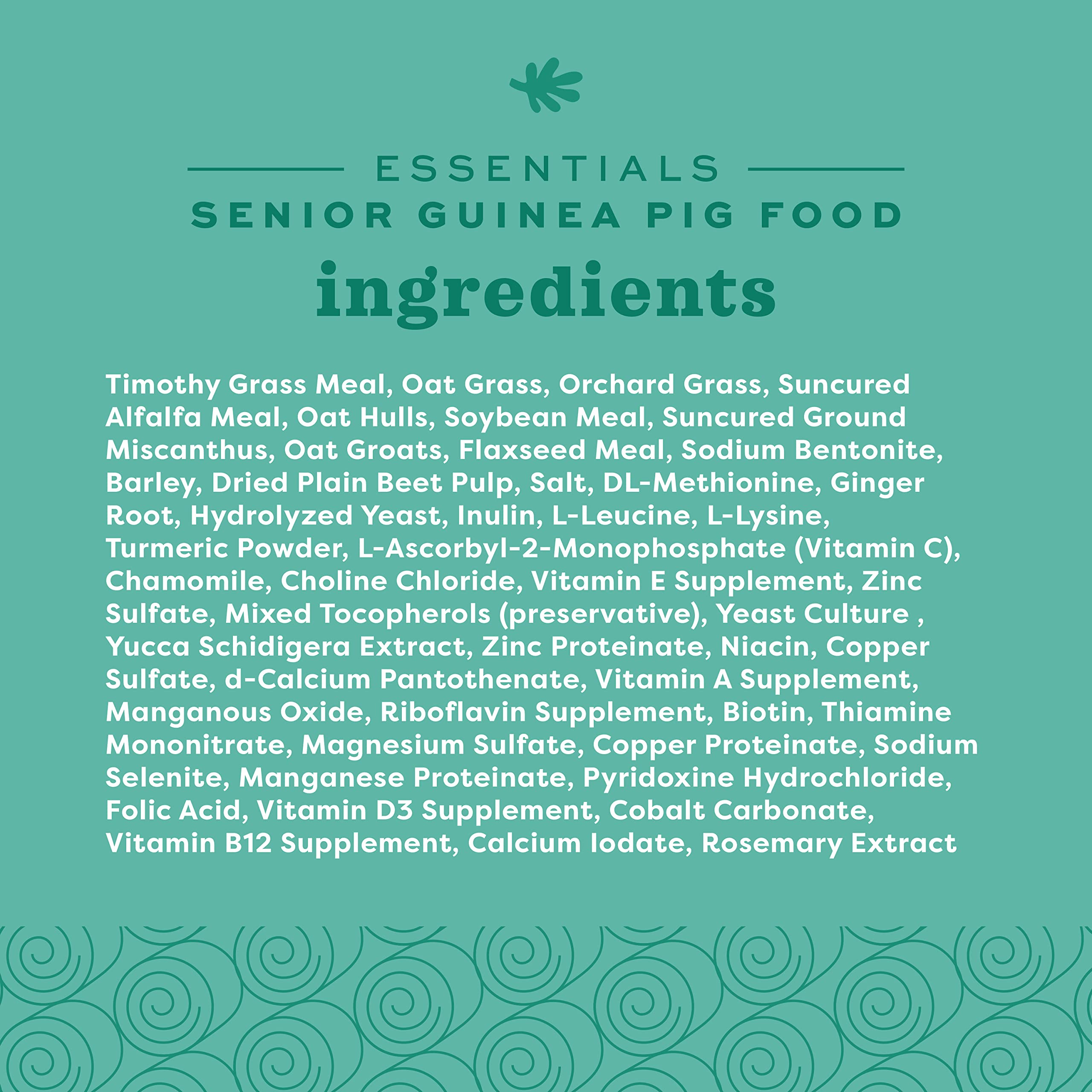 VET-FORMULATED: Oxbow Senior Guinea Pig is formulated with the guidance of leading vets and made with wholesome ingredients right here in the USA; Our trusted senior guinea pig diet provides balanced nutrition and consistency for older pets