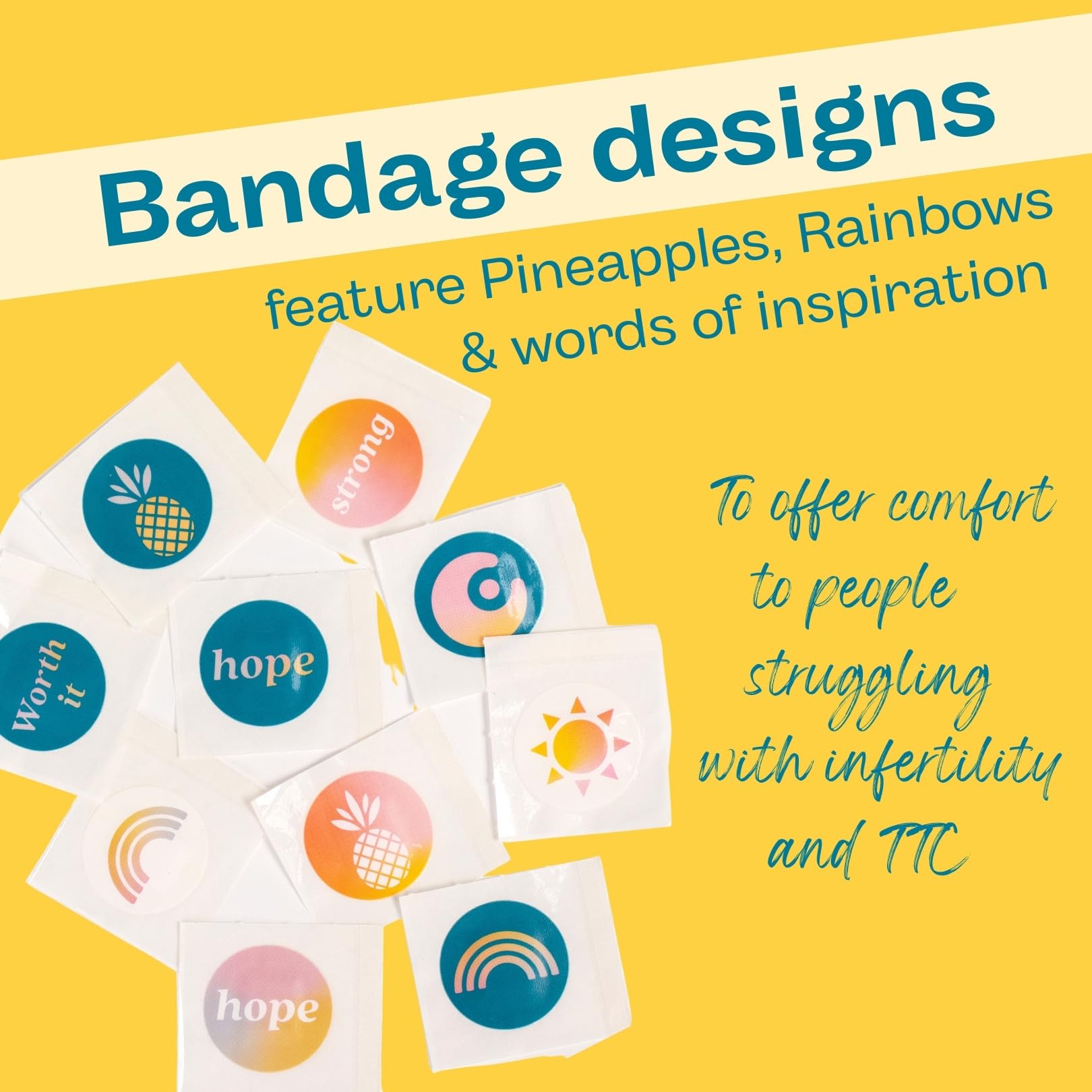 IVF bandaid designs feature pineapple bandaids, rainbows, and words of inspiration for those TTC