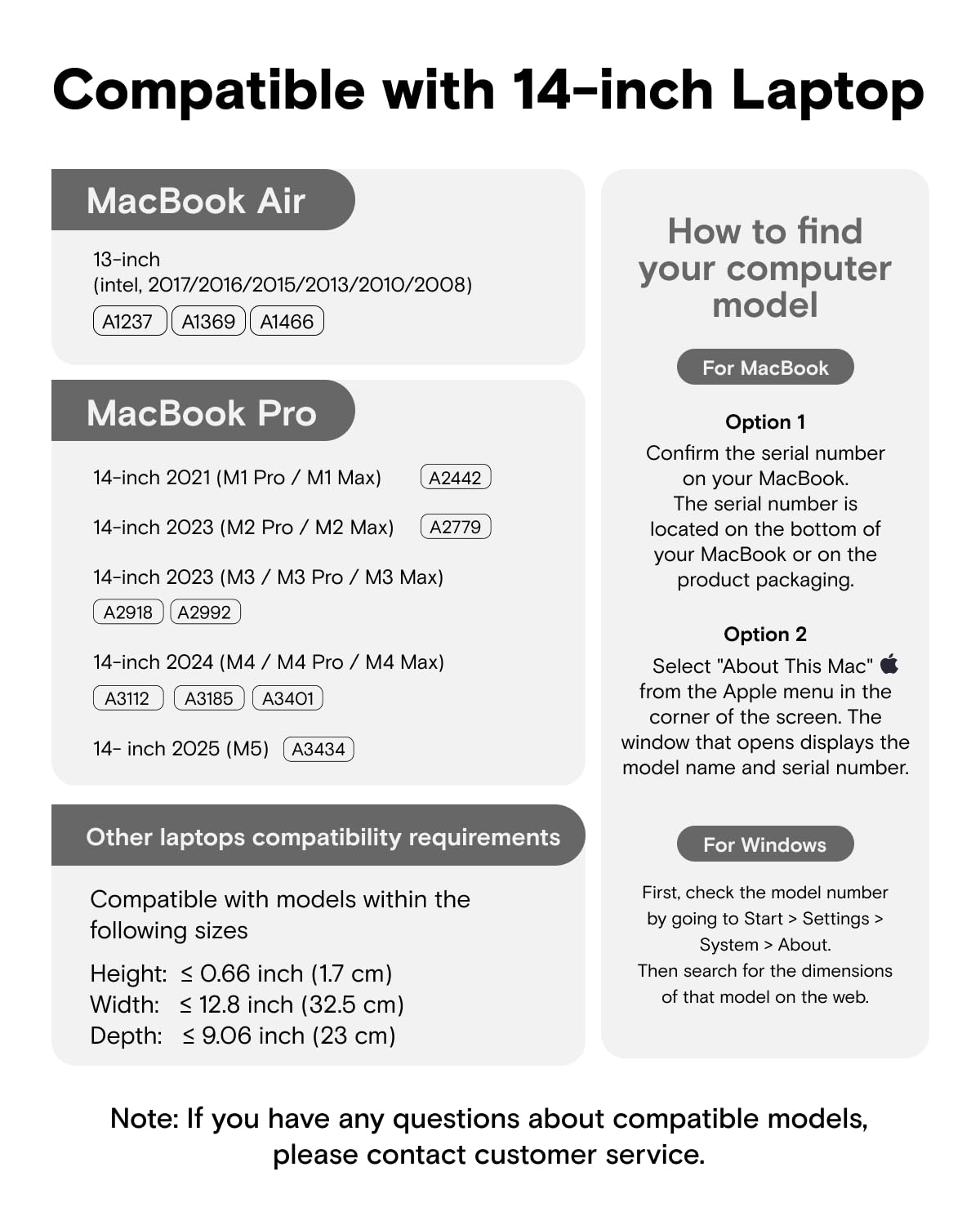 Compatibility: Designed for 14-inch laptops. Laptop sleeve dimensions: 13.4 x 9.6 inch, Maximum compatible size: 12.8x 9.1 x 0.7 inch. Laptop sleeve Precisely fits MacBook Pro 14-in.(M5 2025), MacBook Pro 14-in.(M4/M4 Pro/M4 Max 2024), MacBook Pro 14-in.(M3/M3 Pro/M3 Max, 2023 ), MacBook Pro 14-in.(M1 Pro/M1 Max, 2023), MacBook Pro 14-in.(M1 Pro/M1 Max, 2021), MacBook Air (intel, 2017/2020), MacBook Air (intel, 2017/2020)