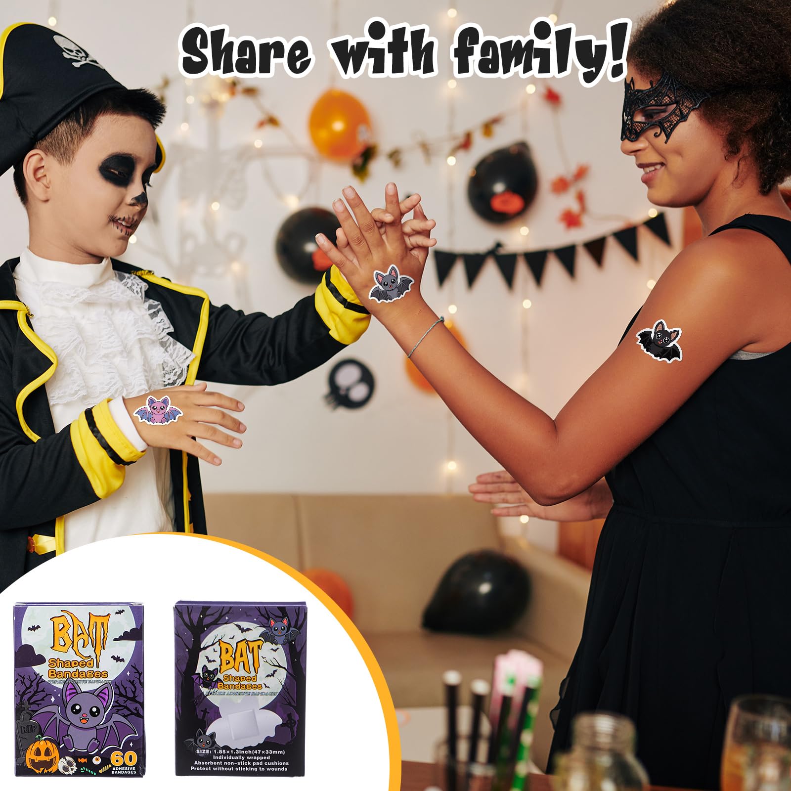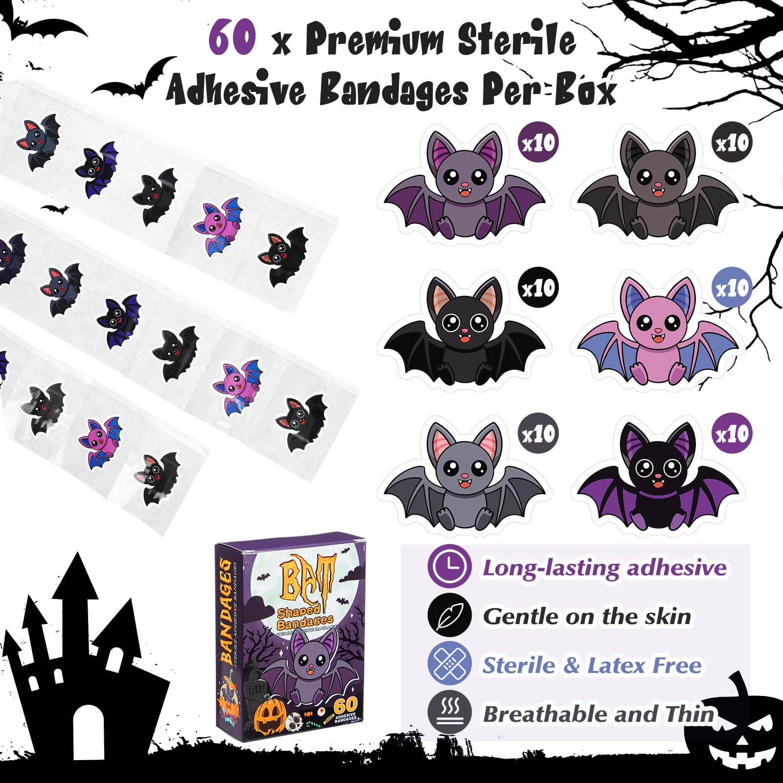 Halloween Bat Bandage: 60 pieces fun Halloween bat bandage features 6 different bat patterns; The fun bandages can bring smiles to children's faces while protecting wounds such as cuts, abrasions and burns; Adhesive bandages are suitable for both children and adults, school nurses, pediatricians, and are also a decent choice as a Halloween gift for children