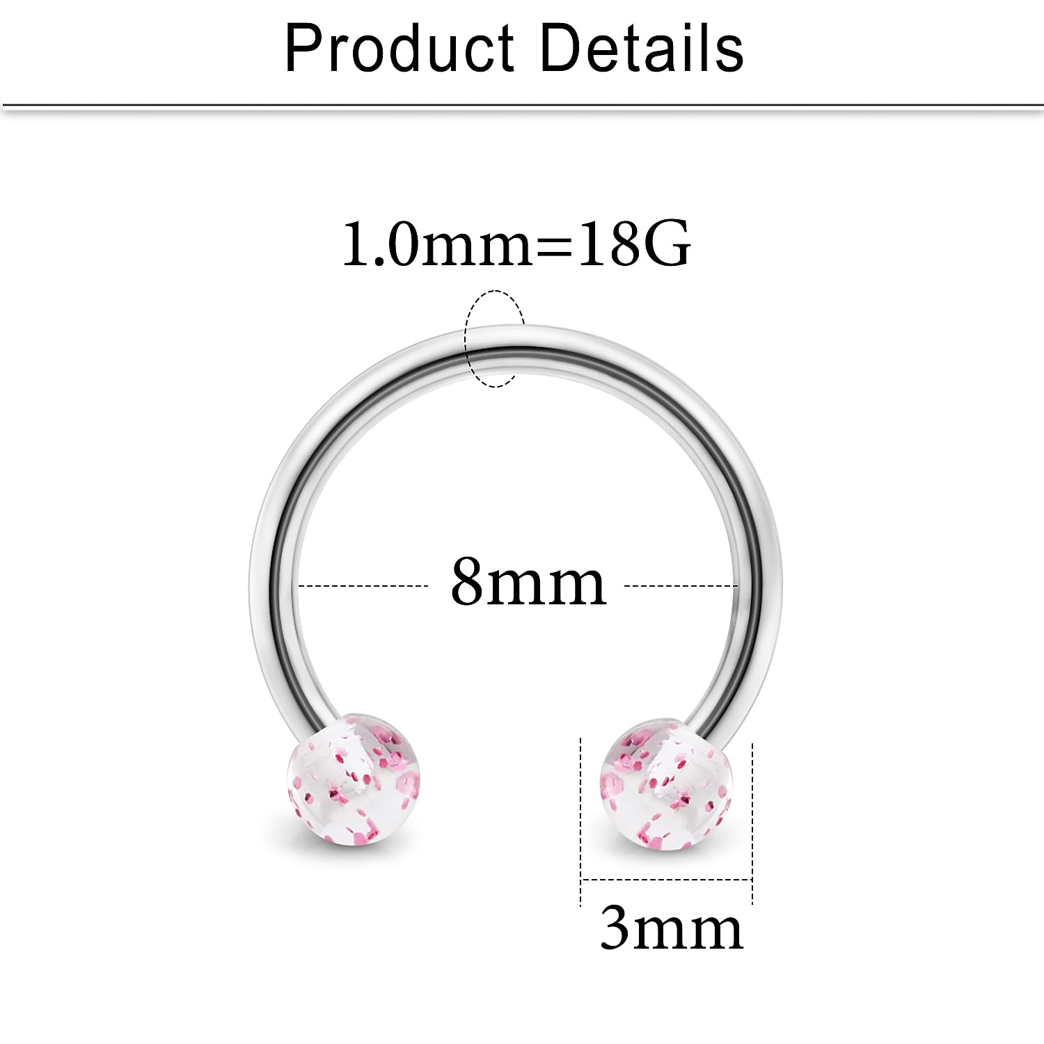 THICKNESS: Gauge Size: 18G (1.0mm); Inner Diameter of Horseshoe Barbell: 8mm (5/16"); Balls Size:3mm.Color: Silver-tone, Black, Blue, Rose Gold, Rainbow, Gold-tone.