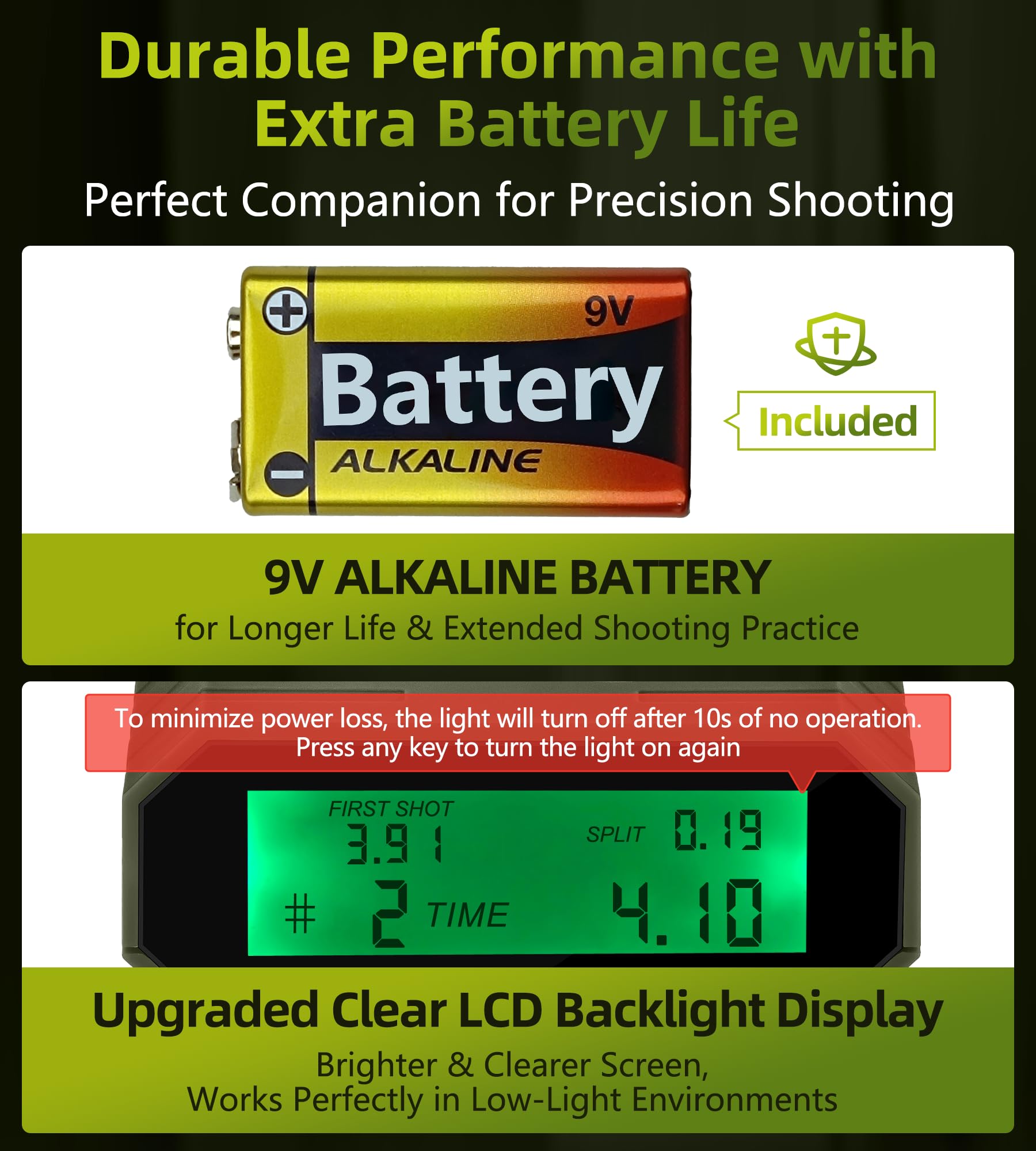Enhanced LCD Display & User-Friendly Interface: Upgraded with a high-definition screen for clearer, easier viewing of time and splits, even in low-light conditions. Four buttons are easy to operate. Intuitive controls and clear display make it easy to operate and read shot times
