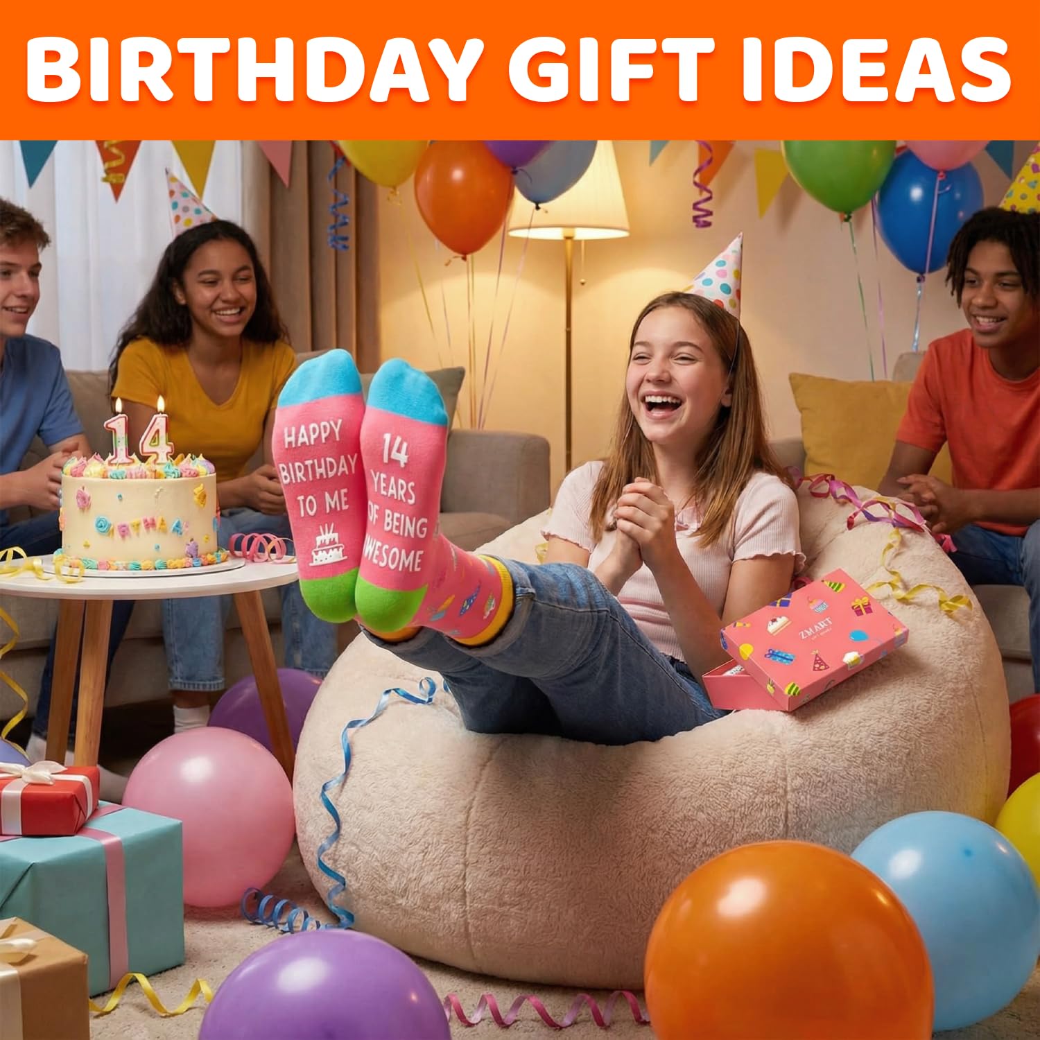 14 YEAR OLD GIRL GIFT IDEAS: These pink "HAPPY BIRTHDAY TO ME, 14 YEARS OF BEING AWESOME" socks are perfect for teen girls