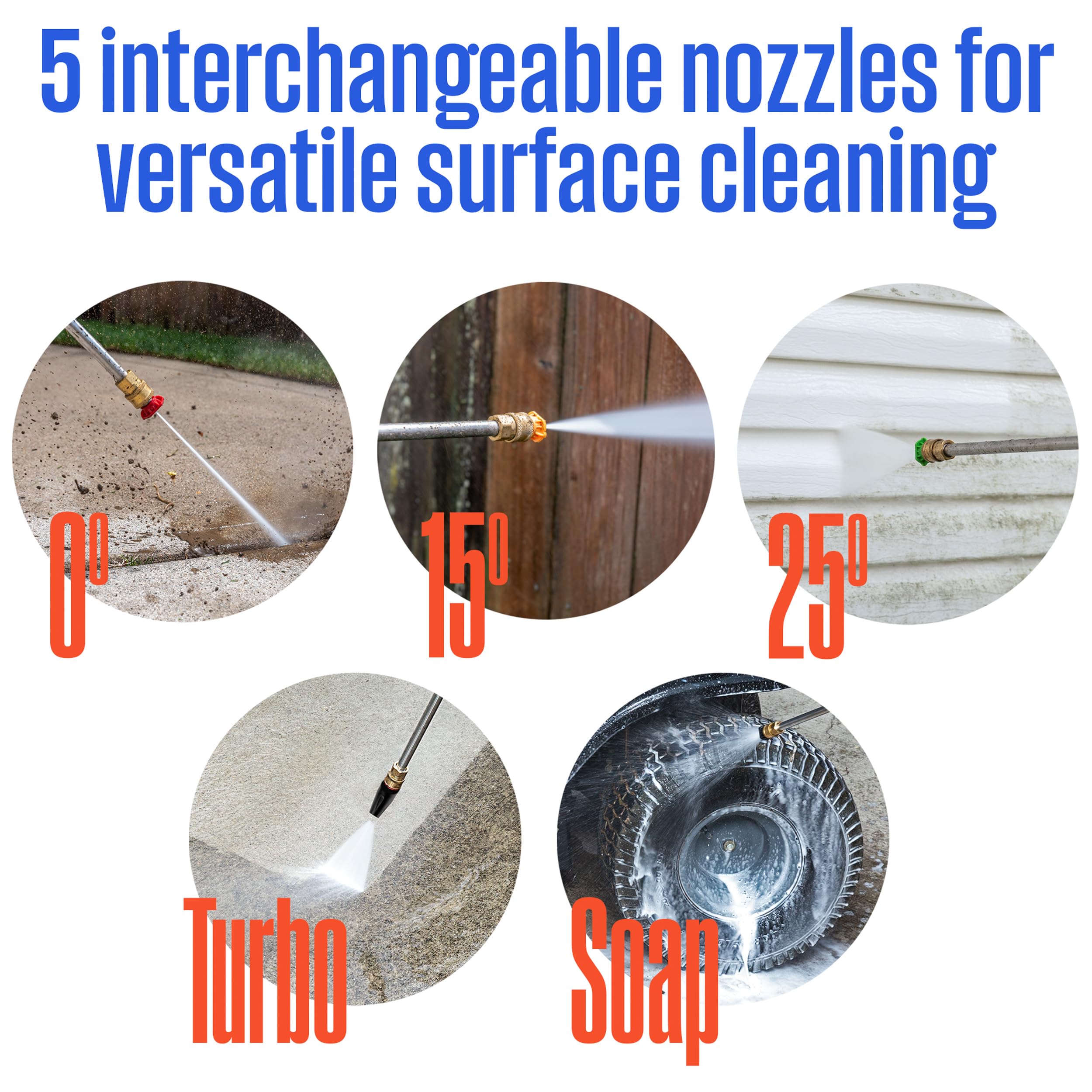 2500 max PSI (at initial discharge) and 2000 rated PSI of deep-cleaning water pressure; Up to 1.76 GPM (without nozzle at minimum pressure) and 1.2 rated GPM of water flow; Pro-style steel extendable 17.5” wand with quick-connect nozzles (0°, 15°, 25°, turbo and soap applicator)
