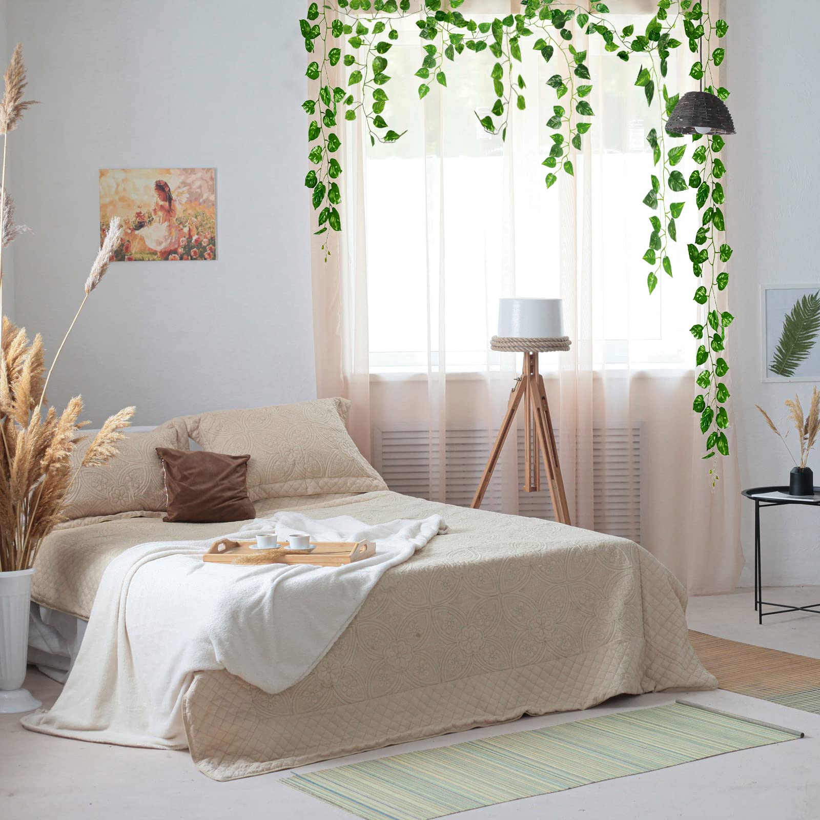 🍀DURABLE and REUSABLE: Sturdy and texture clear ivy leaf are made of fabric, stems are made of plastic, It's soft, and easily bent or cut down as you need, and adapt to all kinds of weather。Hanging ivy garland does not require any sort of special care.