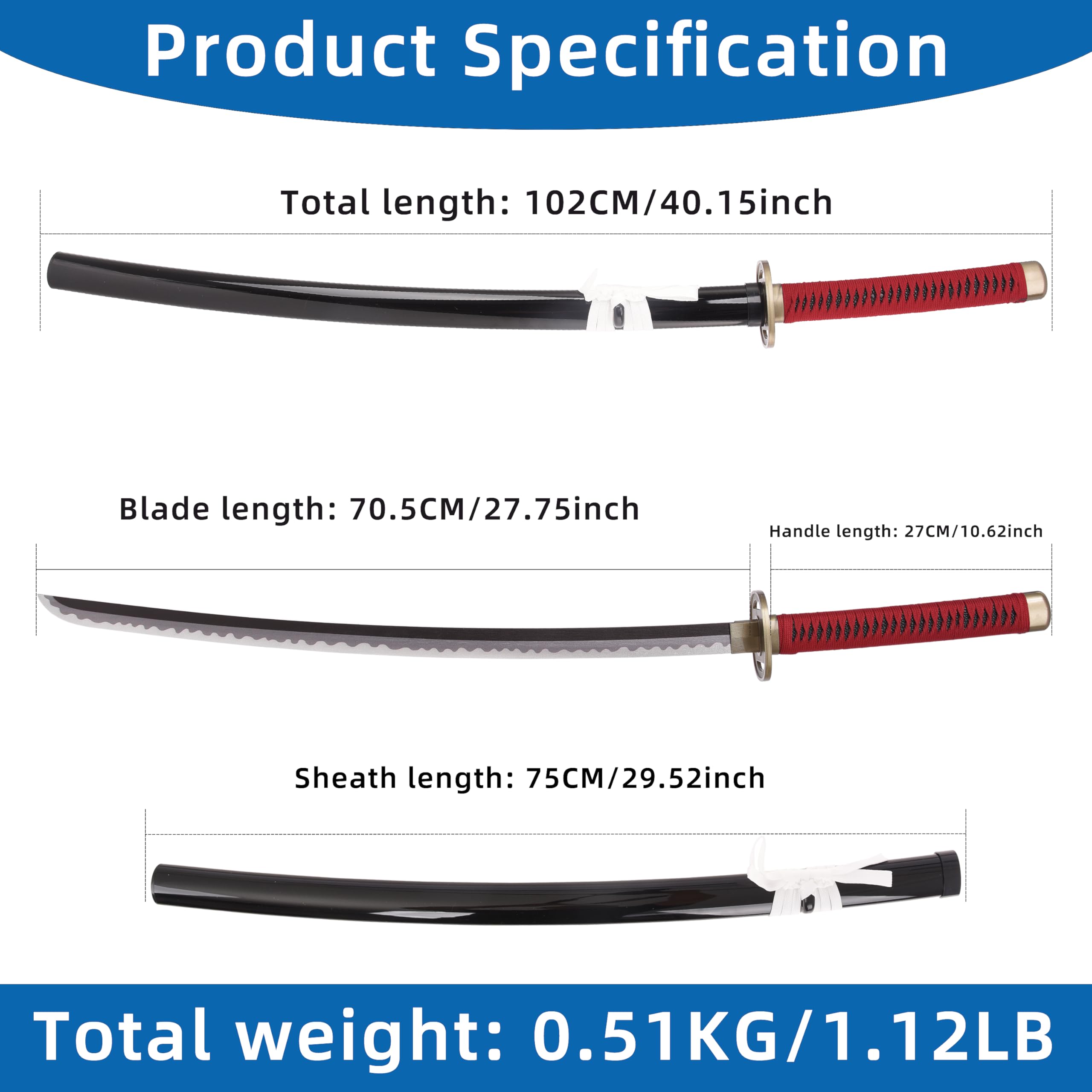 Accurate & Lightweight for Cosplay Features precise proportions: 102cm/40.2" total, 70.5cm/27.8" blade. Weighing only 0.51kg/1.12 lbs, it's authentically sized yet easy to handle for events and photos.