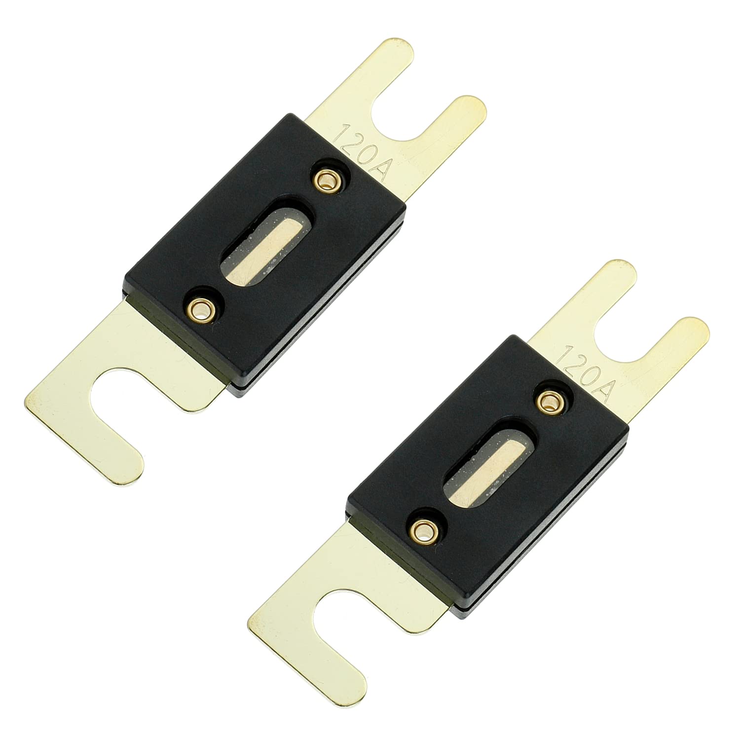 BOJACK 2 Pcs ANL Fuse Holder with 2 Pcs 120 Amp Fuses High-quality products, strong conductivity, waterproof and dustproof, durable and reliable. Fuse Size: 80x22.5x9 mm/ 3.15x0.9x0.35 inch (L*W*T); Fuse Holder Size: 123 x 37 x 40mm / 4.8 x 1.5 x 1.6 inch (L*W*H). Rated voltage: 32VDC Reach 100% of rated voltage and melt in 4 hours at the fastest. Reaching 200% of the rated voltage, melting is the slowest 10 seconds. It reaches 350% of the rated voltage and melts in 0.5 seconds at the slowest. Material: copper alloy, gold plating and PVC material Gold plating metal sheet construction with a clear protective non-conductive resistant cover Package Content: 2 * ANL fuse holder 2 * 120A ANL fuse