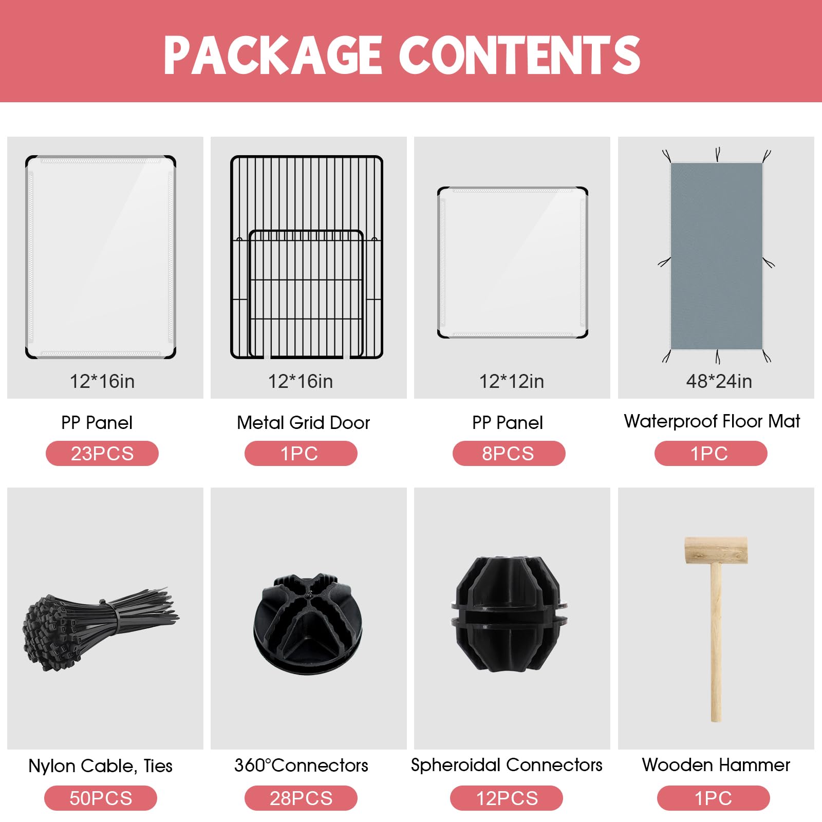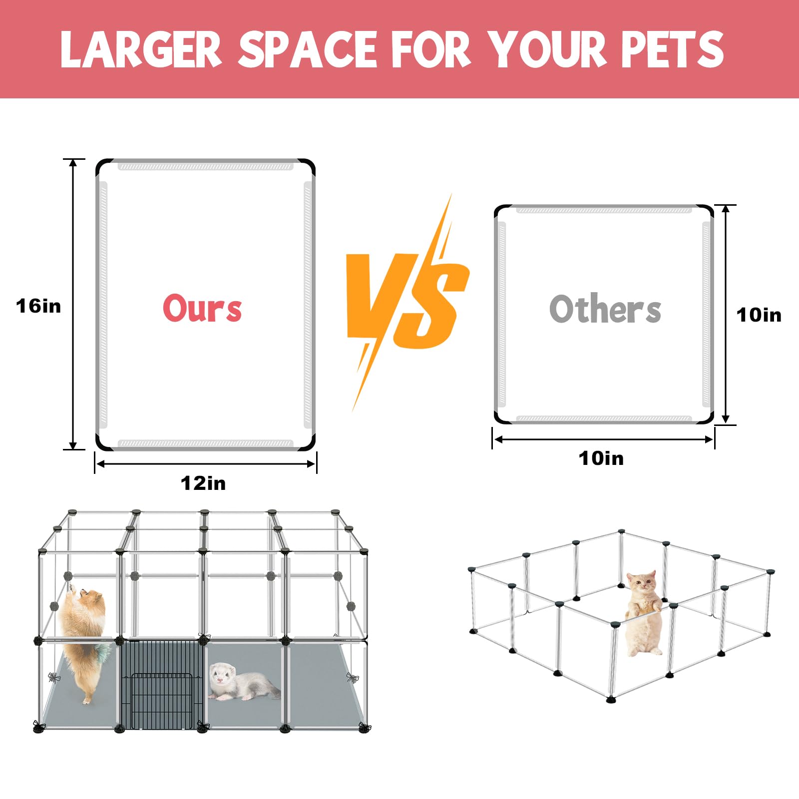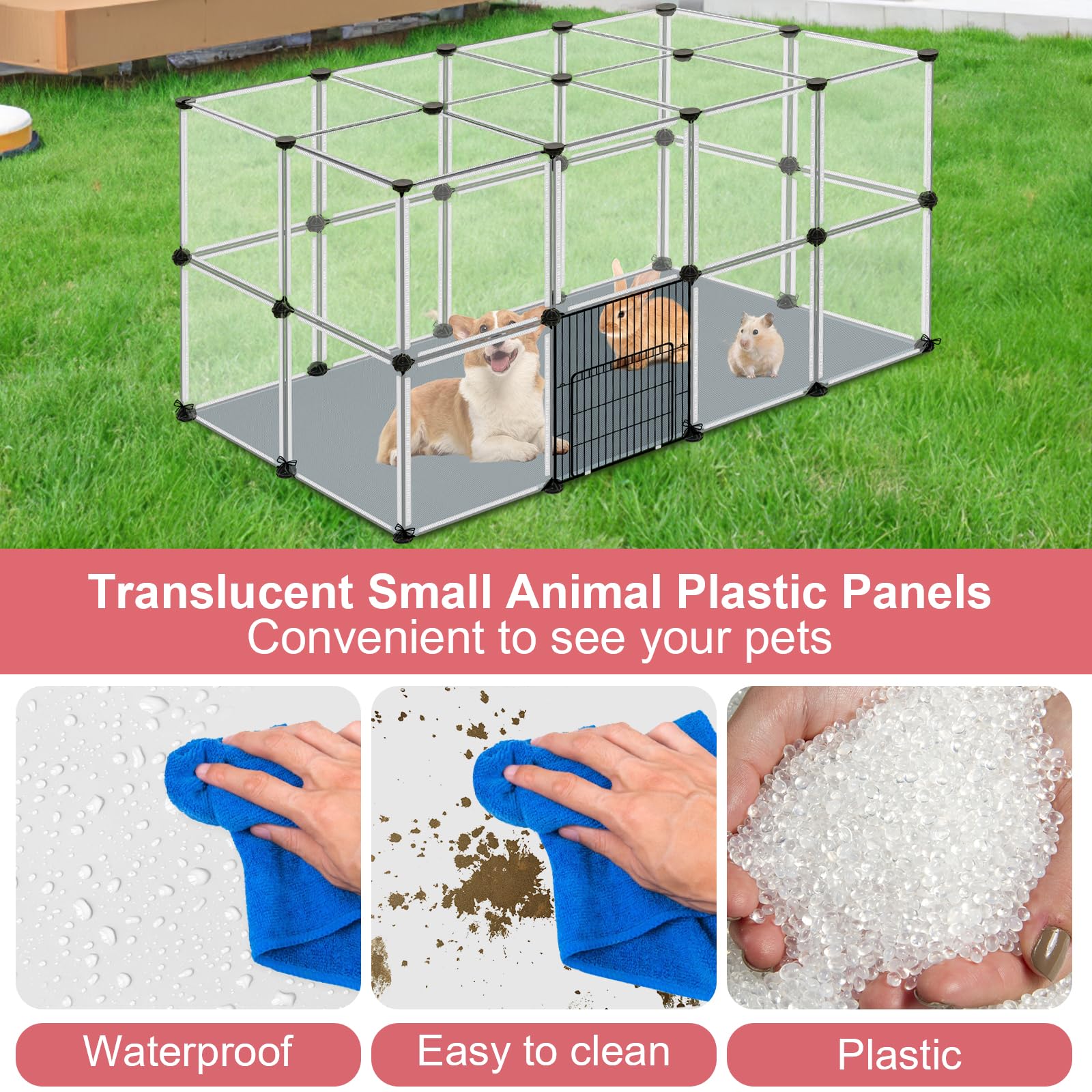 [Pet Playpen Package]: The upgraded small animals playpen set includes 31pcs transparent panels, 1pc metal fence door, 1pc waterproof floor mat, 1pc 50pcs nylon cables, 40pcs connectors,1pc wooden hammer, 1pc User manual. This small pet playpen offers a spacious and secure area for your furry friends to play and exercise. Assembled size can be 48" x 32" x 24". You can also customize the panels into any shape, can move and disassemble the small animal pet playpen easily.