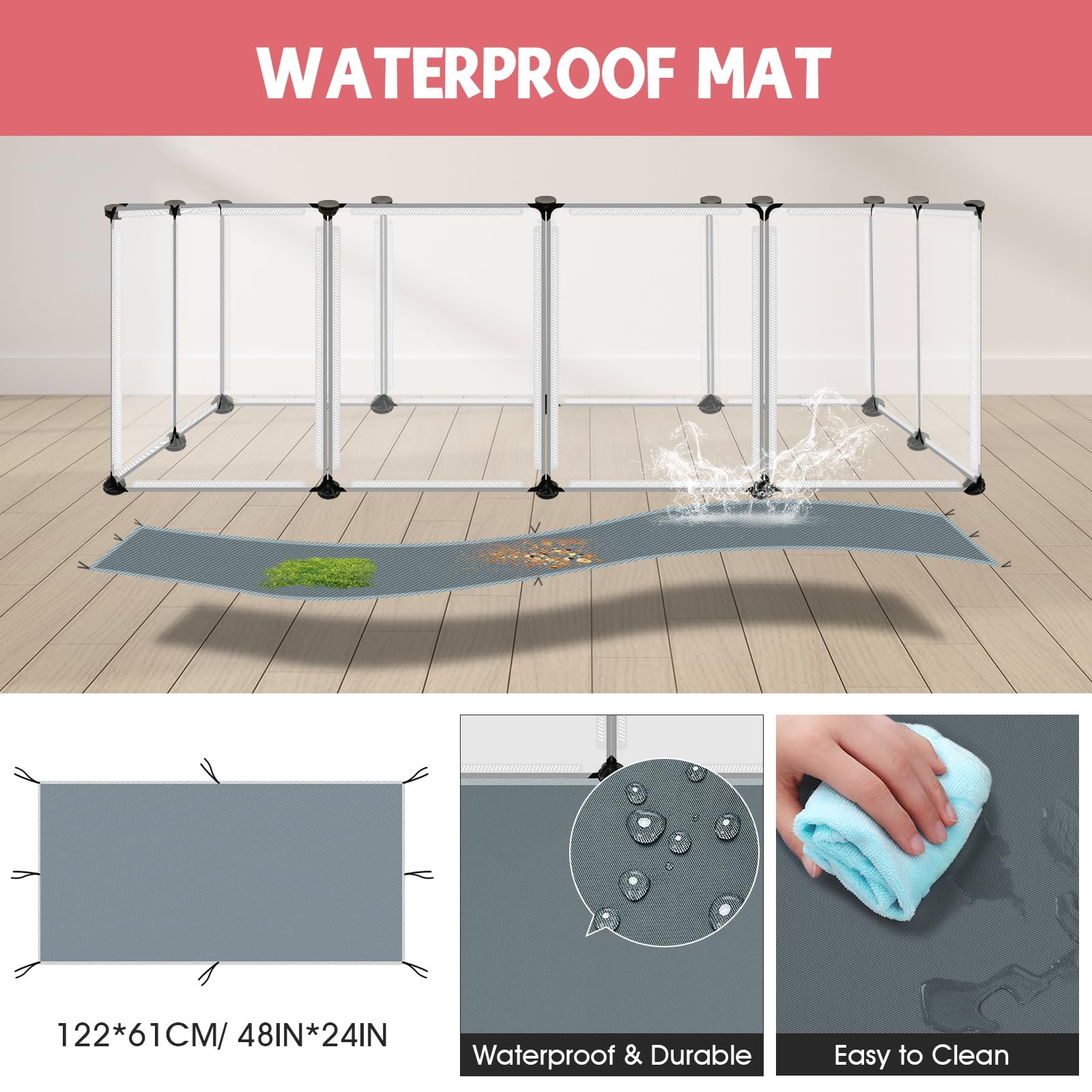 【Waterproof Floor Mat】Our upgraded pet playpen comes with a waterproof floor mat, which is suitable for placing inside the assembled fence with a size of 24 x 48in. Our floor mats are made of 600D oxford cloth, it is more wear-resistant, effectively protecting your floor. The inner lining is made of PVC waterproof coating, which is easy to clean and only needs to be wiped with a towel.