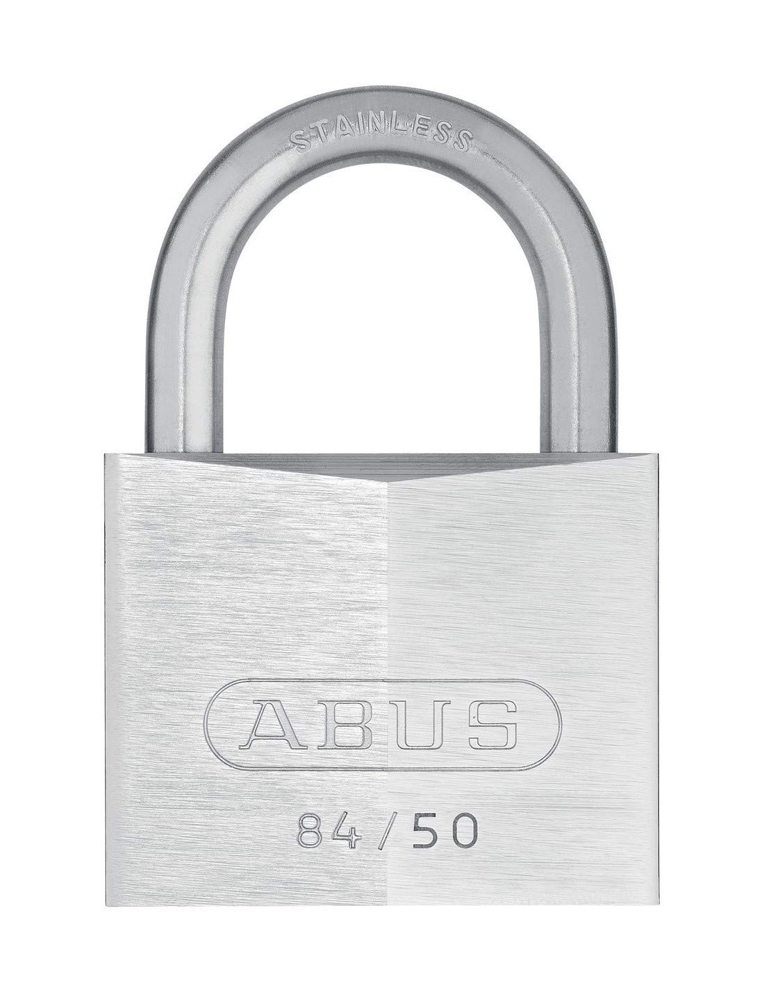 ABUS 84IB/50: All elements of the lock are made of stainless material, so this padlock is ideal for use in sea and port areas. The 7 mm thick stainless steel clasp and double locking provide good protection against various breakage types. The high-quality cylinder offers a high degree of locking comfort with good protection against tampering. Clearance height: 27 mm. Includes 2 keys