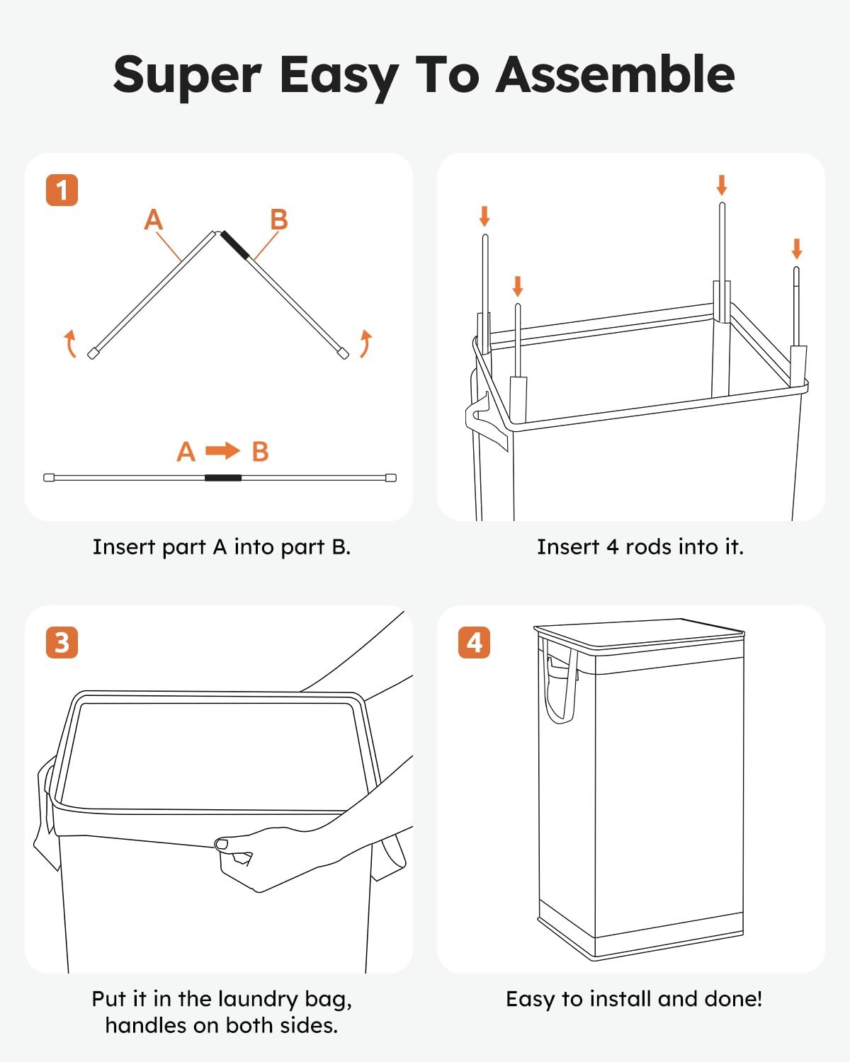 【Easy to Install and Foldable】Laundry baskets with detailed installation instructions, just insert 4 support rods into the fixed tube, and you can complete the laundry basket installation in 1 minute. The collapsible laundry bin folds up easily for compact storage, ideal for home, campus, camping, apartments, hotels and shopping.