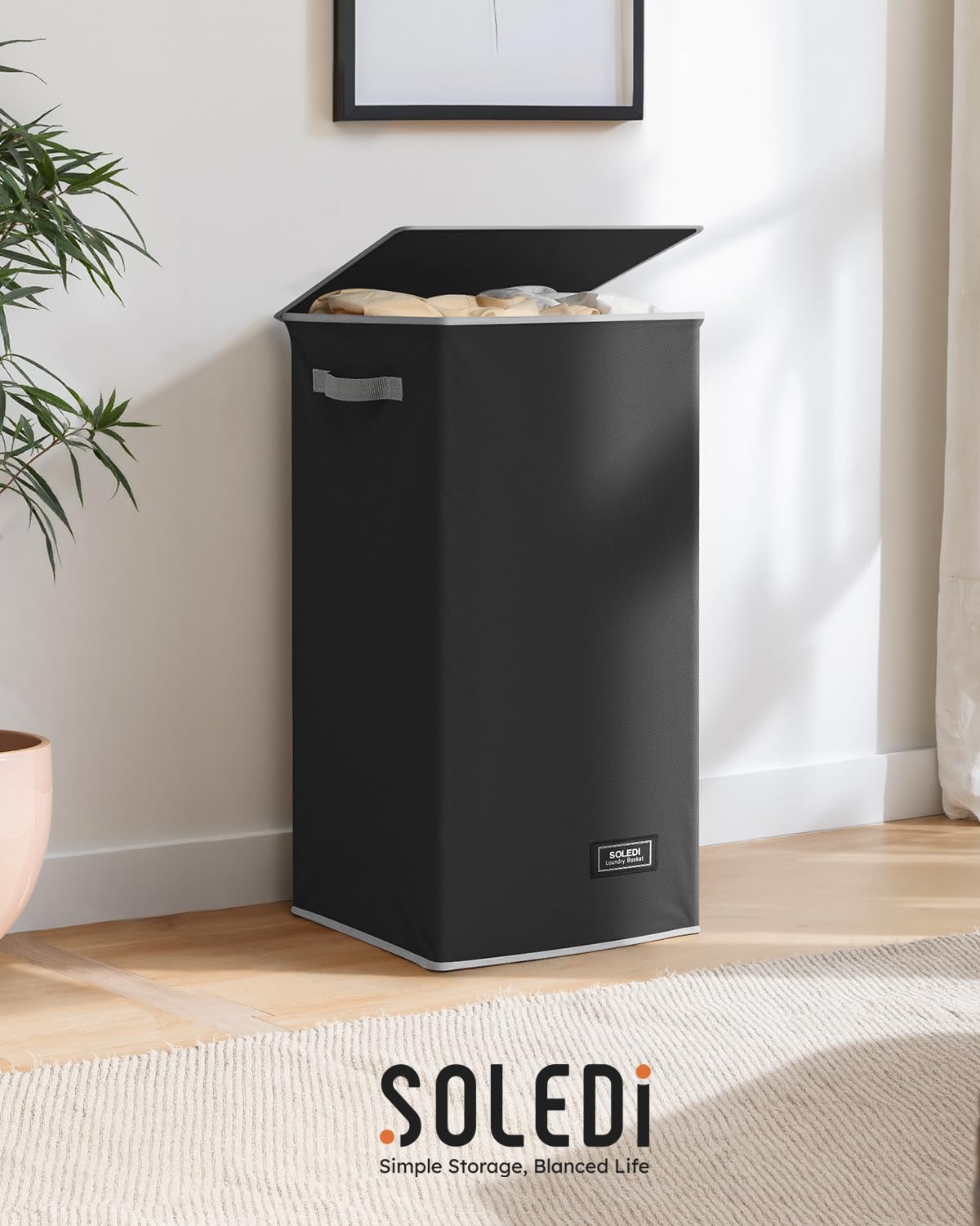 【Modern hampers with Lid & Handles】SOLEDI Laundry hamper is very modern and stylish. The lid secludes smelly clothes and also keeps your dirty laundry out of sight. There are two handles on the side of the laundry hamper, which are reinforced with durable tight stitching to prevent tearing.