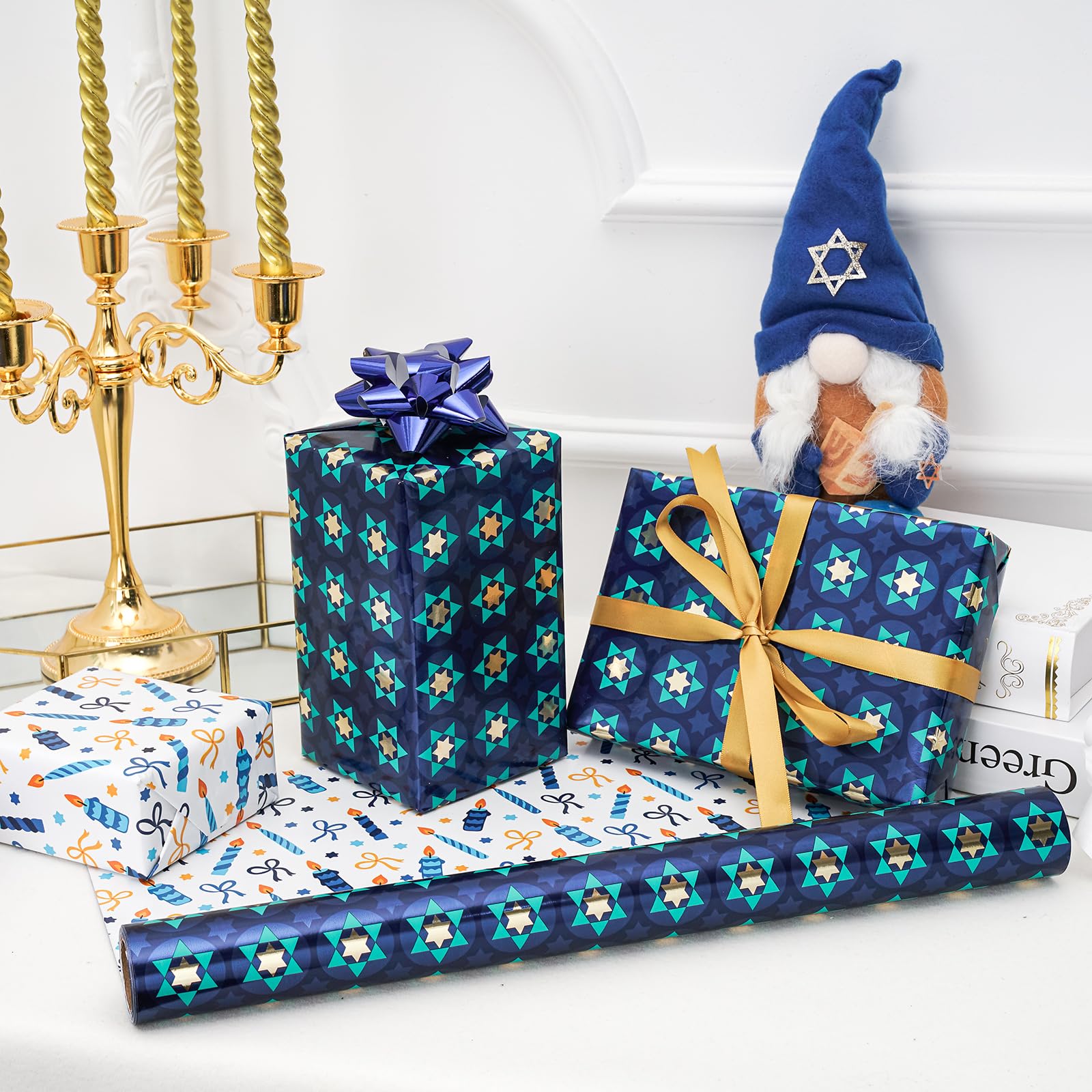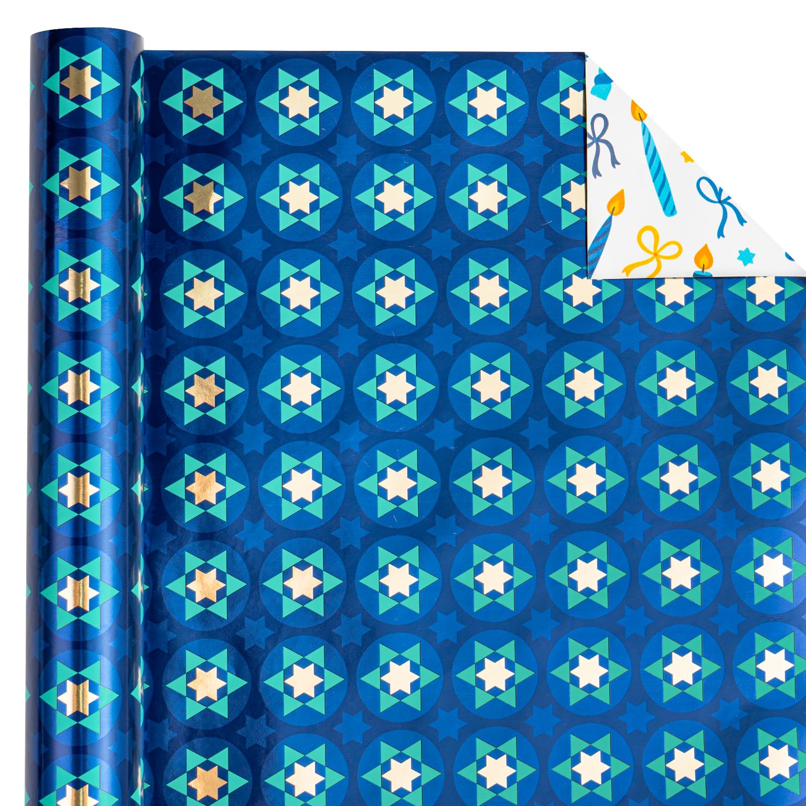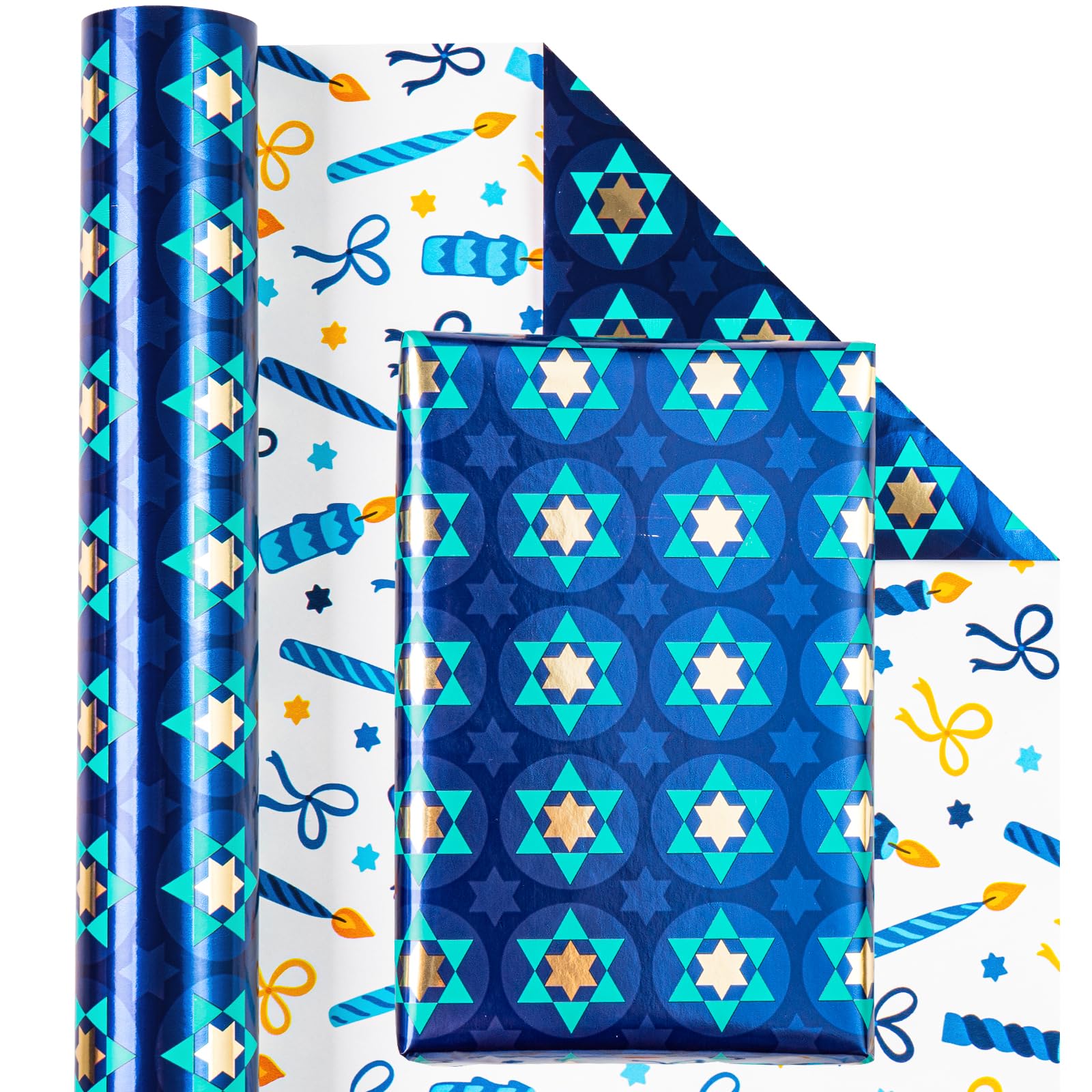 Reversible Design: the Star of David printed on one side, colorful candles and bow printed on the reverse. Two different designs make unique and varied gift presentations easy.