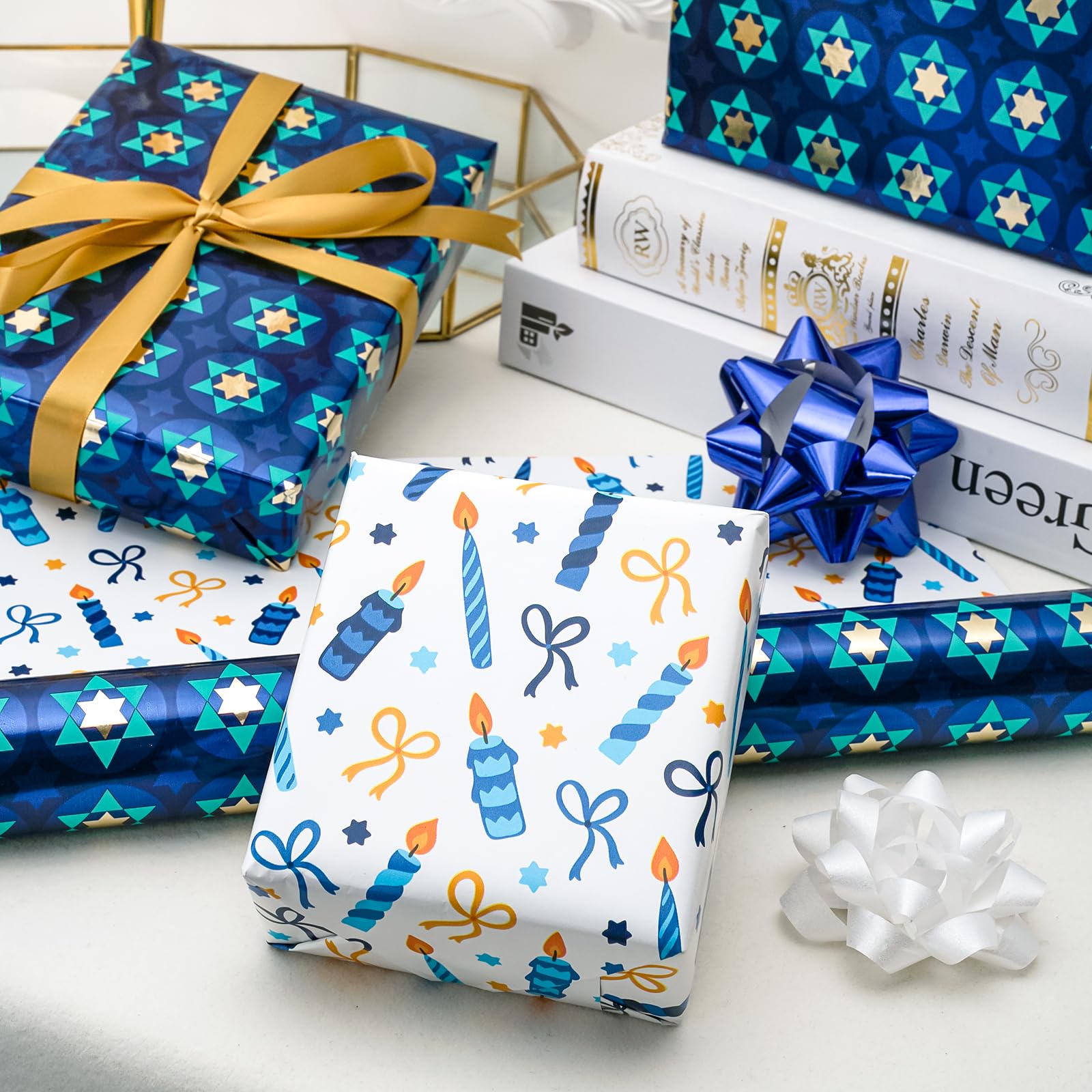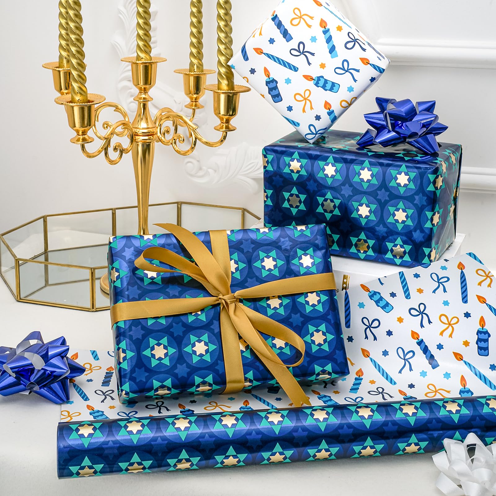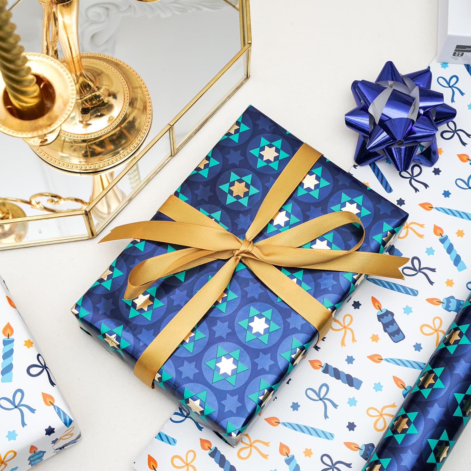 Reversible Design: the Star of David printed on one side, colorful candles and bow printed on the reverse. Two different designs make unique and varied gift presentations easy.