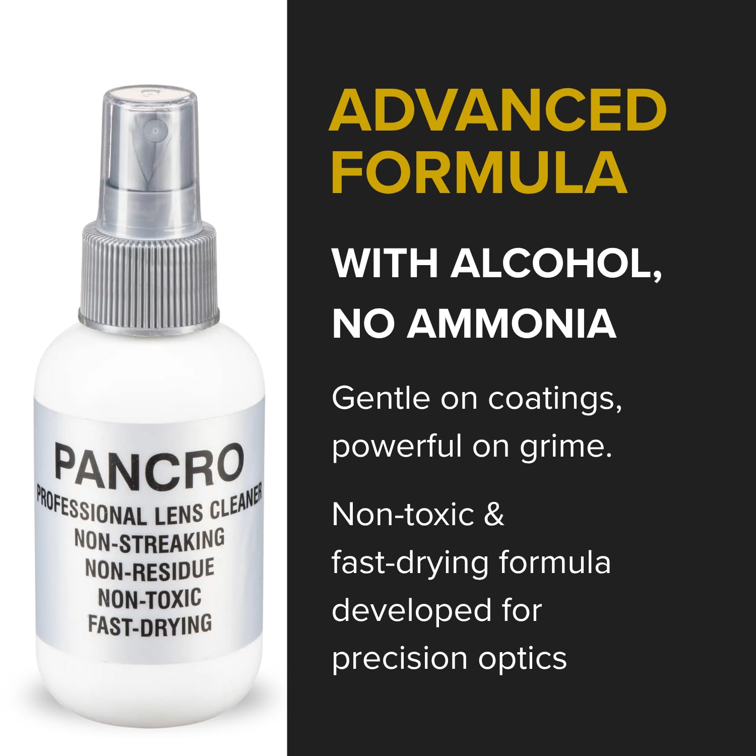 An essential tool for photographers and videographers, the Pancro 4oz Professional Lens Cleaner Spray Bottle offers a superior cleaning solution specifically formulated for delicate camera lenses and optical equipment. This high-quality, non-toxic spray ensures that your lenses remain spotless and free from smudges, enhancing the clarity and quality of your images.Crafted with a professional-grade, fast-drying formula, the Pancro Lens Cleaner eliminates streaks and residues that can affect your lens performance. Its effectiveness is not just a claim; it has been recognized as the top lens cleaning solution, having been awarded the title at the prestigious Camera Assistant Olympics, underscoring its industry-wide reputation for excellence.The easy-to-use, durable spray bottle design allows for precise application, ensuring that every spray distributes the perfect amount of cleaner to efficiently remove dust, fingerprints, and grime. The 4oz size is conveniently portable, making it an ideal accessory for on-location shoots, where maintaining clean lenses is crucial for capturing high-quality footage.Professionals in the field, from camera assistants to seasoned photographers, have made the Pancro Lens Cleaner their first choice, trusting in its ability to maintain the pristine condition of their valuable equipment. Made in the USA, this effective lens cleaner is a testament to Pancro's commitment to producing top-tier products for the photography and vid