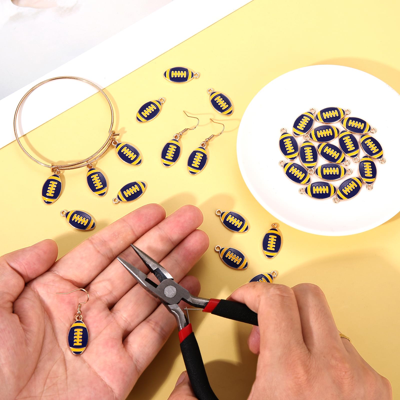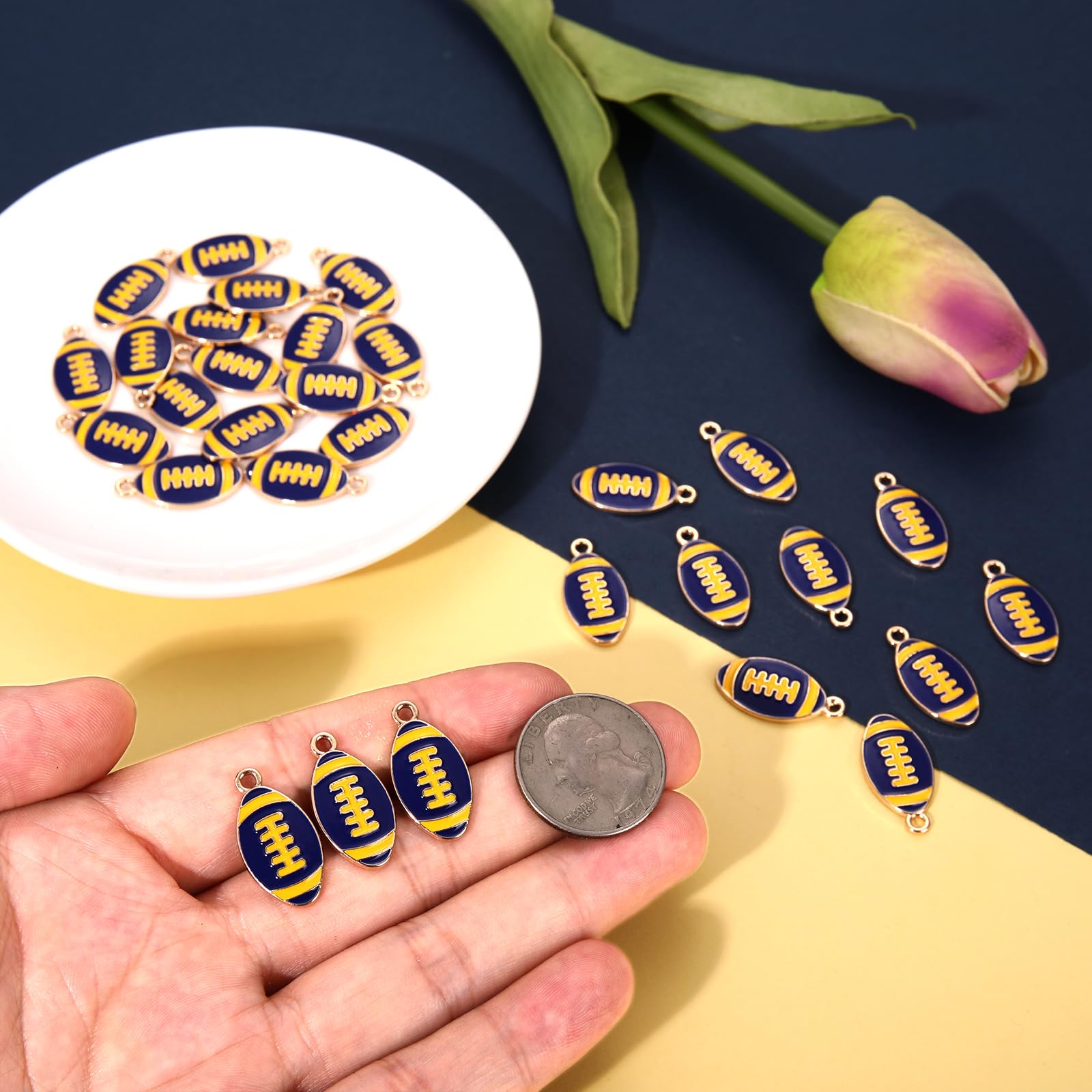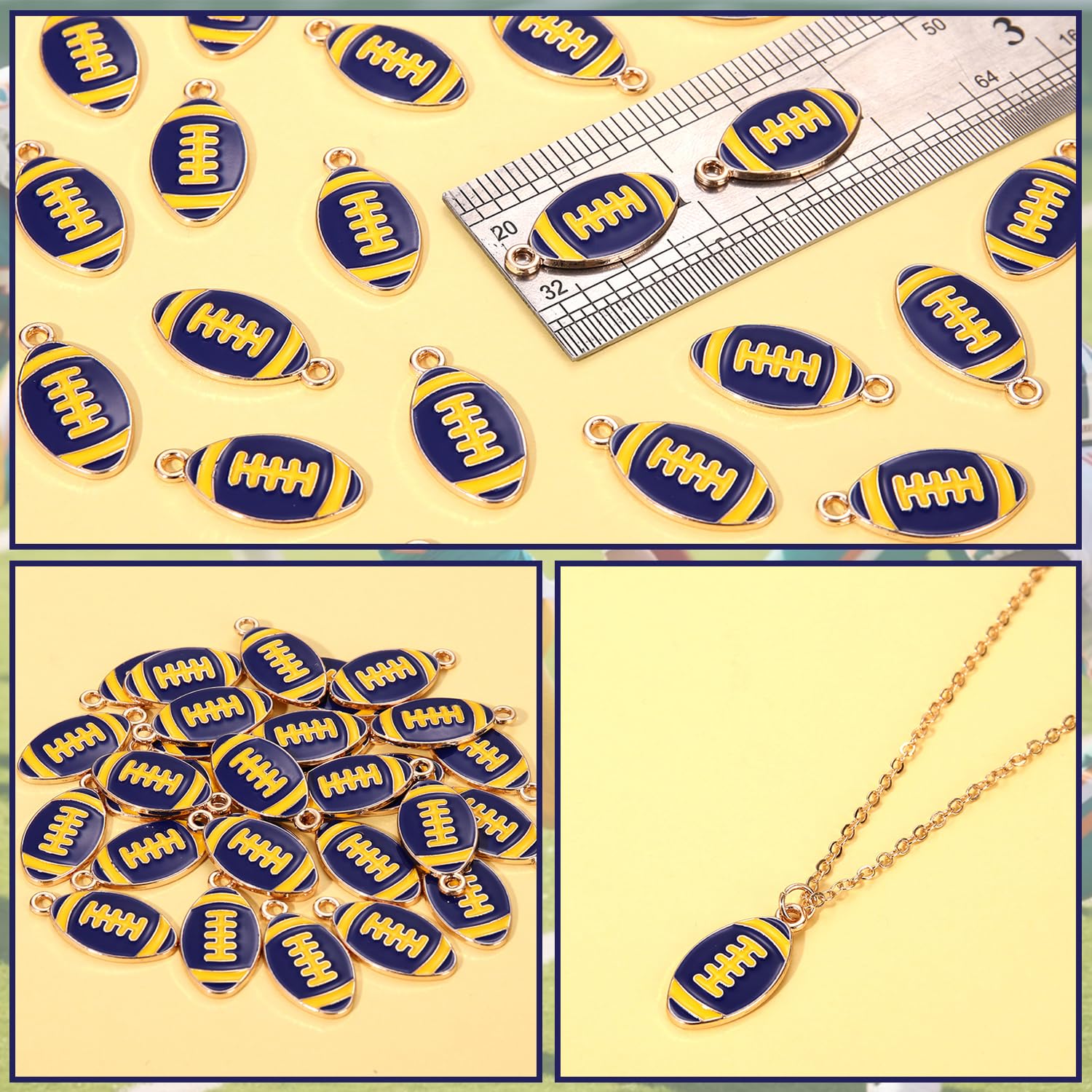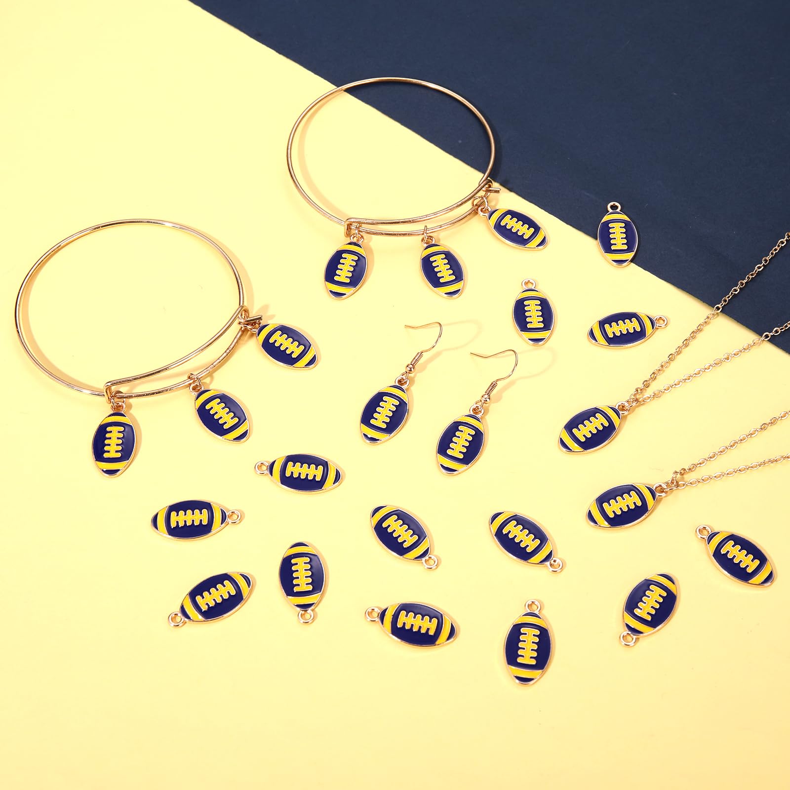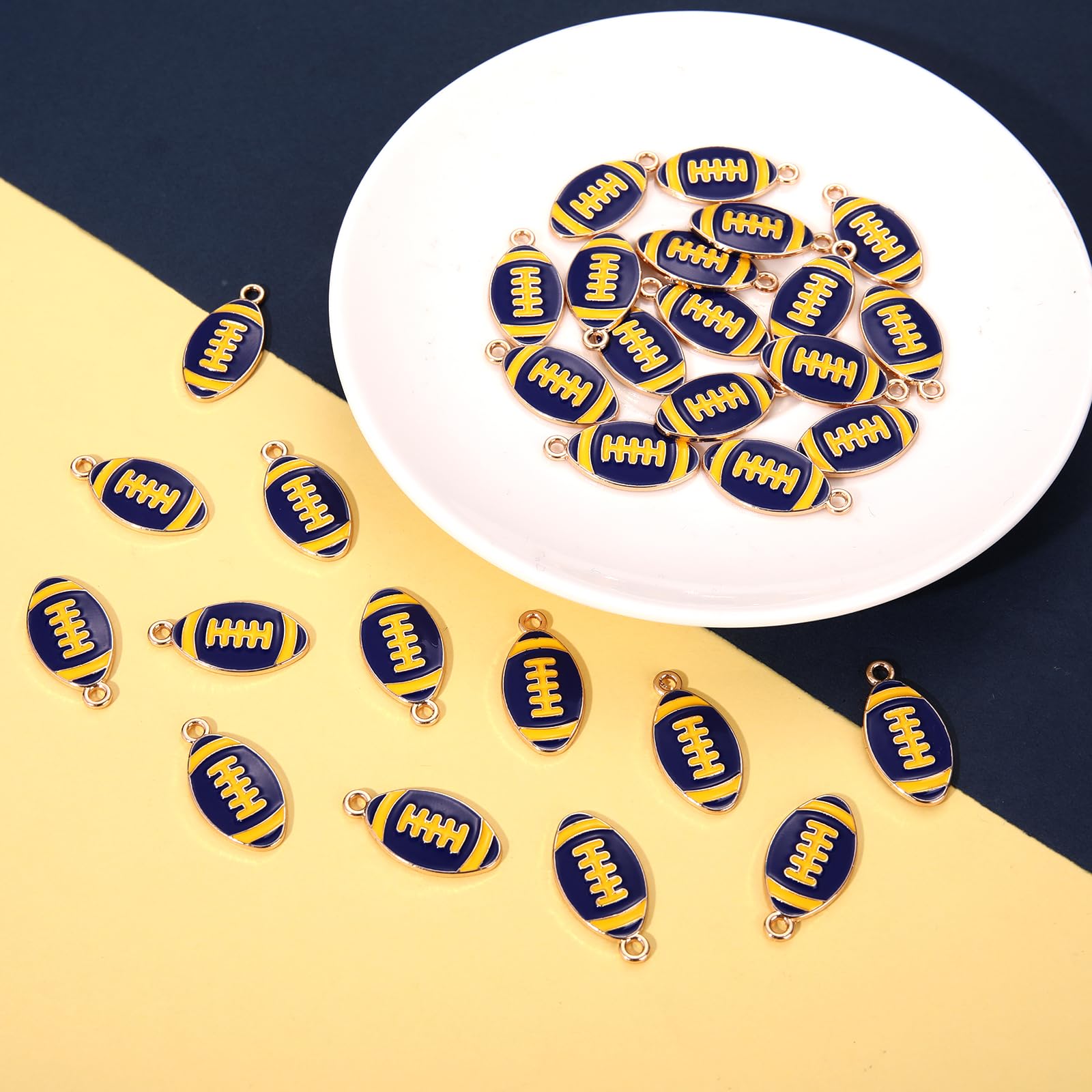 ღ Premium Quality & Size: Complete your Game day outfits with this fun blue yellow football charms. Made of premium quality enamel and metal materials, nickle free, lead free, anti-corrosion, lightweight, sturdy and solid. Length: about 0.6inch. A jump ring is attached to the top of the charm, so you can easily add it to your designs