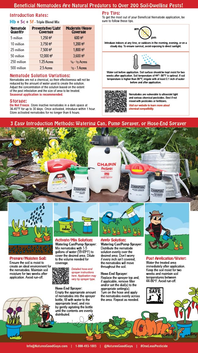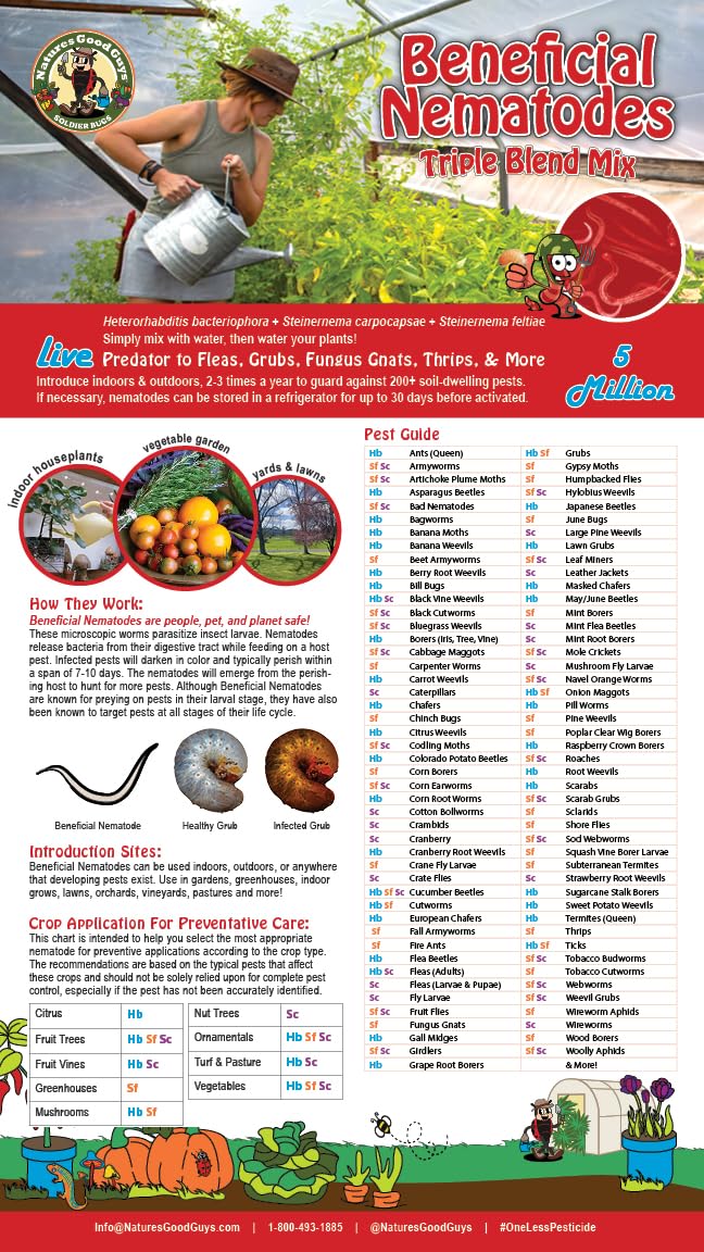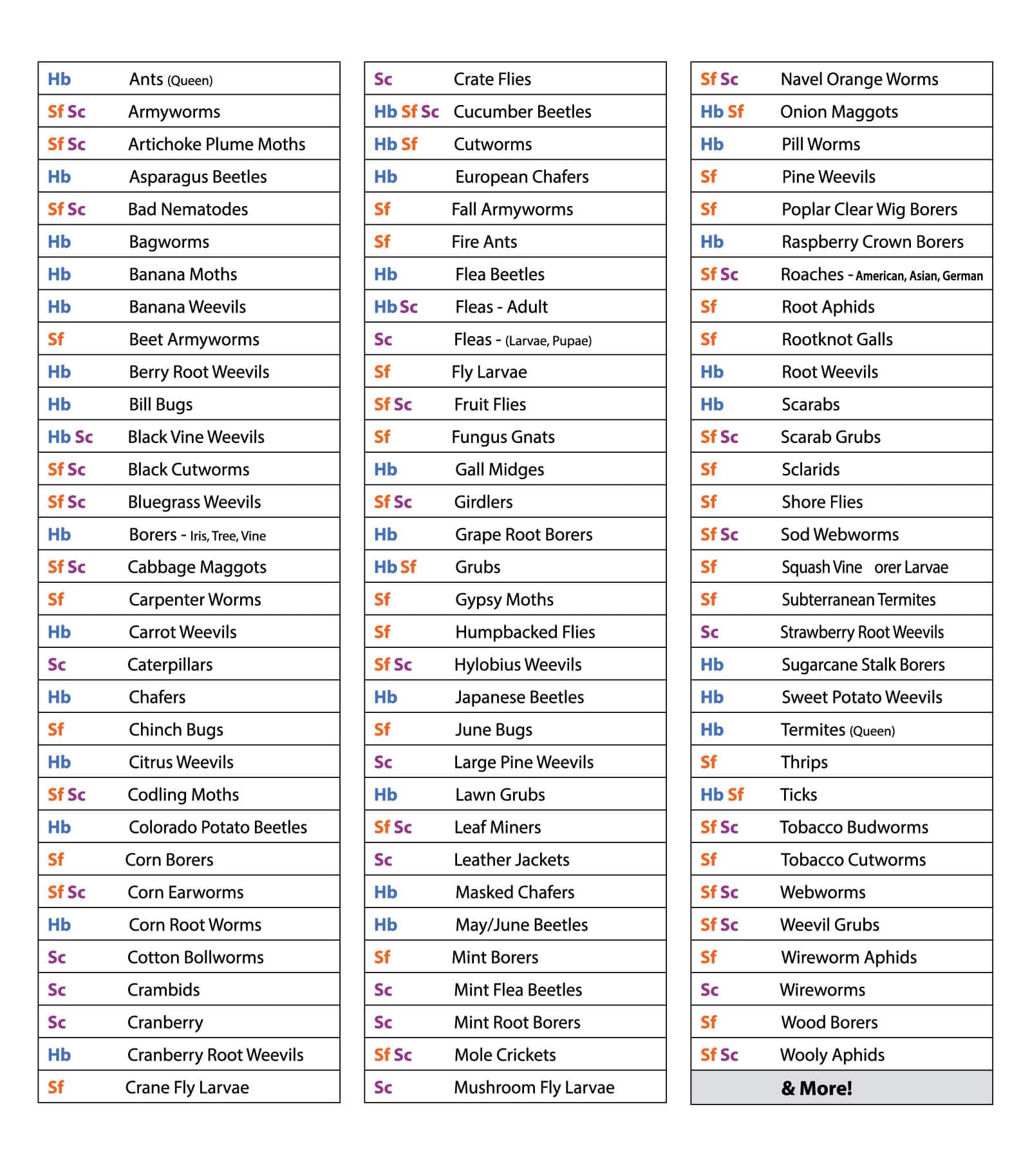 Beneficial Nematode- HB, SC and SF! These microscopic round worms are natural biological control against:Grubs, Japanese Beetle Larva, Cucumber Beetles, Maggots, Ants (Queen),Asparagus Beetles, Bagworms, Banana Moths, Banana Weevils, Berry Root Weevils, Bill Bugs, Black Vine Weevils, Borers –Iris, Tree, Vine, Carrot Weevils, Chafers, Citrus Weevils, Colorado Potato Beetles, Corn Root Worms, Cranberry Root Weevils, Cucumber Beetles, Cutworms, European Chafers, Flea Beetles, Fleas –Adult, Gall Midges, Grape Root Borers, Grubs, Japanese Beetles, Lawn Grubs, Masked Chafers, May/June Beetles, Onion Maggots, Pill Worms, Raspberry Crown Borers, Root Weevils, Scarabs, Sugarcane Stalk Borers, Sweet Potato Weevils, Termites (Queen), Ticks and more than over 200 species of soil pests! Simply add water and release with a watering can, hose end sprayer or other apparatus. Complete instructions included. How Nematodes Work: Nematodes actively seek for insect larvae, entering through natural body openings.