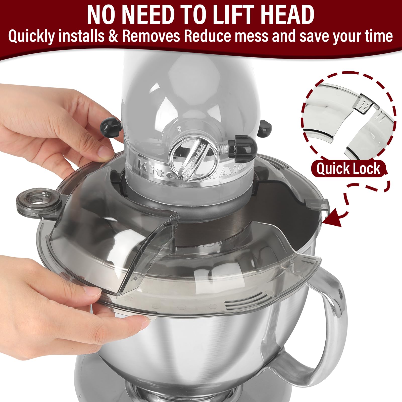 【Upgraded Design】The full wrap-around pouring shield and standard splatter shield chute dust cover perfectly retains the ingredients in the center for kitchenaid mixer bowl, and the mixing will be more efficient and thorough, effectively preventing splashes and spills when mixing lightweight ingredients such as flour. Upgraded dump hood with quick lock ,quickty installs ,removes reduce mess and save your time.