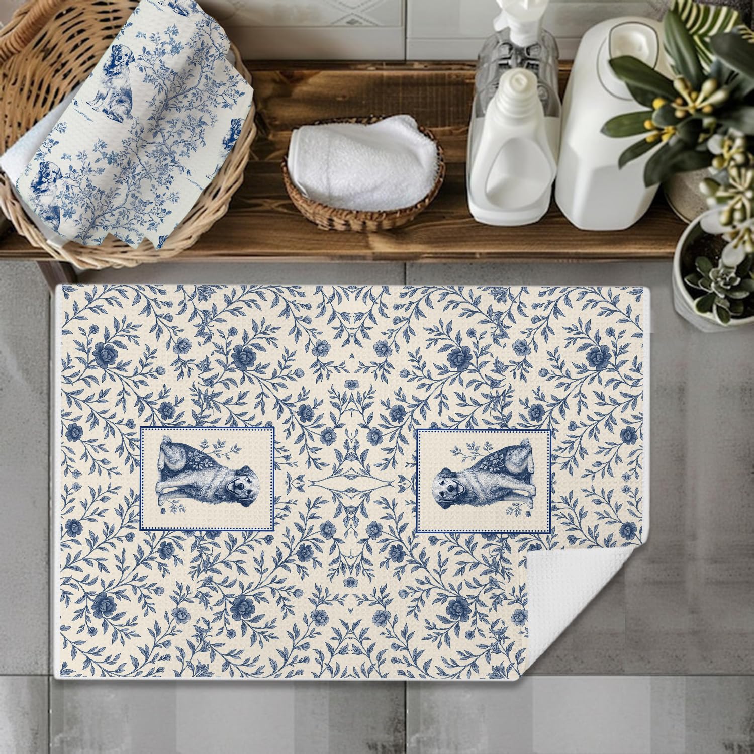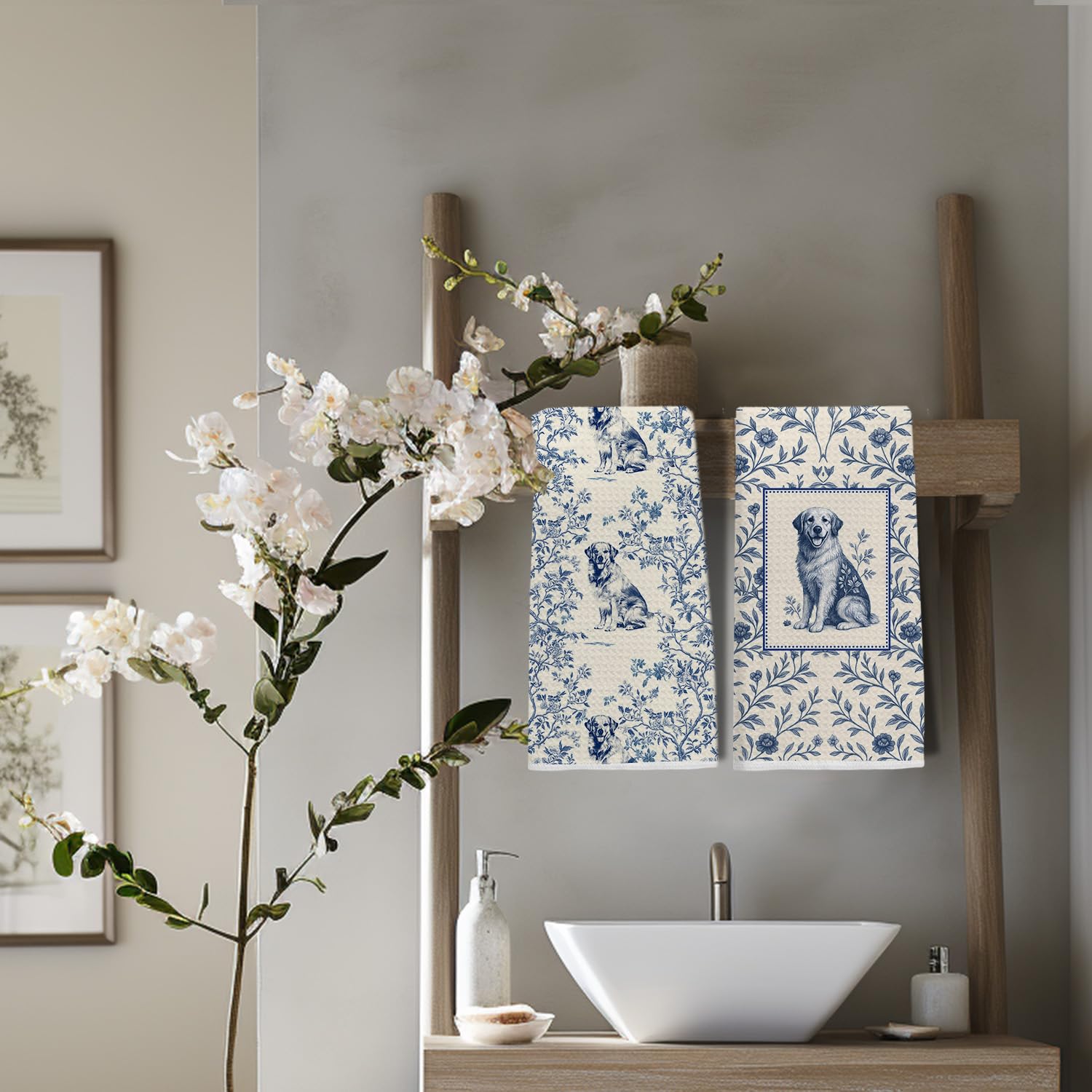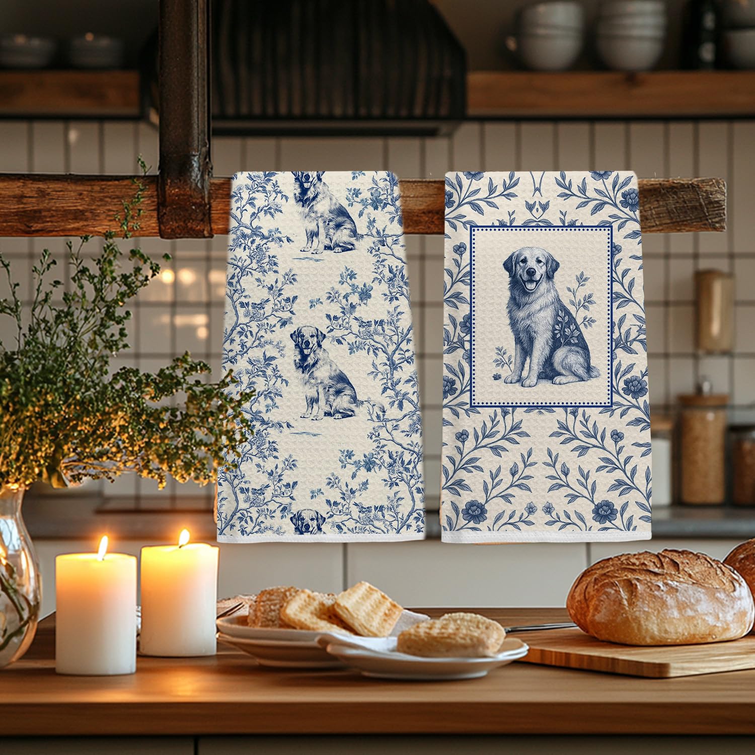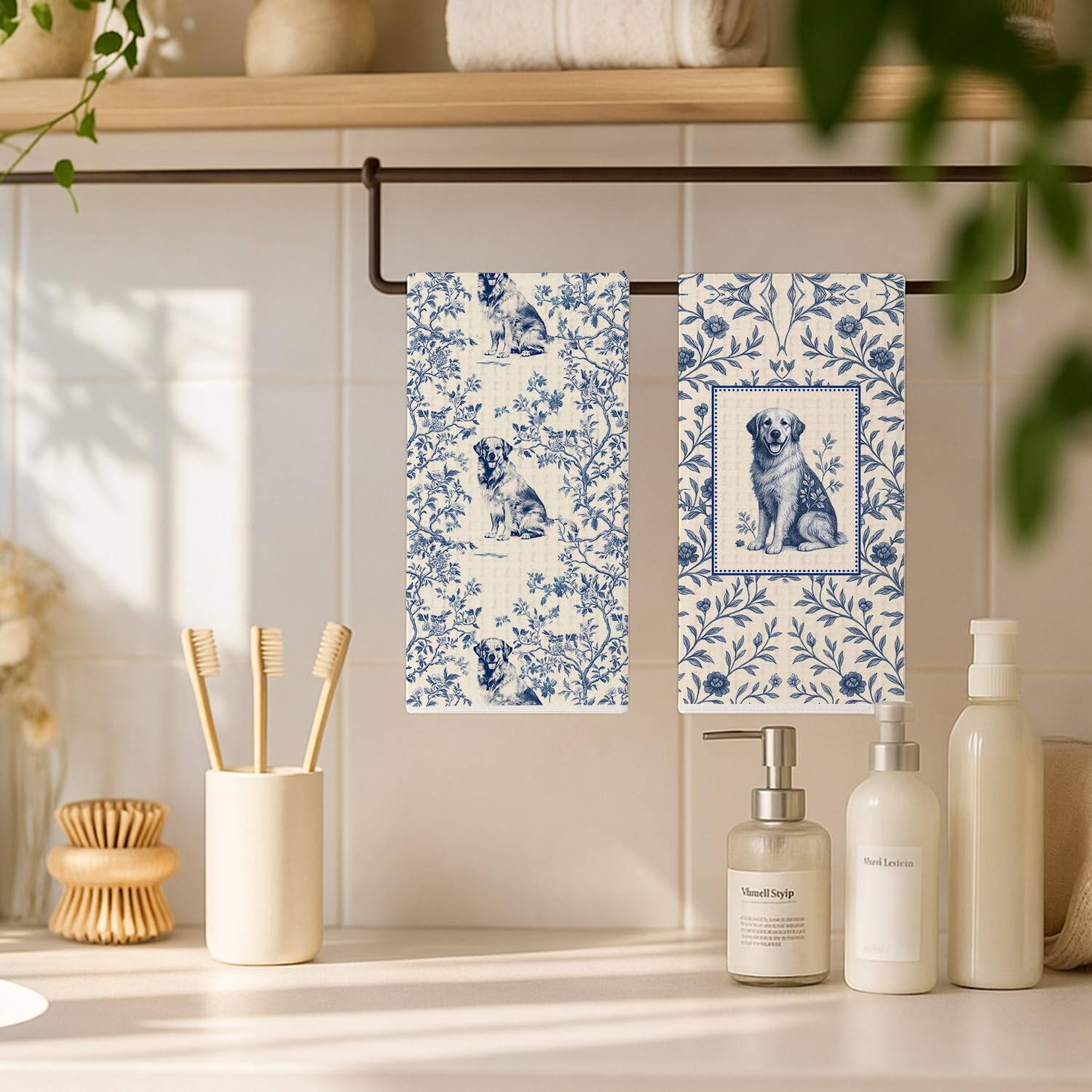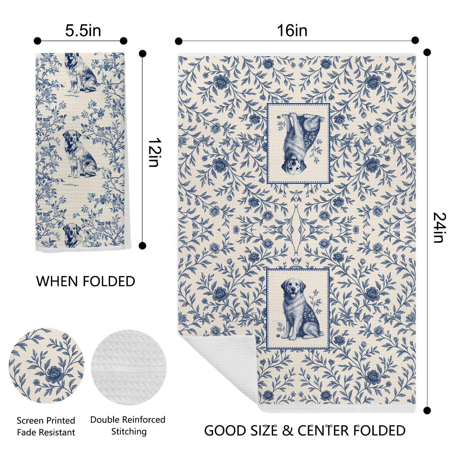 Elegant Blue Chinoiserie Design – These 16x24 inch kitchen towels feature a vintage French toile pattern with a charming Golden Retriever illustration. The blue floral chinoiserie motif adds a touch of timeless elegance to your kitchen or bathroom décor.