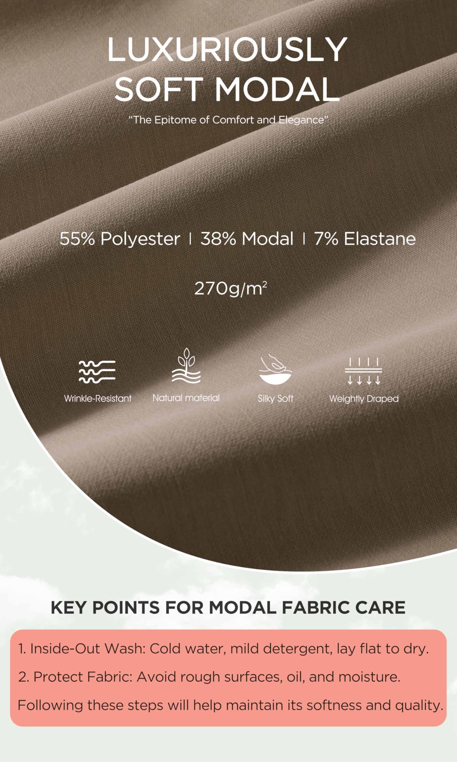 Modal Soft: Made of ultra soft modal fabric blend with polyester and spandex, 270g/m² medium weight fabric, weightly draped, moisture absorption and wrinkle-resistant, keep the shape of the pants well.