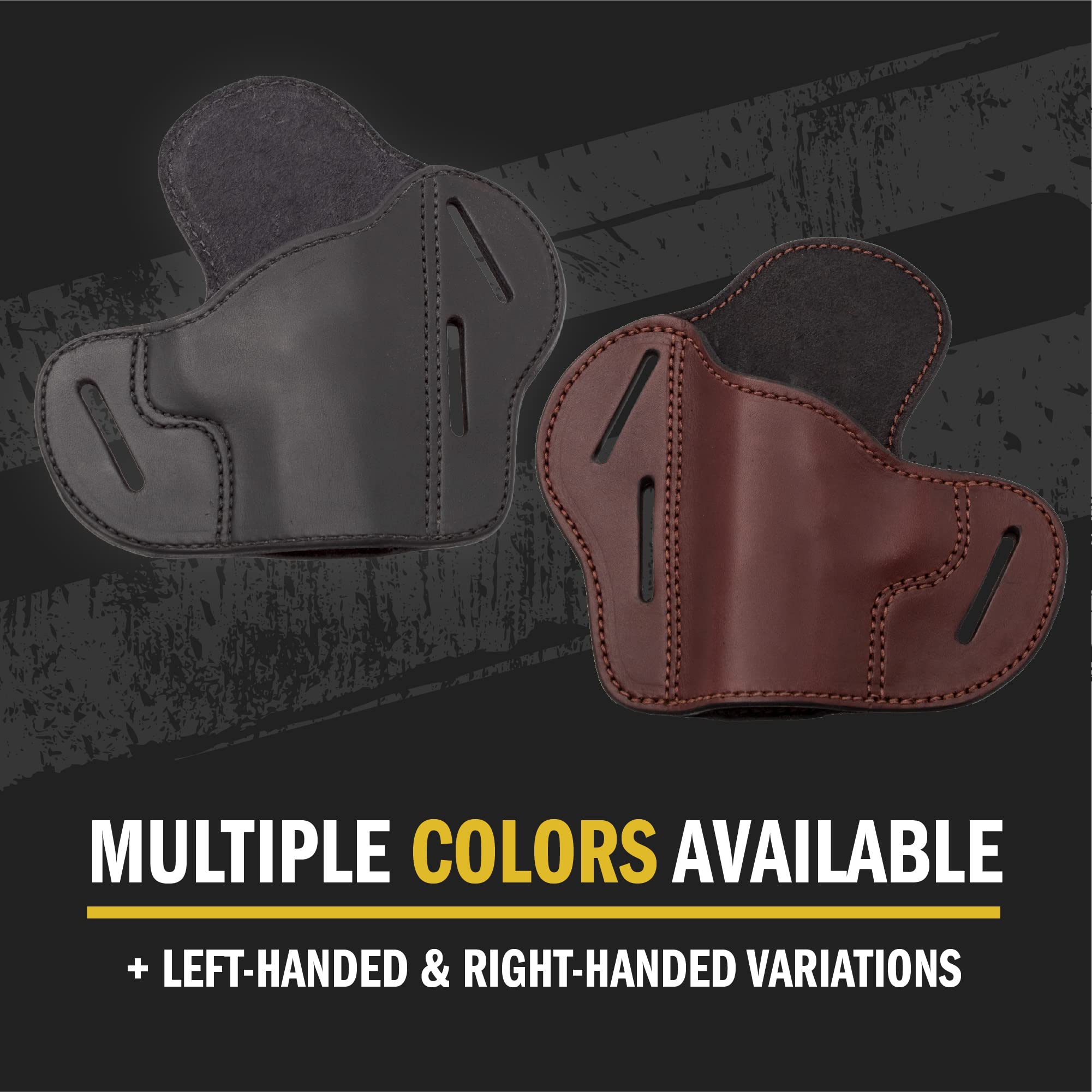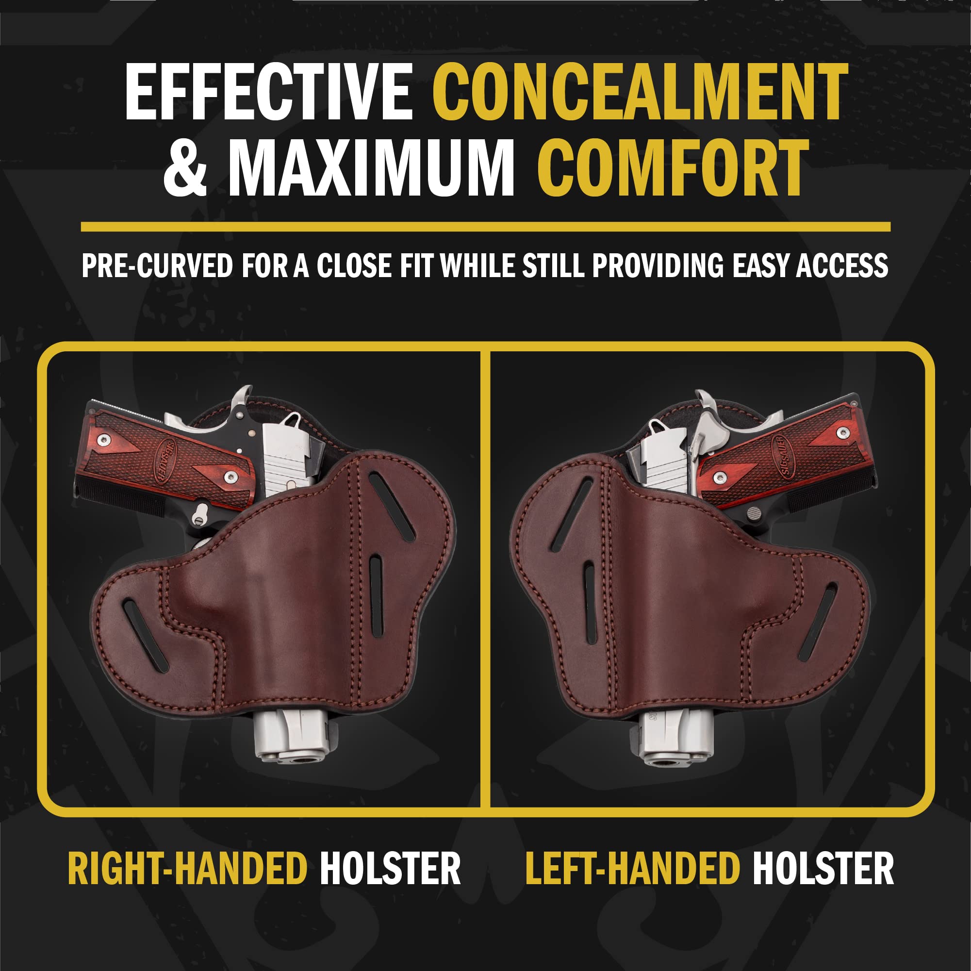 Ergonomic design with sweat shield and contoured leather backing improves comfort during extended concealed carry or range use while protecting the firearm finish.