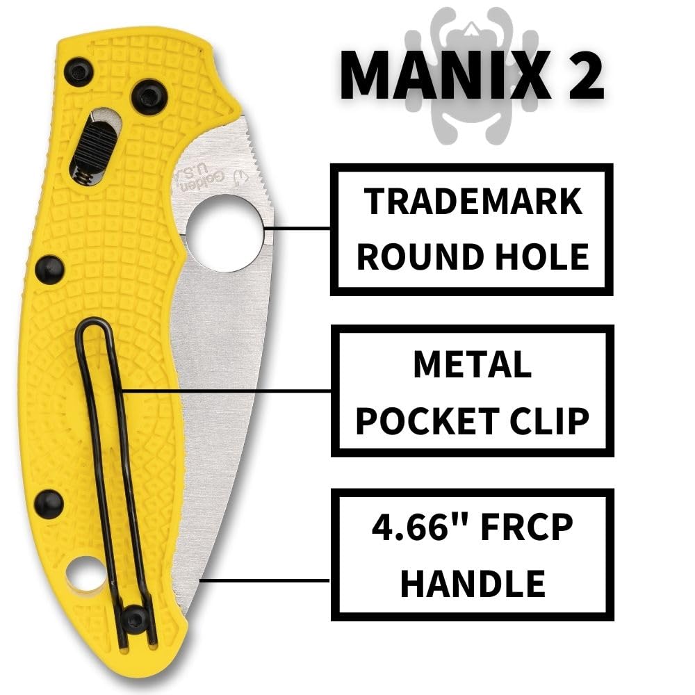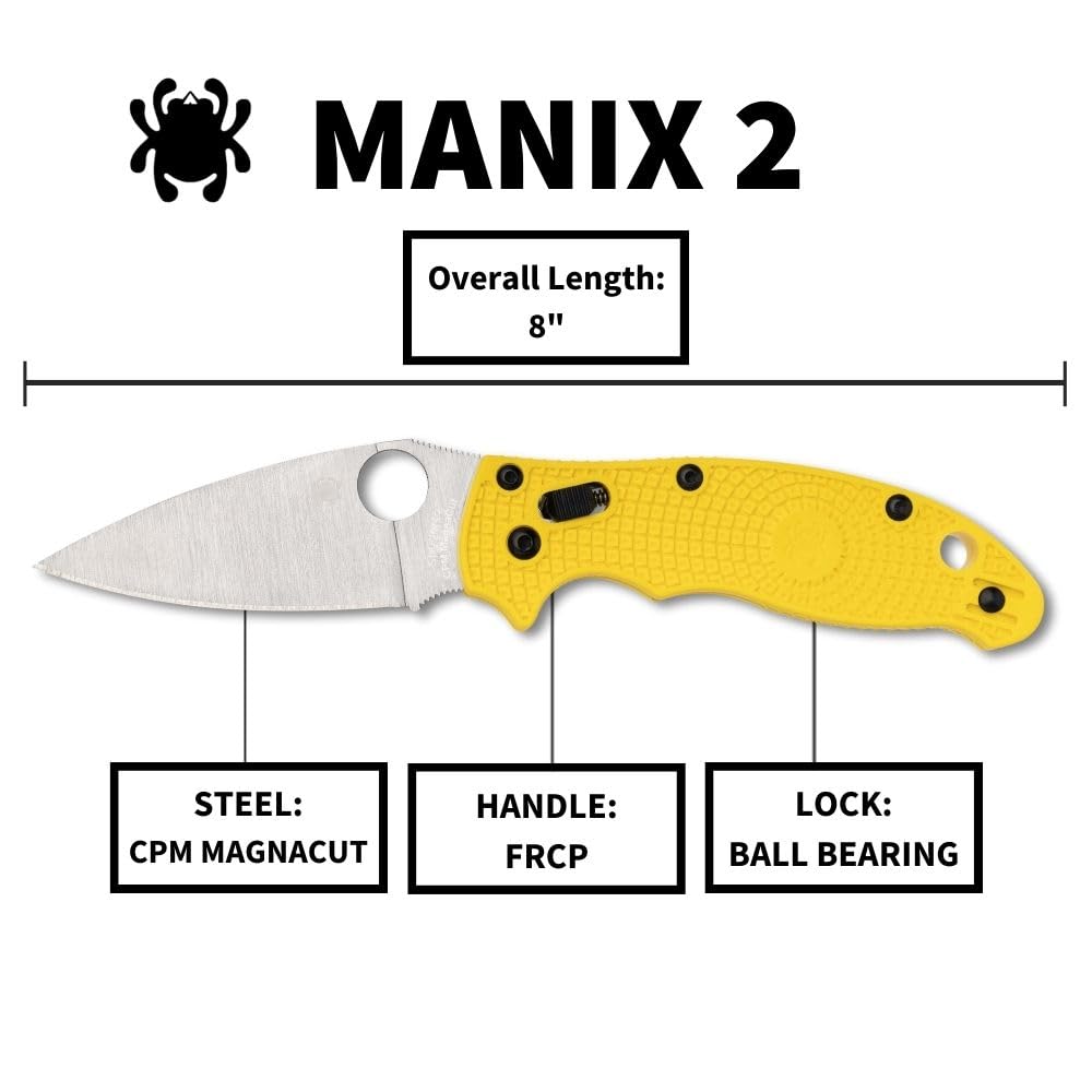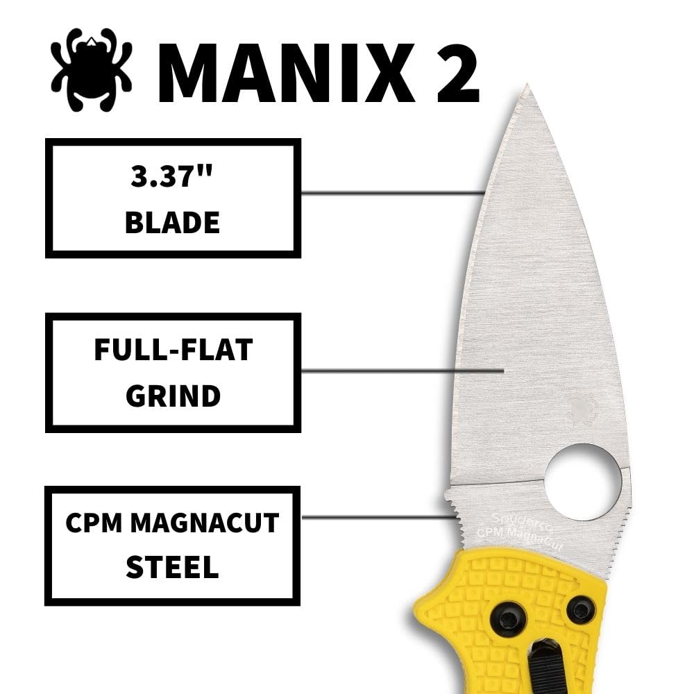 The Manix 2 Lightweight Salt proudly combines all the time-tested features of this iconic design with a full-flat-ground CPM MagnaCut blade and ultra corrosion-resistant handle hardware. Its fiberglass reinforced co-polymer (FRCP) handle is injection molded in vibrant yellow for high visibility and includes a distinctive bi-directional texture pattern for a secure grip in wet conditions. To ensure ease of carry and completely ambidextrous operation, it features a reversible tip-up wire clip, an innovative Ball Bearing Lock, and a fully accessible round hole in the blade. Founded in 1976, Spyderco is a leading innovator in high-performance knives, known for their signature round hole and ergonomic designs. Trusted by outdoor enthusiasts, first responders, and professionals, Spyderco uses advanced materials like CPM S30V and SPY27 steel to create durable, reliable tools. With a focus on precision and innovation, Spyderco continues to set the standard for quality in the knife industry.