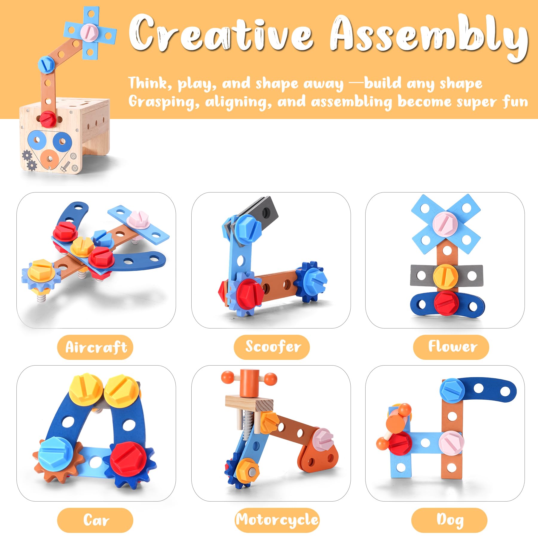 Brain Development - give your little explorer the best start with REXBETI wooden toddler play tool- the fun, interactive toy designed to spark early brain development for ages 2-5! Through fun and scientific guidance, Our assembly is very suitable for kids' brain growth. Kids can start with freeform assembly to practice twisting, turning, and screwing motions. Then, guided by the instructions, they can progress from building simple shapes like cars and cats to more challenging models such as airplanes and motorcycles