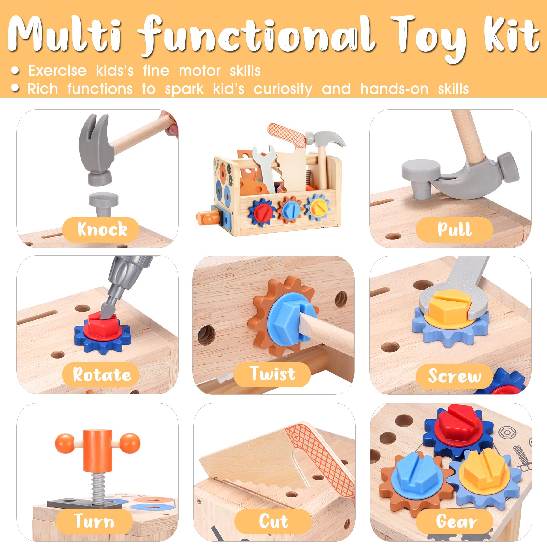Hand-eye coordination - Each parts of REXBETI wooden toy set designed to the optimal size for kids' hands. This set incorporate various functions like hammering, prying, rotating, spinning and screwing. Perfect for little hands to play with and helps develop hand-eye coordination