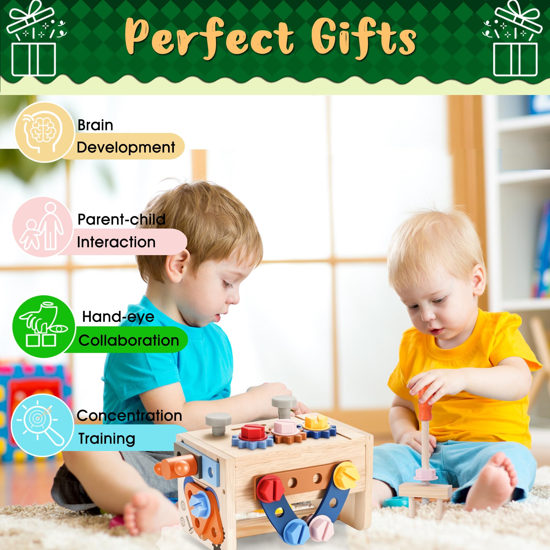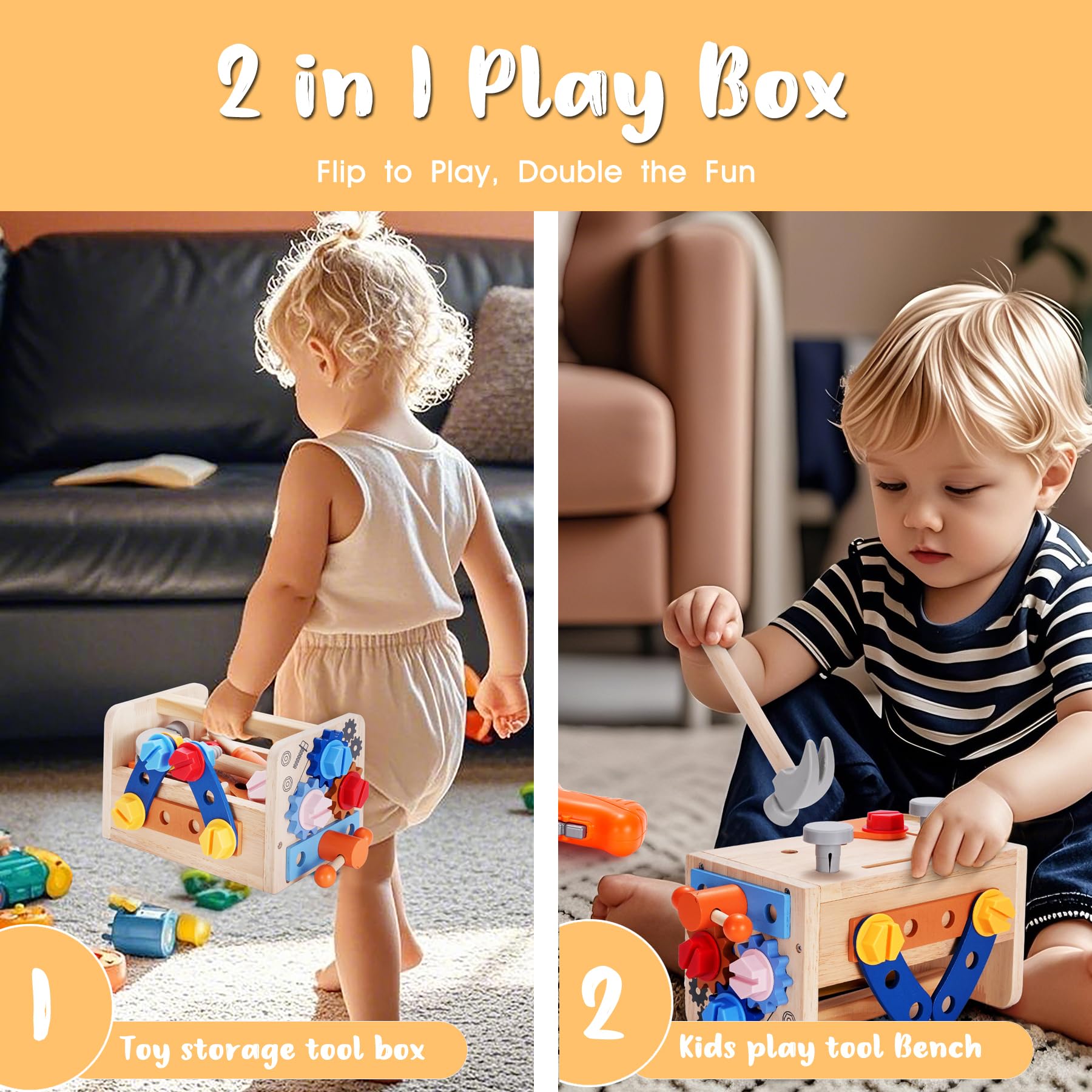 2 in 1 multifunctional toy box - One side can serve as a workbench, allowing kids to hammer, screw while the flipped-over other side is a tool storage box, encouraging kids to put all the parts away by themselves after playtime. Compact size, perfectly hold all components