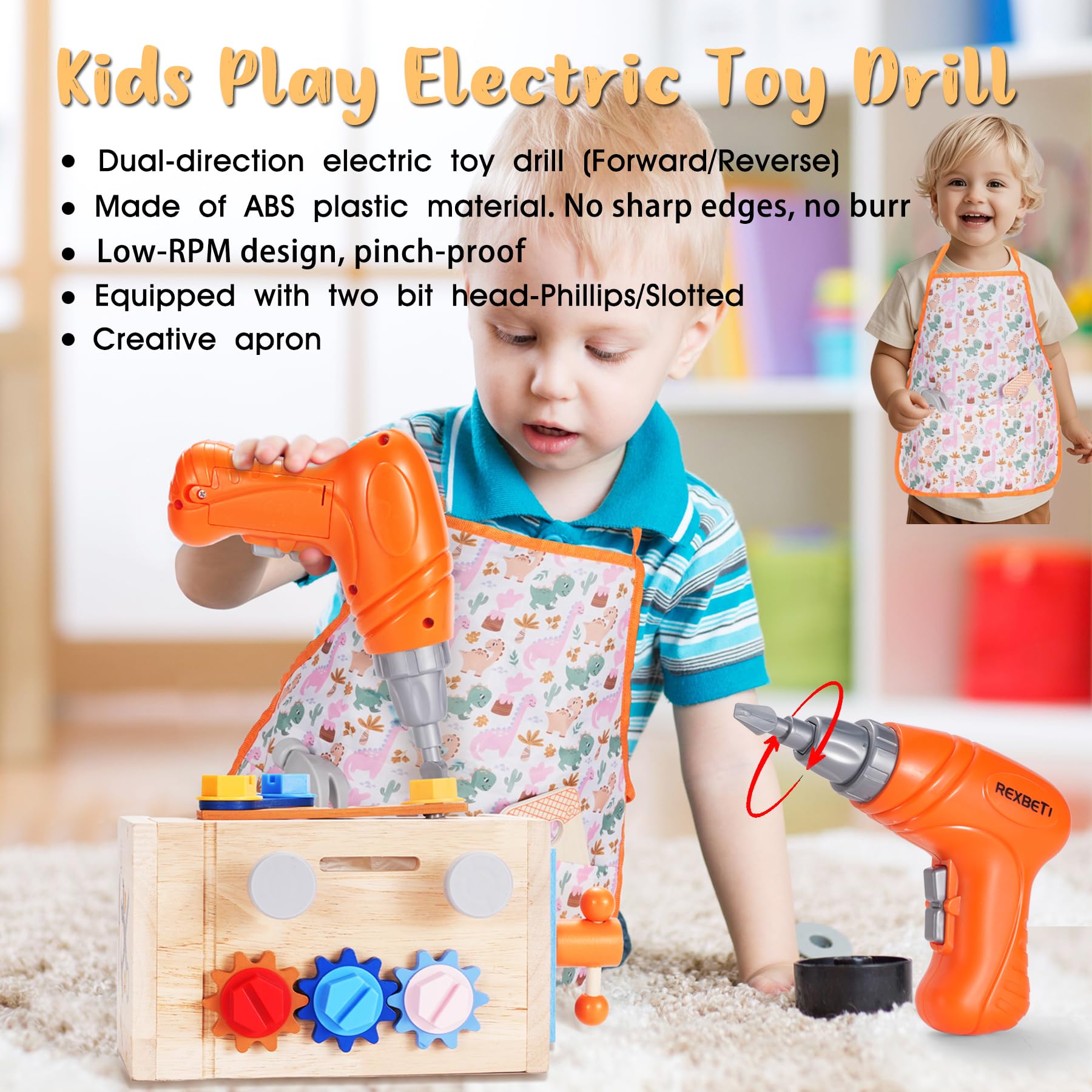 Perfect gift choice - REXBETI 43pcs wooden toddler bench not only have the tool box and basic components, it also includes a dual-direction electric drill with phillips and slotted bits, giving kids a real tool experience. It comes with an exclusively designed creative apron, allowing kids to role-play as little carpenters. And the set includes a pack of 50 cartoon tool stickers—perfect for kids who love playing with stickers. This set makes an excellent gift for Christmas and birthdays