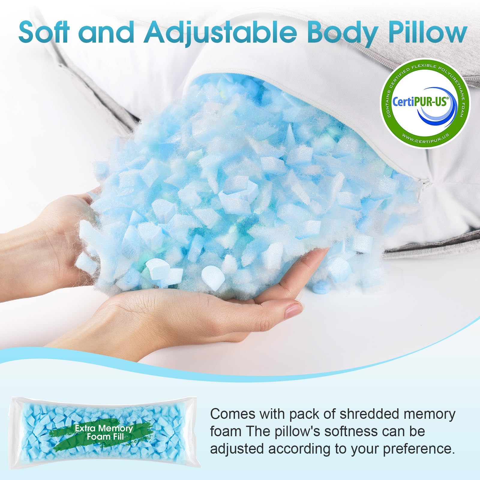 Adjustable Firmness with Extra Foam Fill: Our body pillow is filled with shredded memory foam to enhance your comfort with a 200g memory foam refill pack. Easily adjust the fullness to suit your preferences—whether you prefer a softer or firmer feel