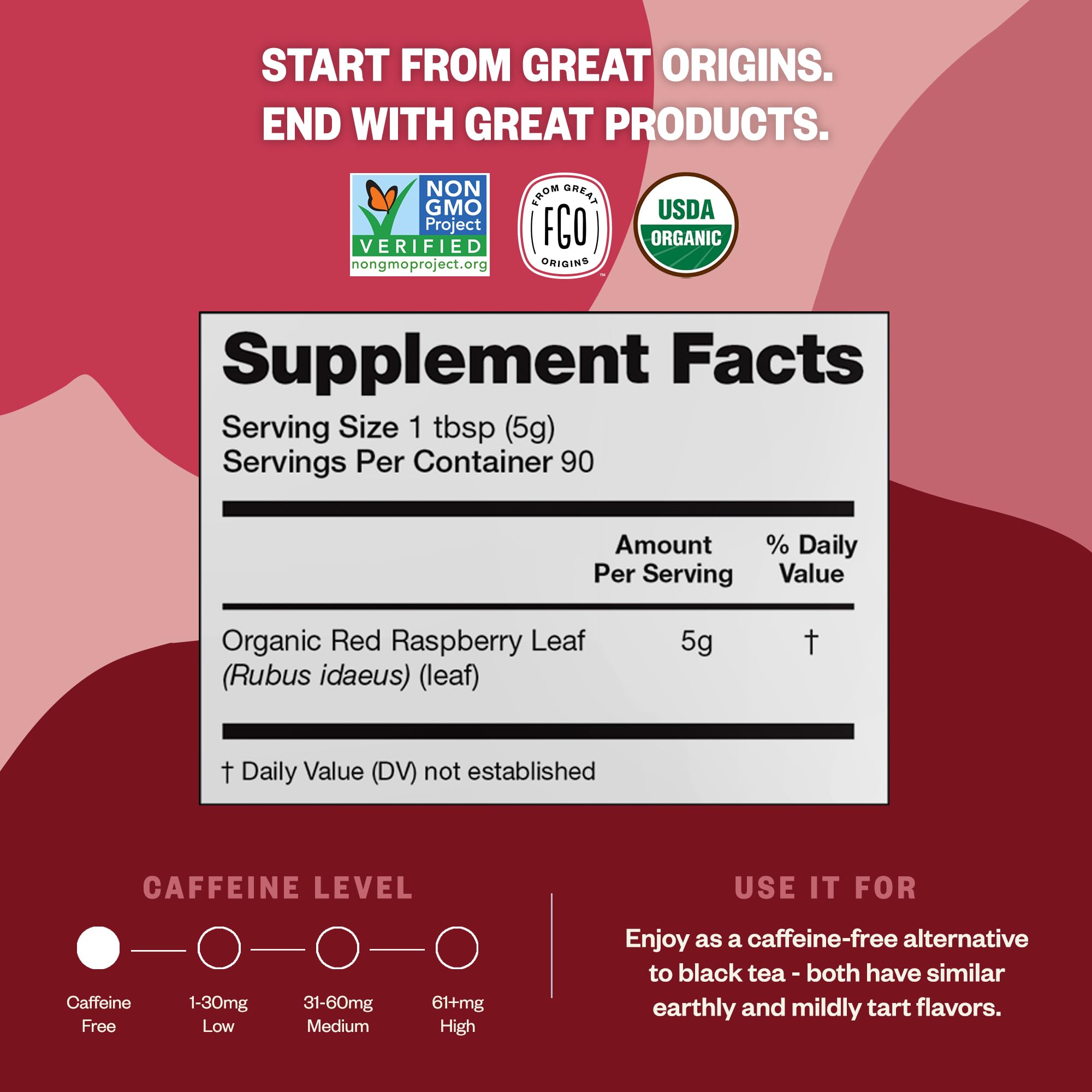 HEALTHY & DELICIOUS - Though known for its sweet and tangy berries, the leaves of the raspberry plant produce a light and refreshing herbal tea. Our organic raspberry leaf tea produces a smooth and mild flavor similar to black tea, but without the caffeine! Add a bit of honey or sugar for a sweeter sip.