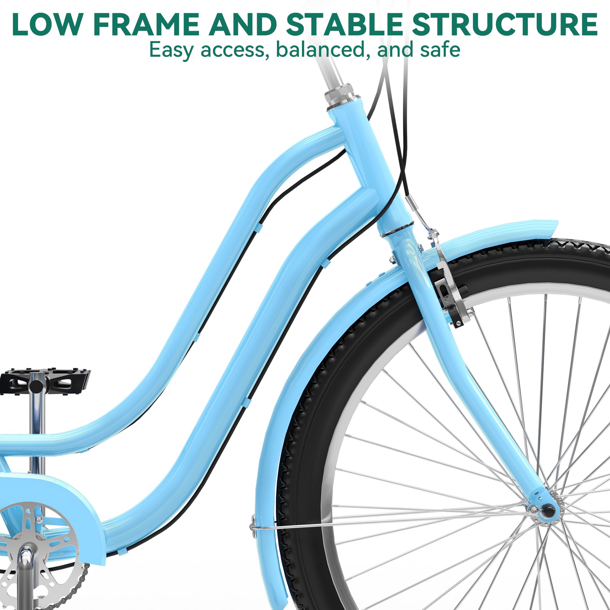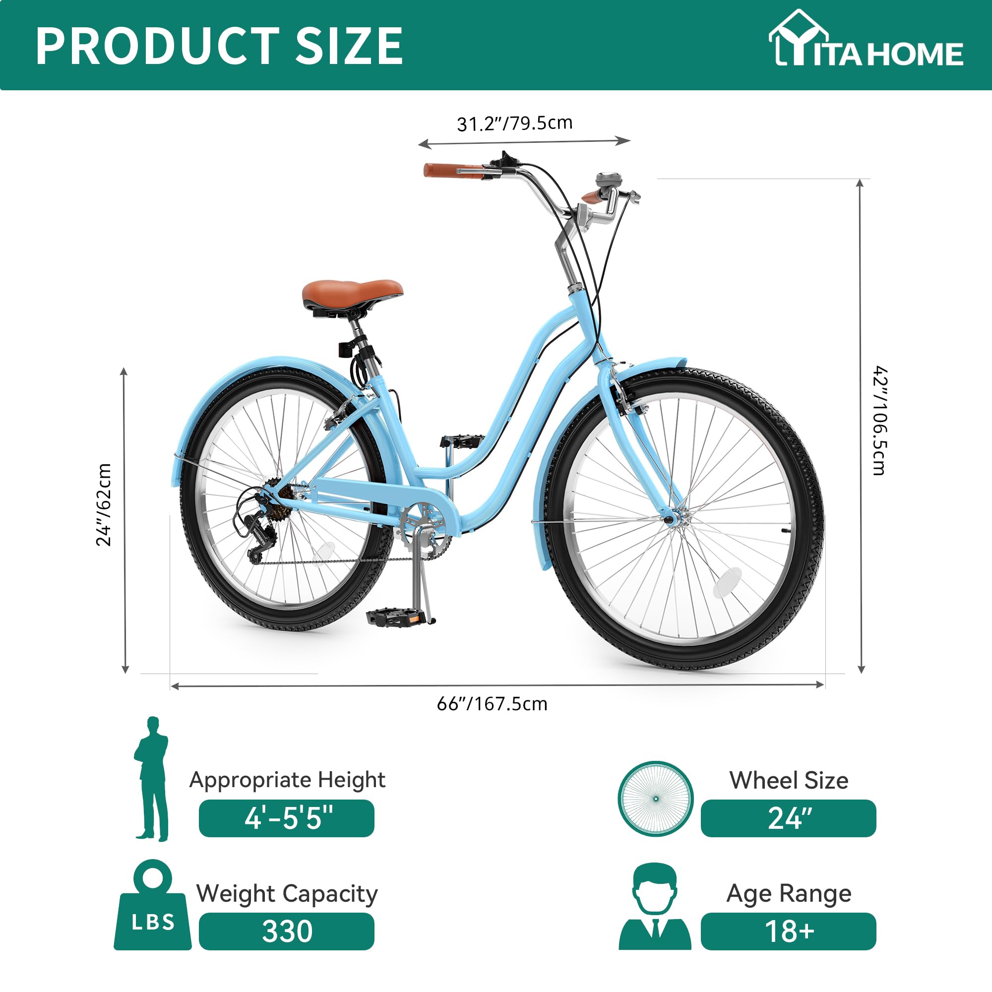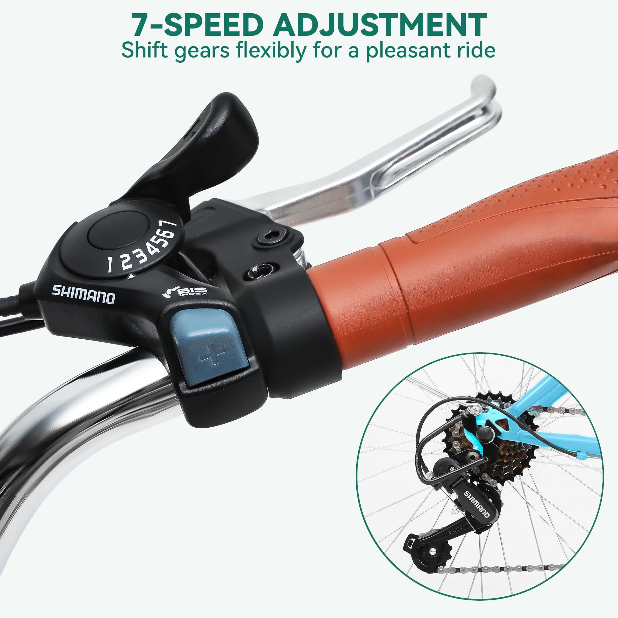 7-Speed Shifts: Enjoy a smooth ride on any terrain with our 24 26-inch beach cruiser bike featuring a 7-speed shifter; It allows for effortless resistance and speed adjustment to match various road conditions, making your ride more enjoyable and less strenuous