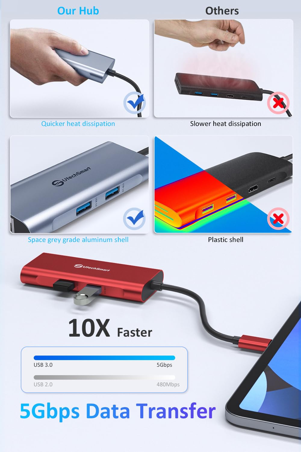 【Cost-Effective】 UtechSmart USB C Hub has a 1000M Ethernet port, a 4K HDMI port, 3 USB 3.0 up to 5 Gbps and a USB C charging port with 100W power delivery to make a perfect all-in-one solution for your connectivity needs.