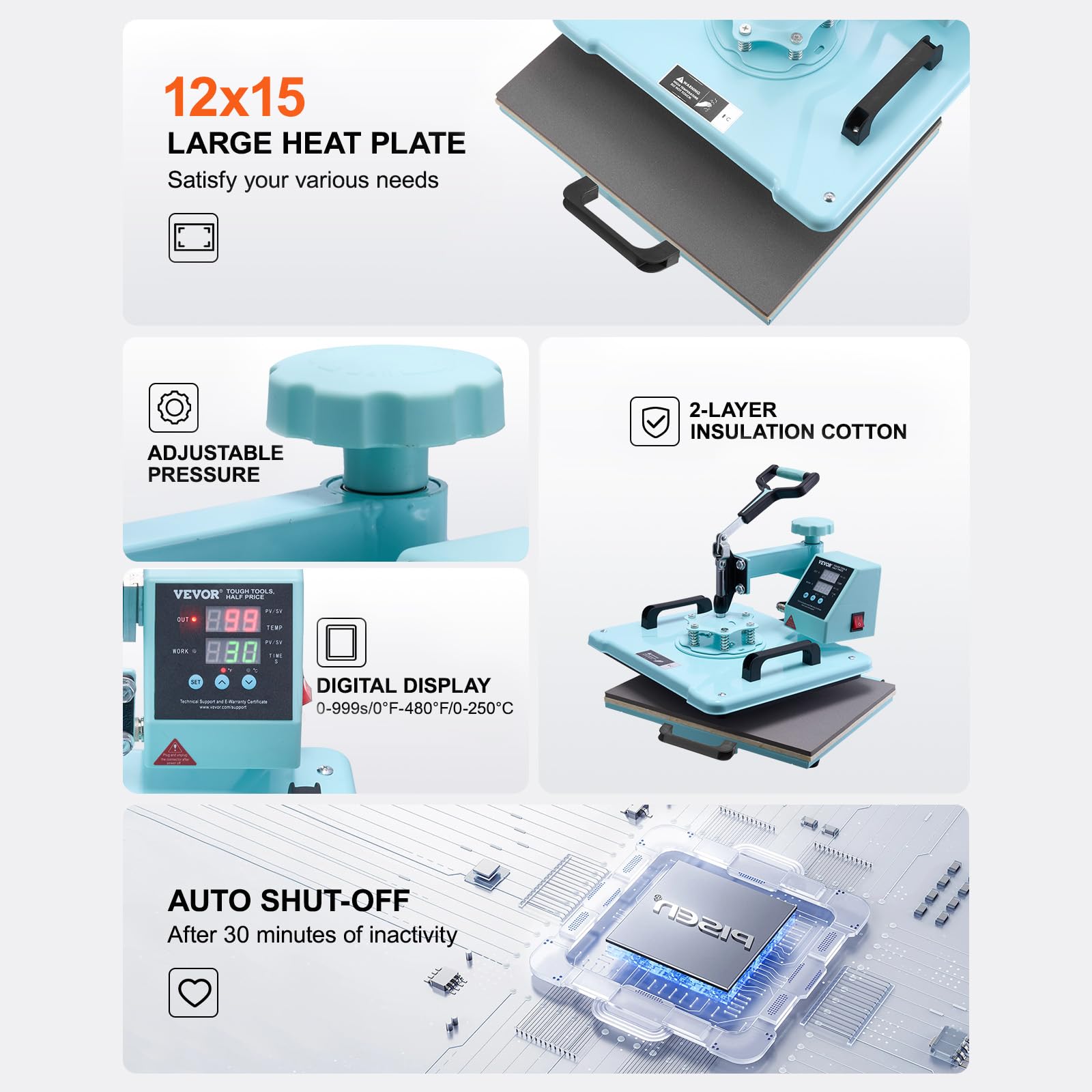 Precise Digital Control: You can preset the temperature and time according to different transfer materials to achieve satisfactory results. Temperature range: 32-480℉ / 0-250℃, time range: 0-999s. You can switch between °C and °F with the (▲/▼) buttons to select your desired temperature display mode. When the preset temperature is reached, the heat transfer machine will automatically stop and sound an alarm, preventing over-heating.