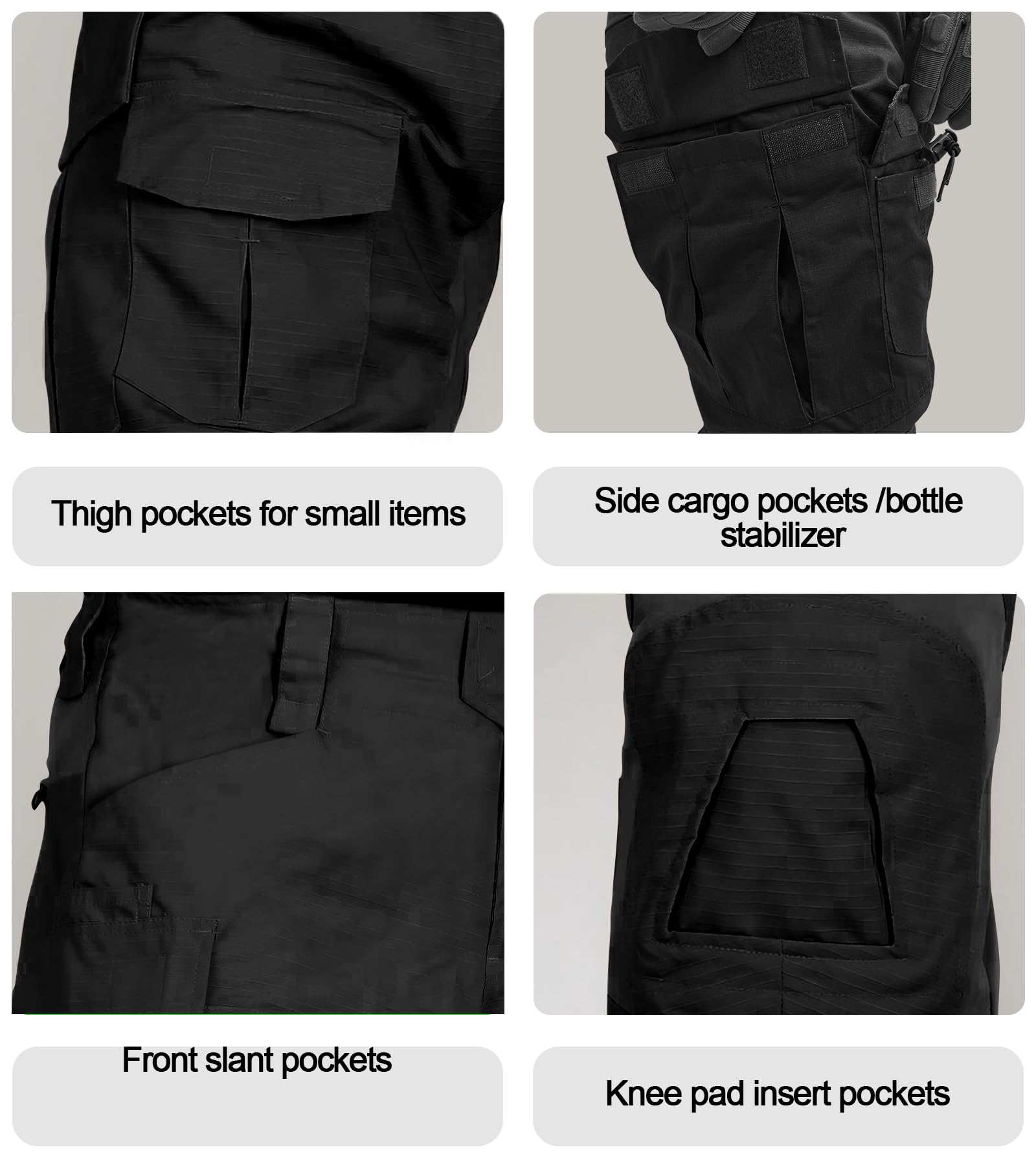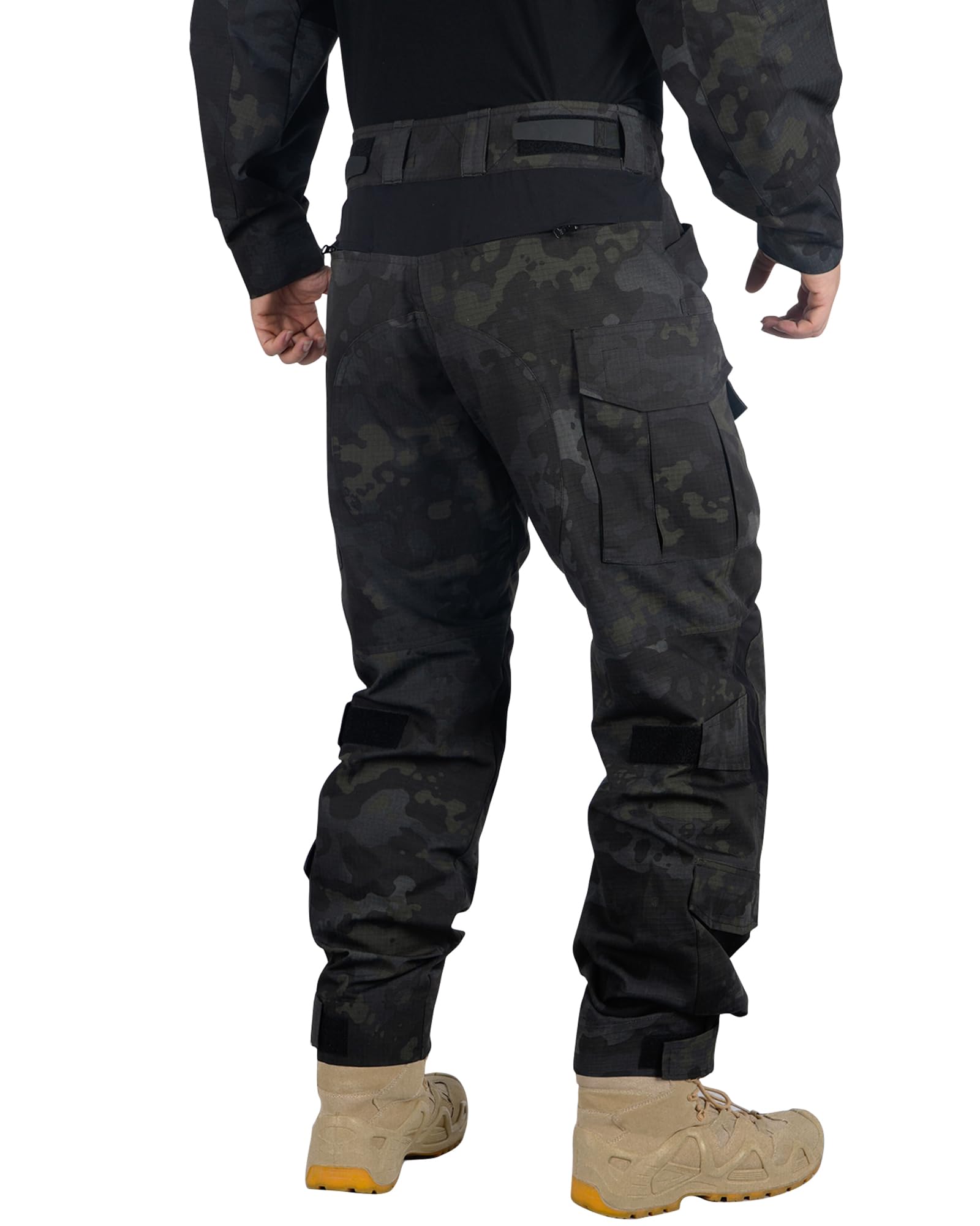 Multi pocket cargo pants for men: The camo pants men are with 10 pockets for tactical tools and self items. Including 2 front slant pockets; 2 thigh pockets; 2 side leg pockets; 2 side calf pockets; 2 zipper rear pockets.There are three hook and loop panels sewn onto the knee pad pockets top and sides which attach to the hook and loop material inside to pant legs which drastically helps prevent the knee pad blowing out