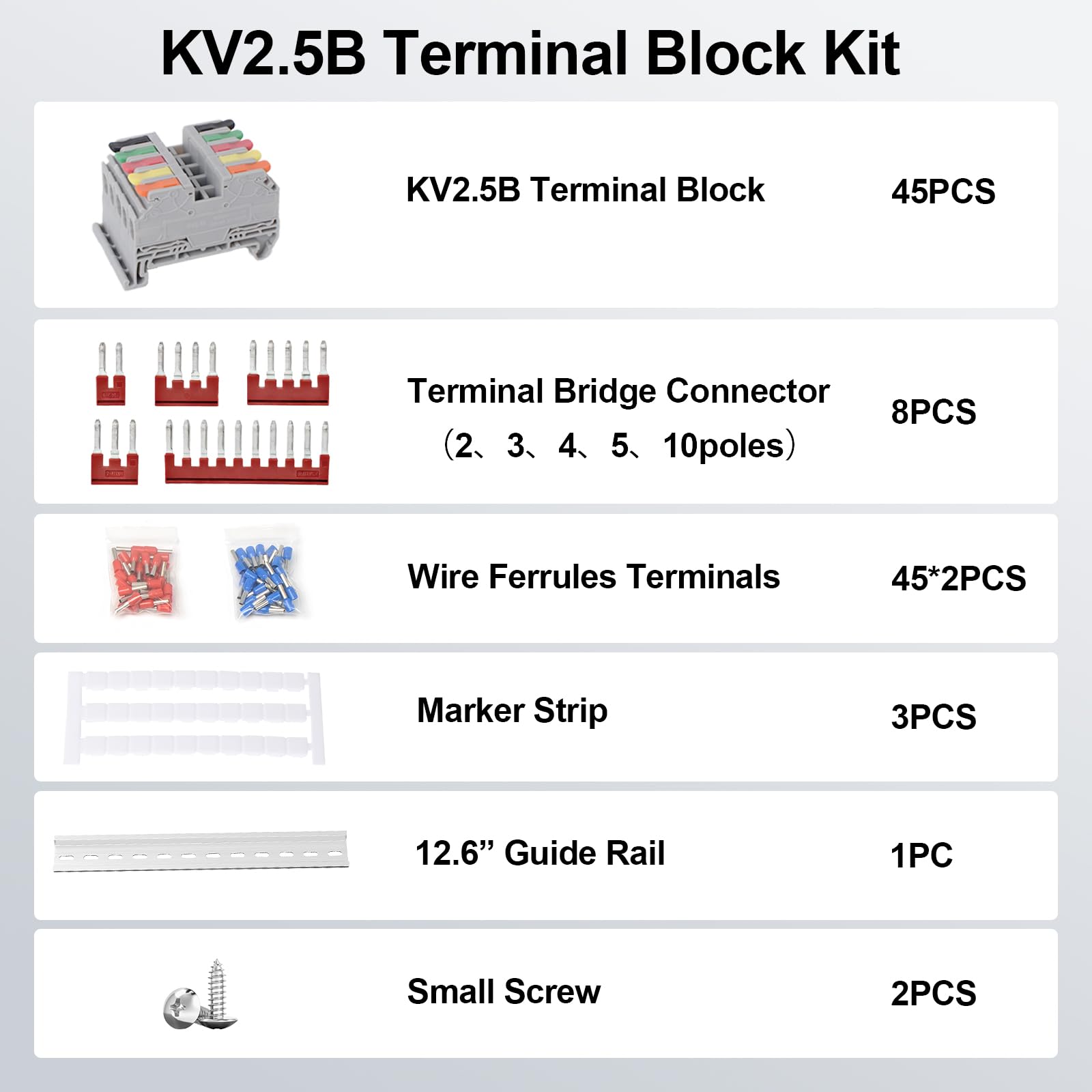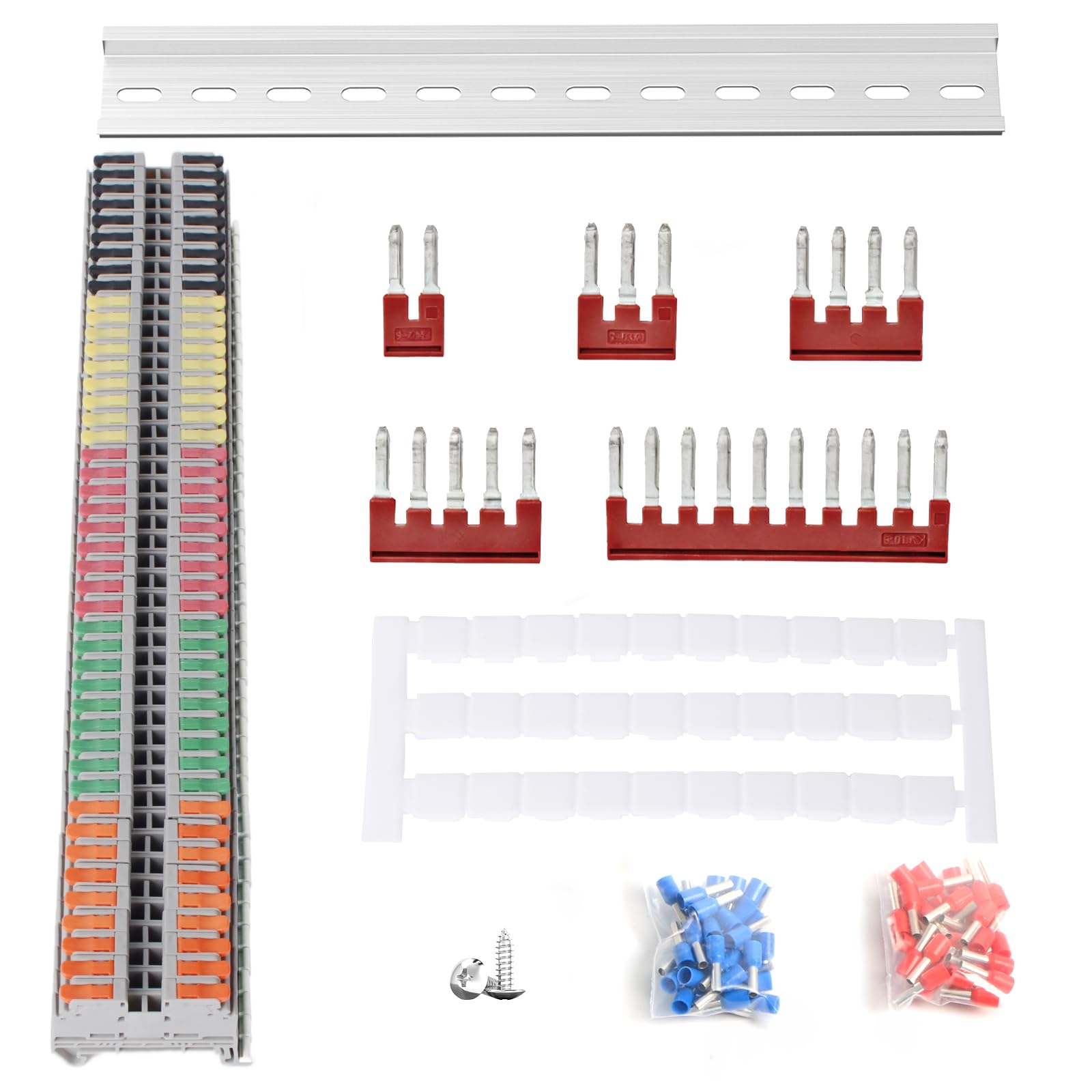 Complete & Comprehensive Kit: Includes 45 KV2.5B terminal blocks (9 each of orange, yellow, red, green, and black), 8 terminal bridge connector (two each of 2-pin, 3-pin, and 4-pin; one each of 5-pin and 10-pin), 90 wire ferrules terminals (45 red and 45 blue), 3 marker strips, and a 12.6” long guide rail; All accessories are included in sufficient quantity