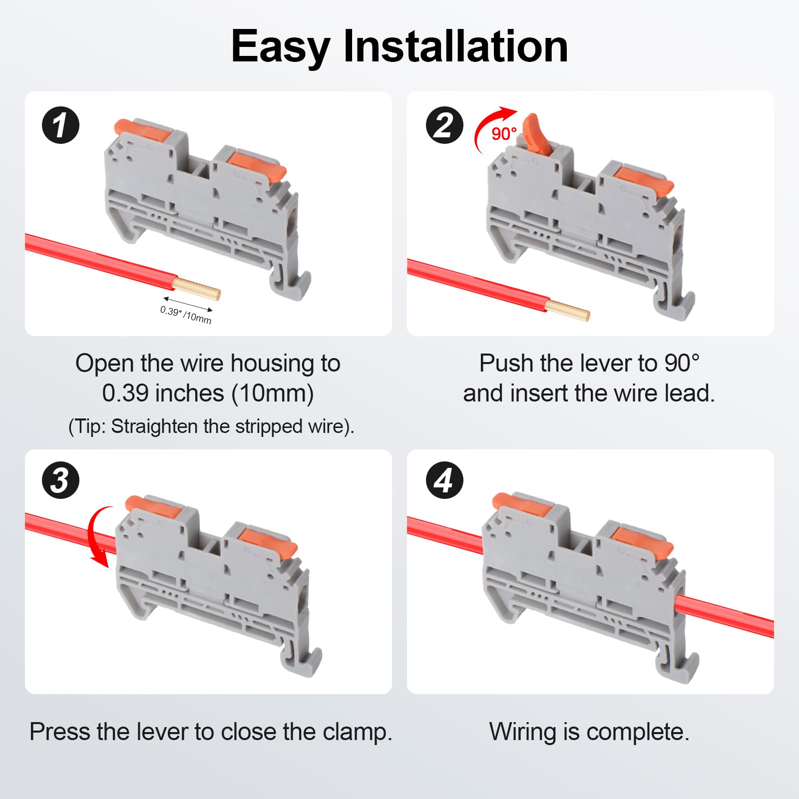 Secure & Simple Connection: No screwdriver needed; Pull up the Levers, strip the wire, insert the ferrule terminal, crimp, and insert the wire into the terminal; Press down the Lever to complete the connection; The terminal firmly grips the rail, and the Lever securely clamps the wire