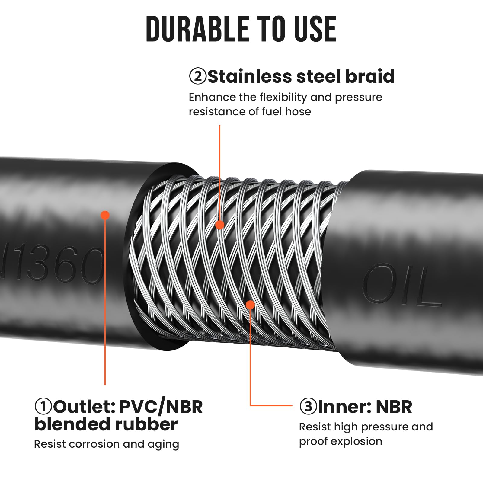 DURABLE & FLEXIBLE: The 3/4 fuel hose is made of NBR which is resistant to corrosion and wear, effectively realizing anti-aging and anti-hardening, extending the service life of the hose. The textile mesh embedded in the hose ensures the flexibility and pressure resistance of the fuel hose.