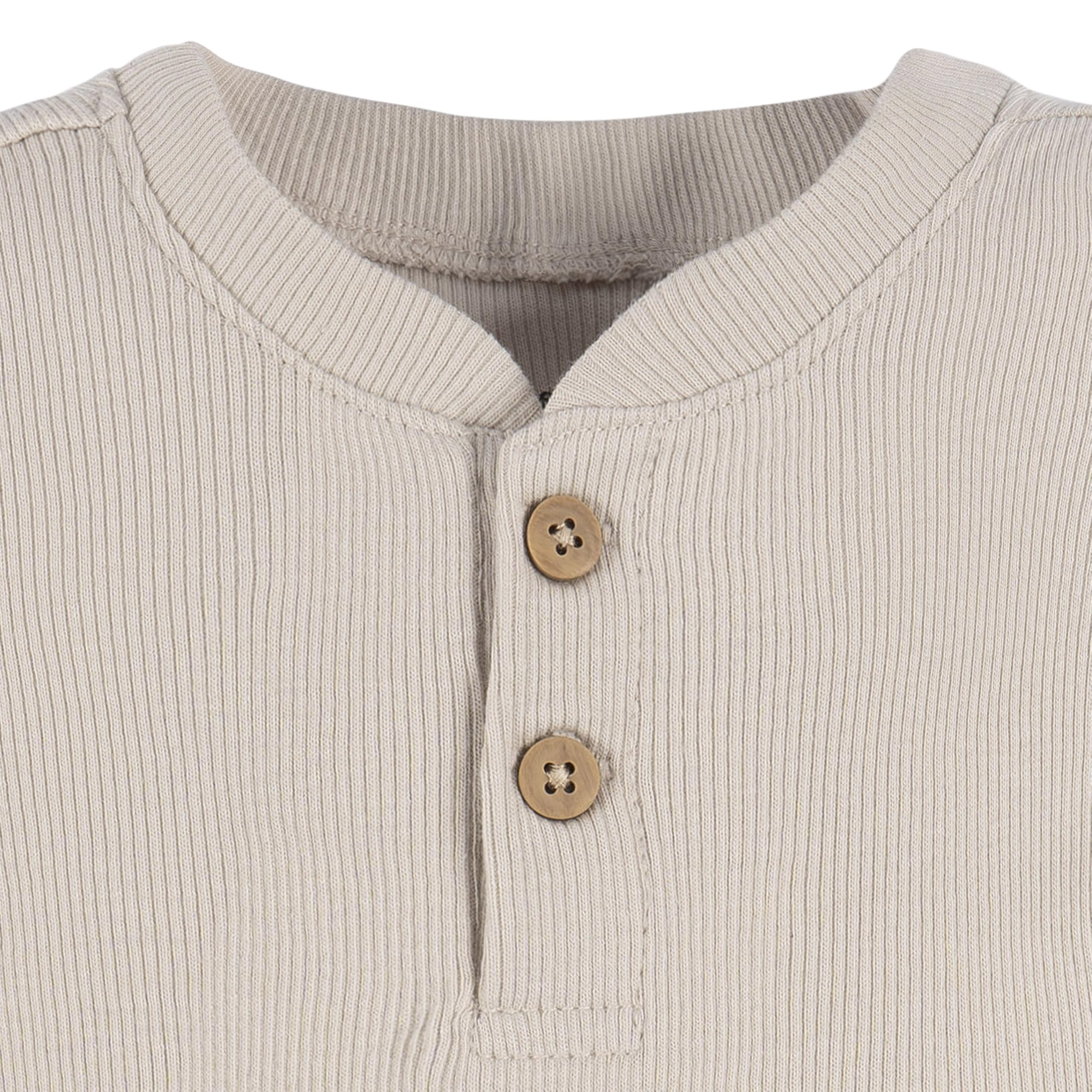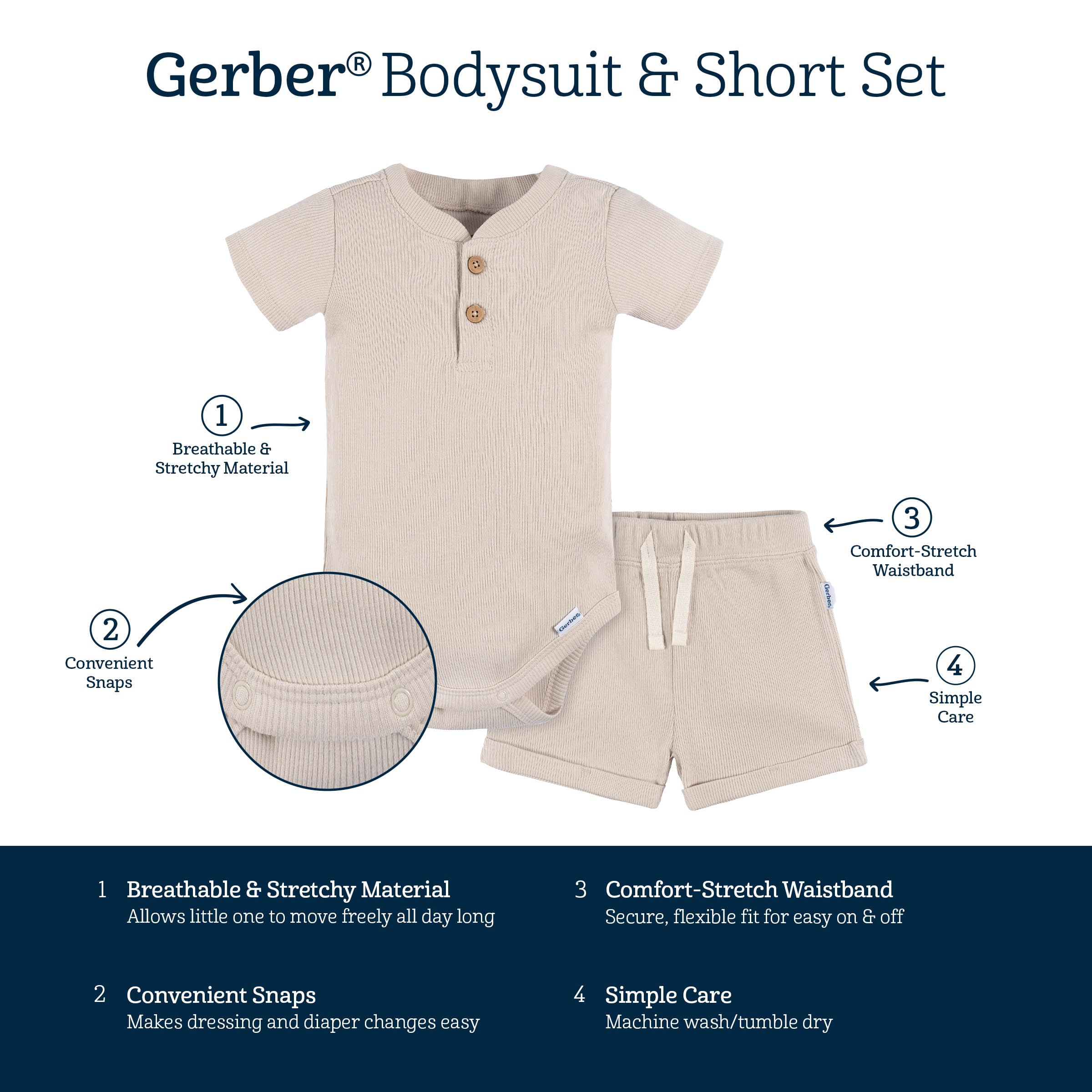 Description Keep your little one comfy and stylish with this baby boy bodysuit and shorts set, crafted from 100% cotton for a gentle touch on sensitive skin. The bodysuit features convenient leg snaps for quick and easy diaper changes, while vertical ribbing provides a natural stretch for all-day comfort. The matching shorts come with a comfort-stretch waistband, ensuring a secure fit as your baby moves and plays. Thoughtful details like faux wood buttons on the bodysuit and a faux drawstring on the shorts add a charming touch to this everyday outfit.