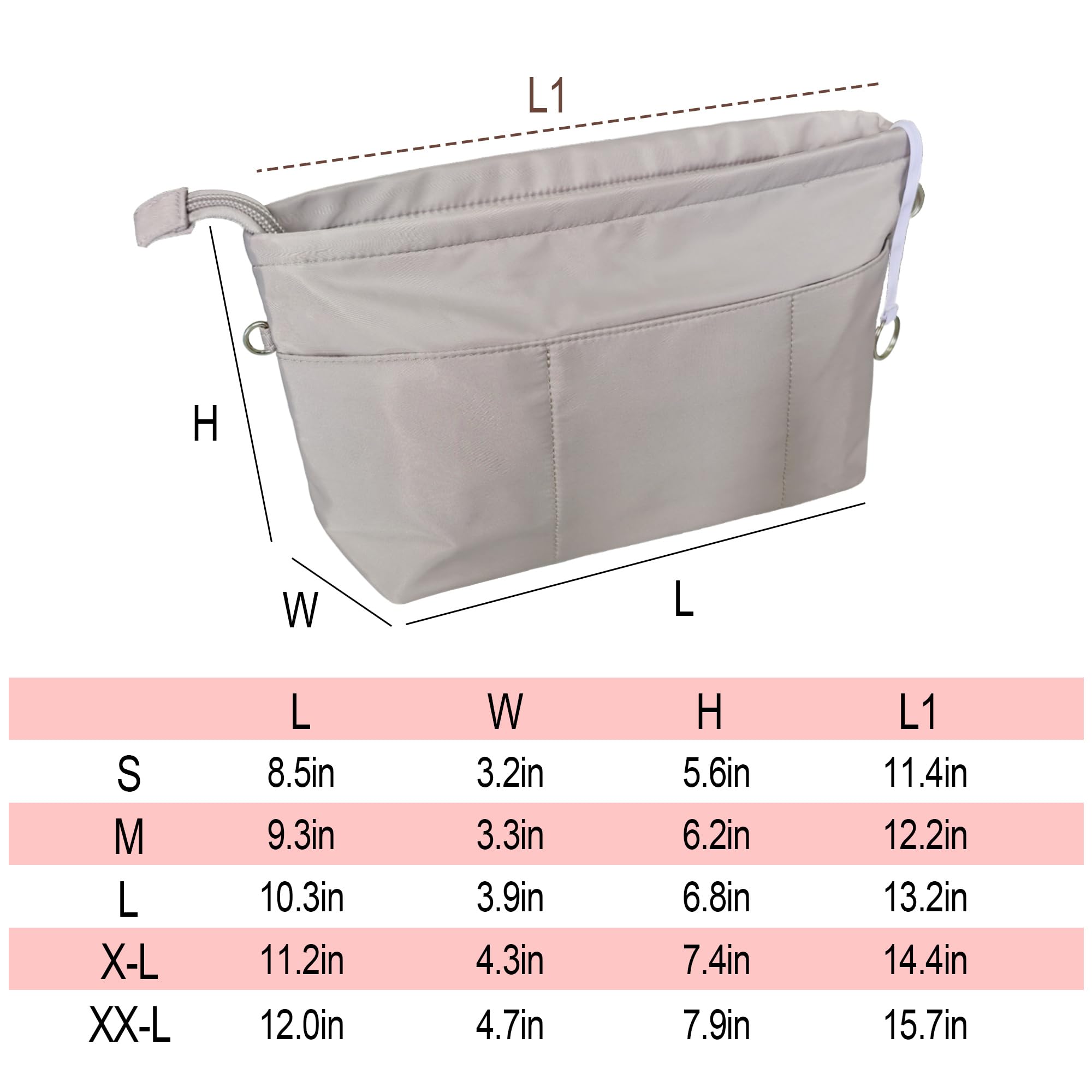 Dimension(Length*Width*Height)(Upper Length): Small 8.5"*3.2"*5.6"(11.4"); Medium 9.3"*3.2"*6.2"(12.2"); Large 10.3"*3.9"*6.8"(13.2"); X-Large 11.2"*4.3"*7.4"(14.4"); XX-Large 12"*4.7"*7.9"(15.7"). Measure your purse before the purchase, make sure you get the perfectly fit one.