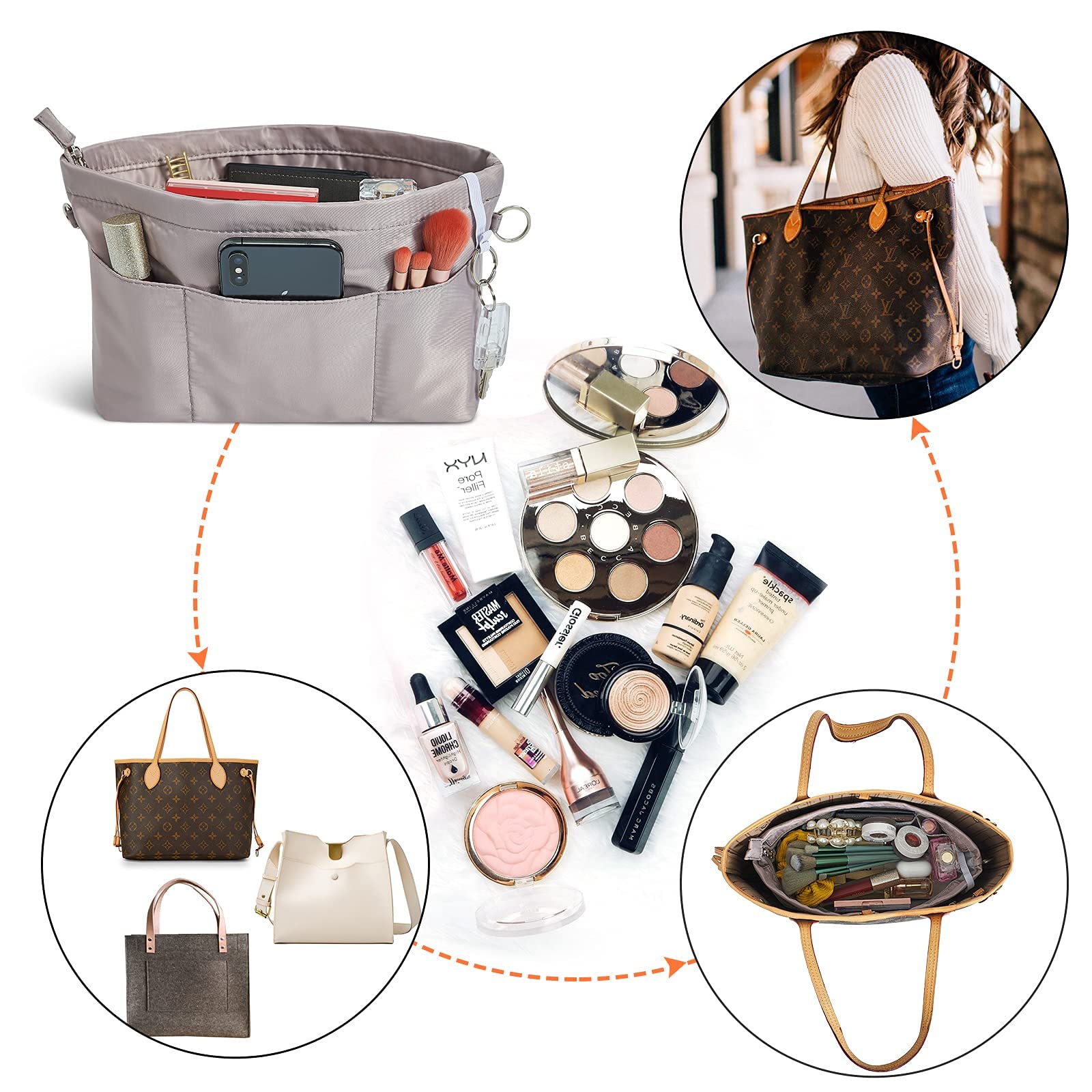 Stay upright even when it is empty, could stand on its own. Foldable to store, save space. Help you organize your dialy essentials like keys, wallet, makeups, cards, snacks, etc. Keep items in orderly manner, transfer from one handbag to another in seconds. Great companion for your purses. Simplify your daily life.