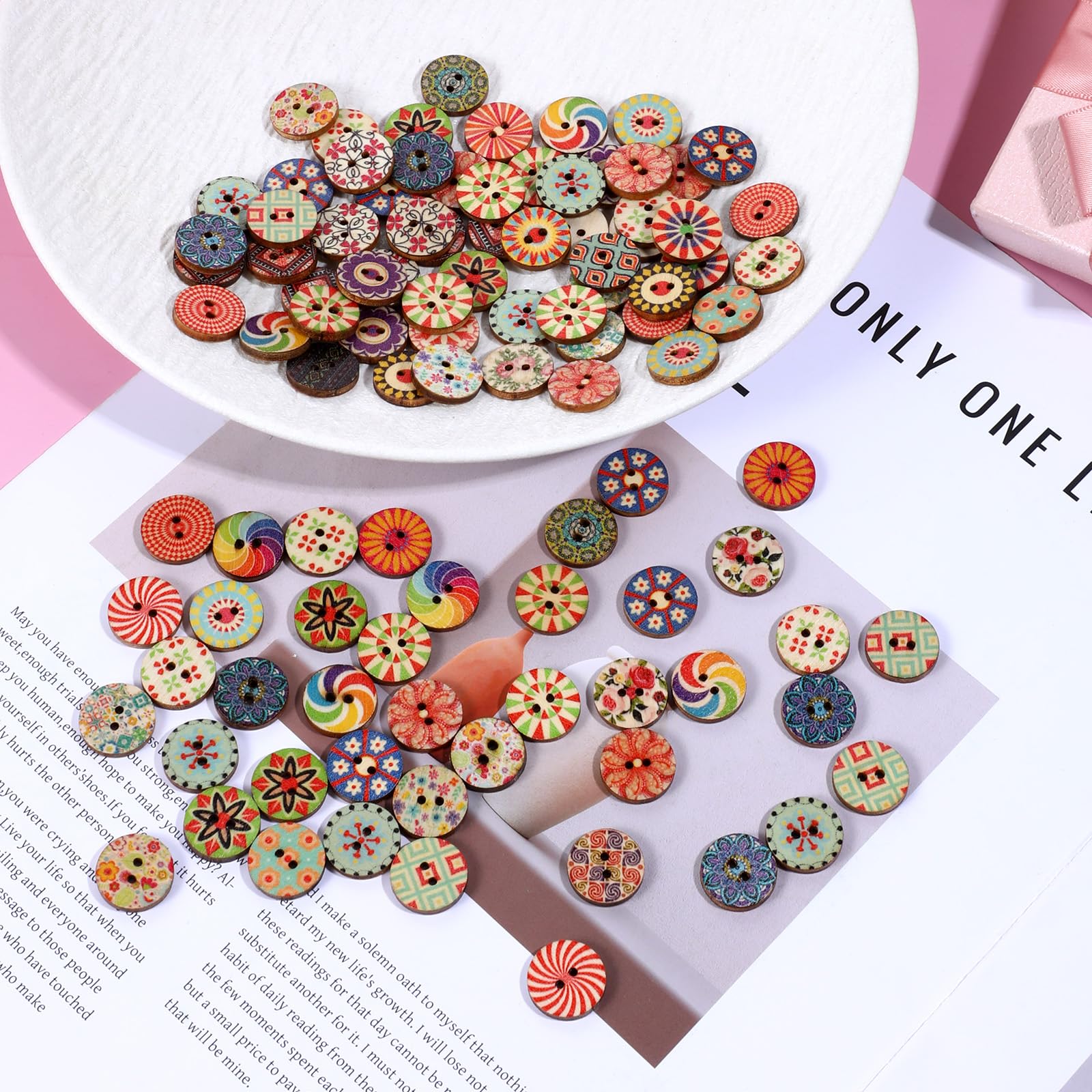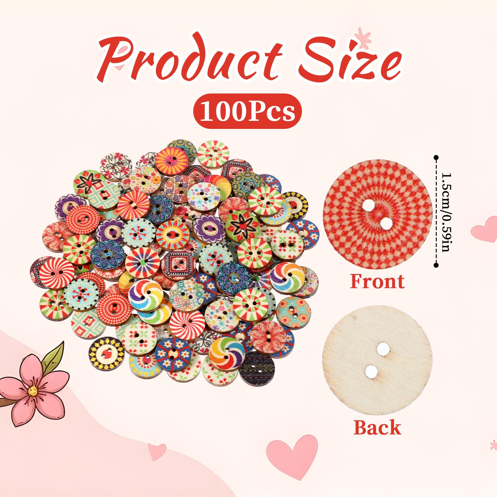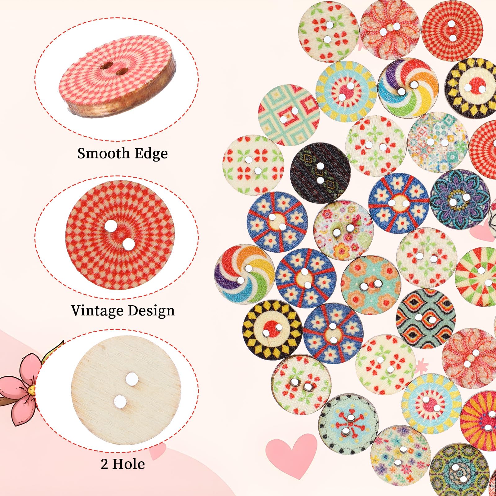 【Complete Package】Each package includes 100 pieces of 1.5 cm two-hole wooden buttons, giving you ample freedom to mix and match according to your preferences. With their high-quality material, vintage floral patterns, and practical size, these buttons are the ideal choice for enhancing the beauty of your fabric, clothing, and various DIY projects.