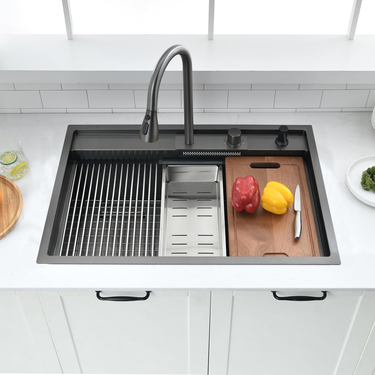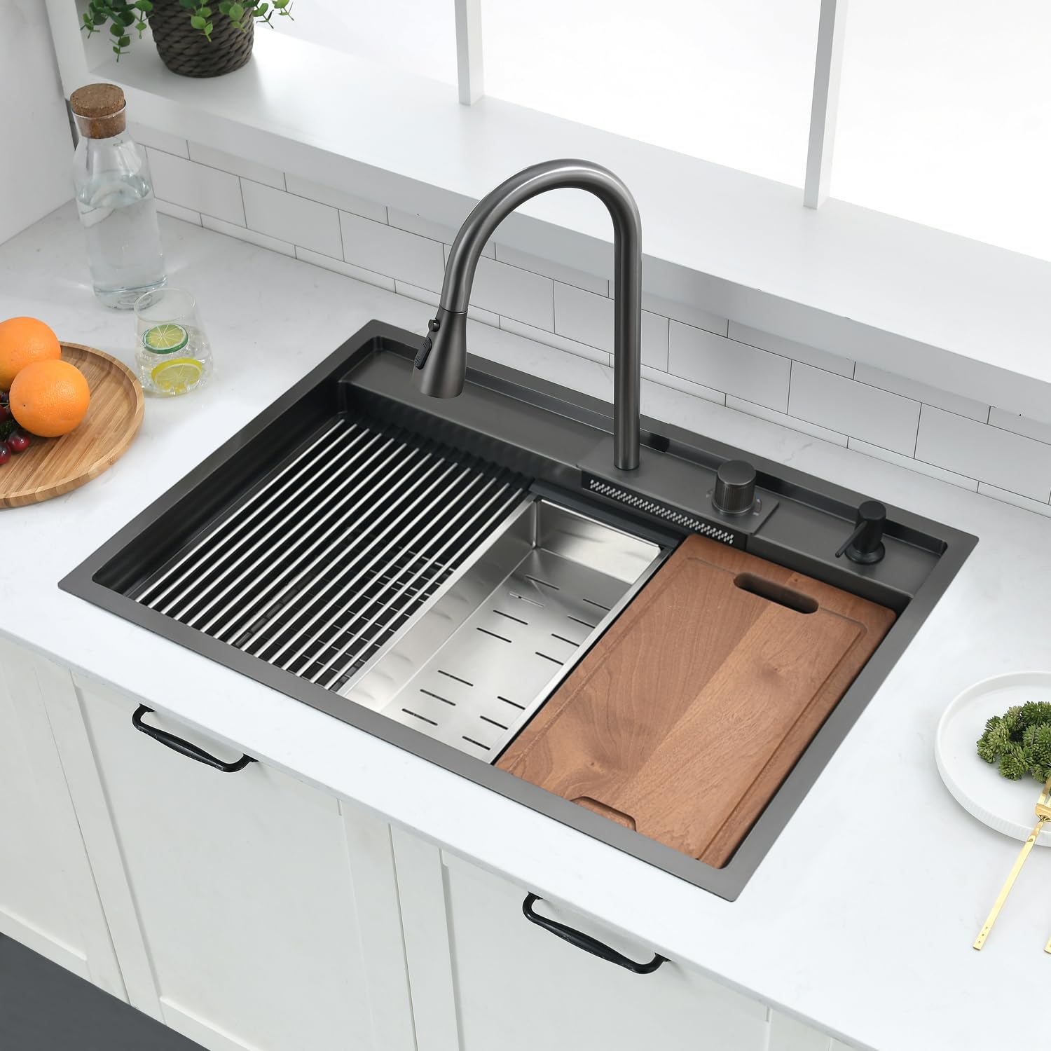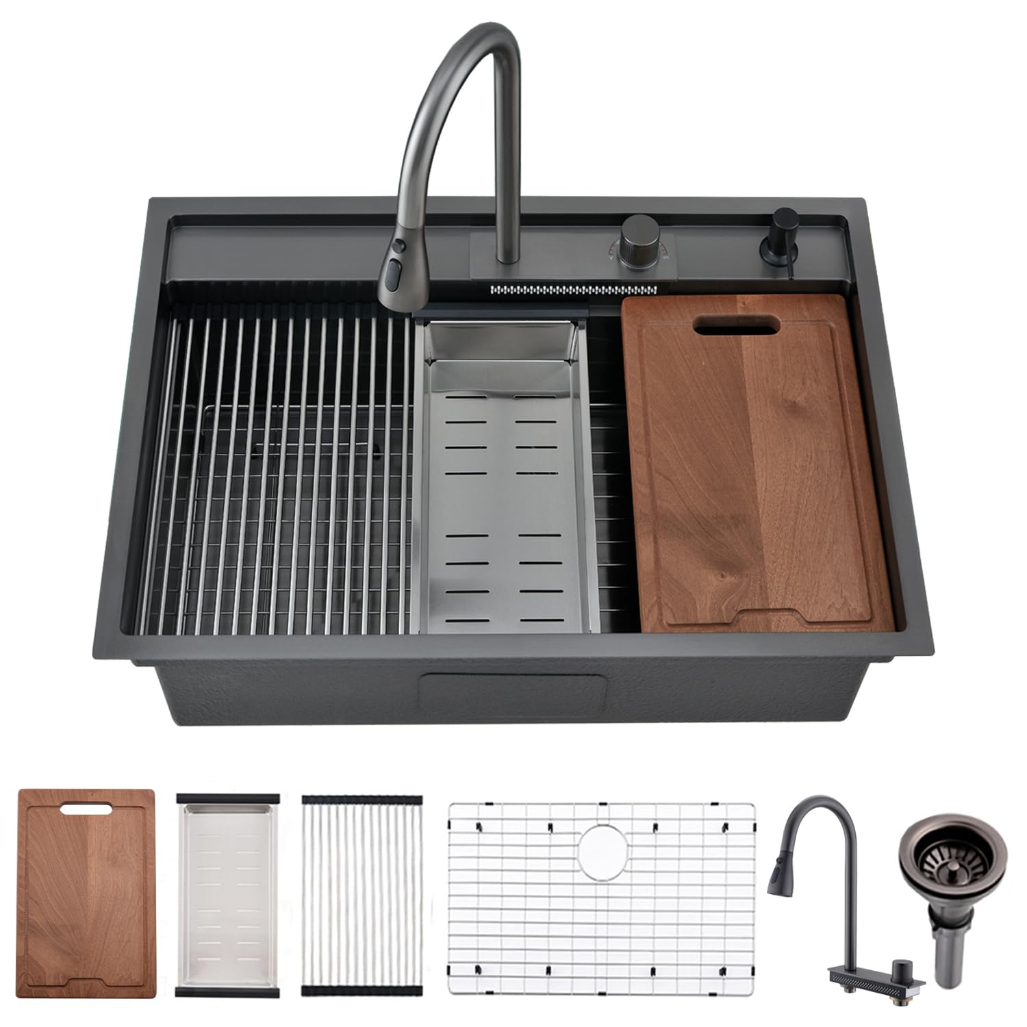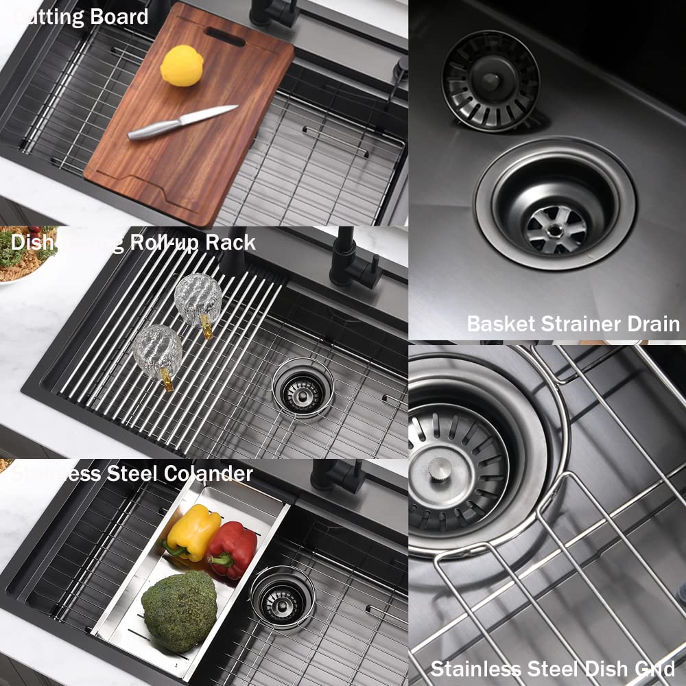 【16-Gauge Stainless Steel & T304 Construction】: Drop in Kitchen Sink Workstation Black This high class T-304 grade stainless steel sinks are made with heavy 16-gauge stainless steel, Outer layer spraying with nano PVD technology, which is with high strength, wear resistance, heat dissipation, easy to clean and use long-lasting.