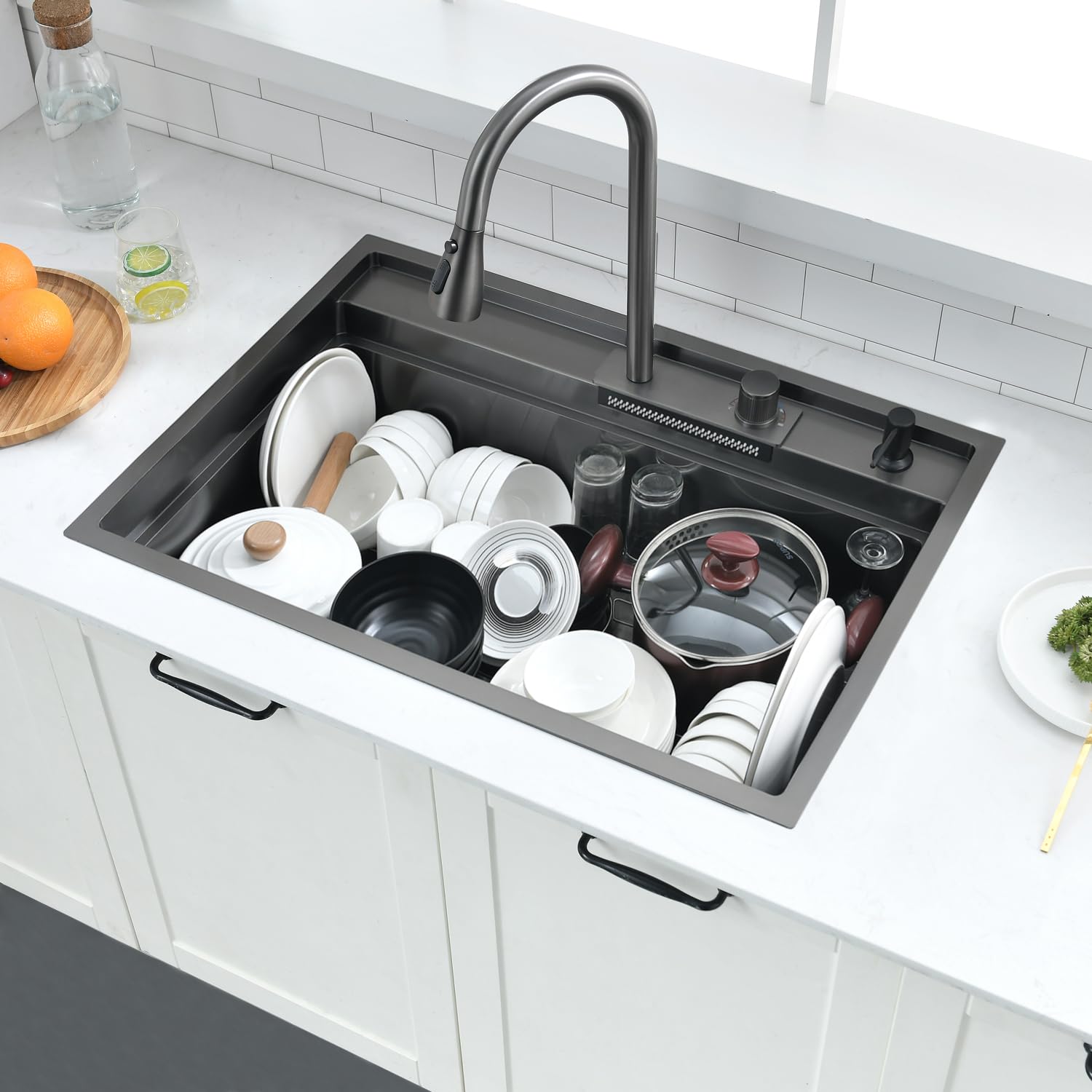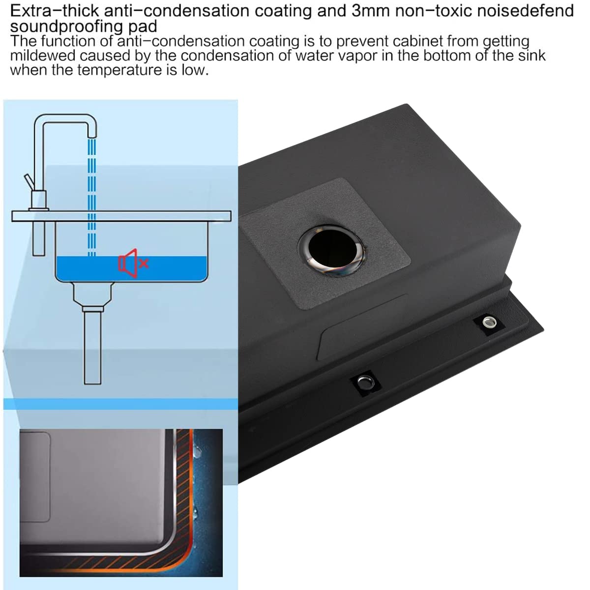 【Noise Cessation & Moisture Barrier】: drop in kitchen sink waterfall Use 3mm sound guard undercoating and thick rubber padding,Ultra quiet designs with thicker & softer Rubber Noise Reduction Pads. and the anti-condensation coating prevents water droplets from condensing and preventing moisture in the cabinet,absorb sound from the source, and isolate condensate.